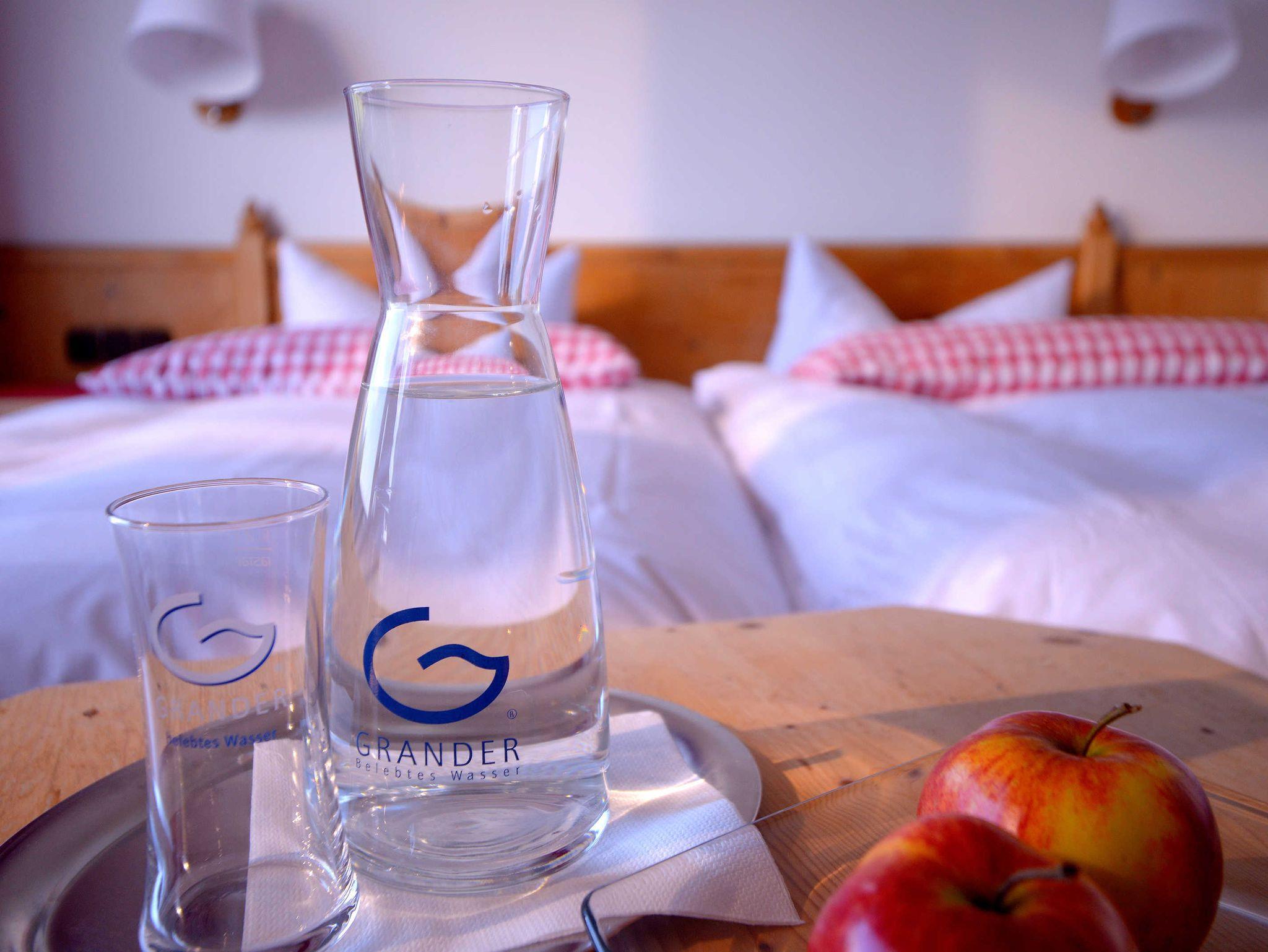 Doppelzimmer mit Bergblick,Fußboden mit Naturholz-Dielen, Deckbetten 155 x 220 cm, Bettwäsche und Handtücher in BIO Cotton, Dusche und WC, Lotion und Shampoon Speick Thermal. Wasserkocher, Föhn und Bademantel