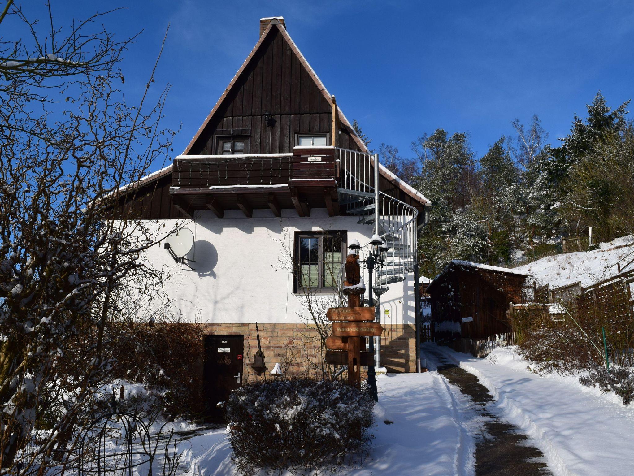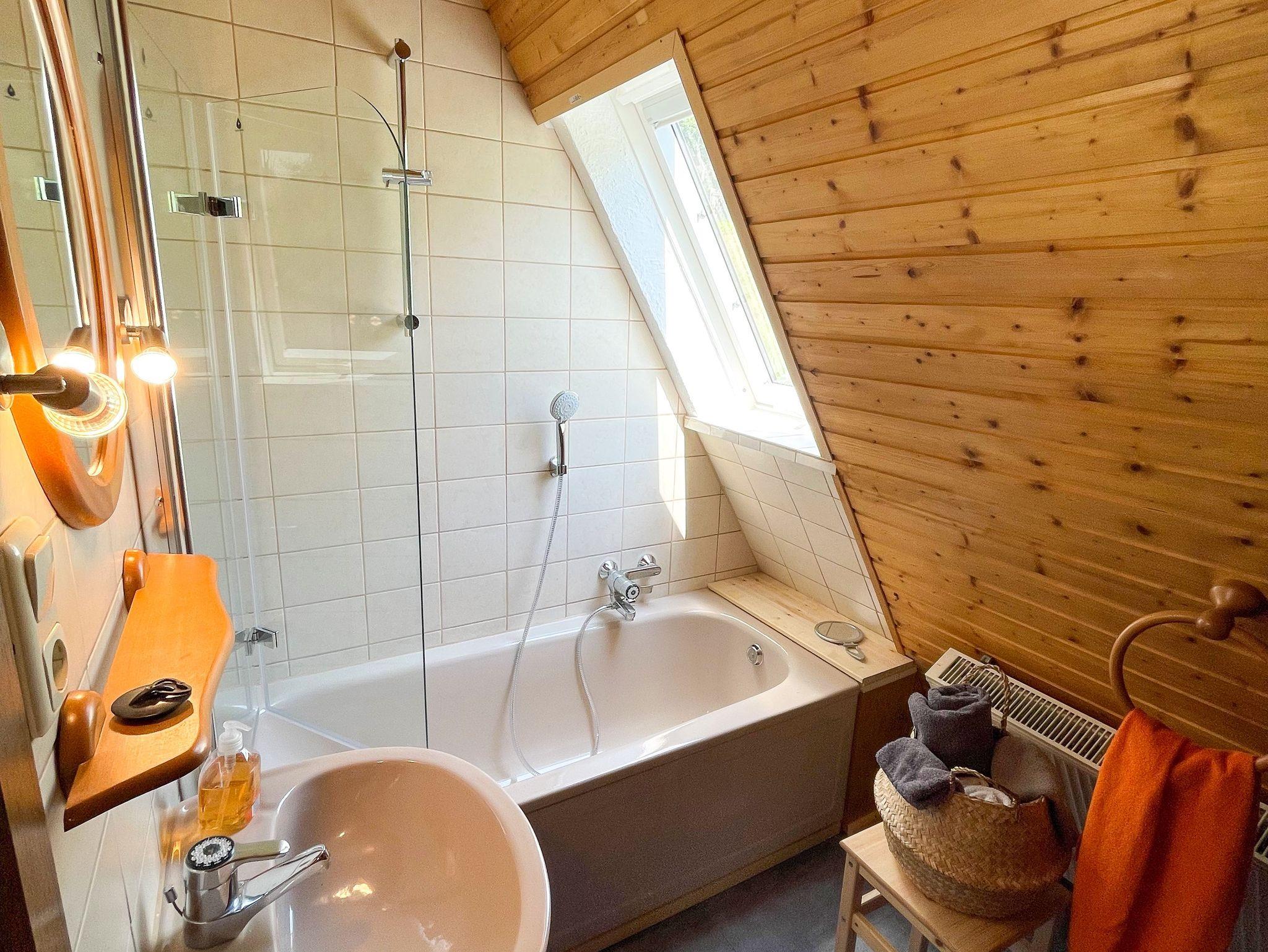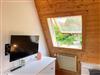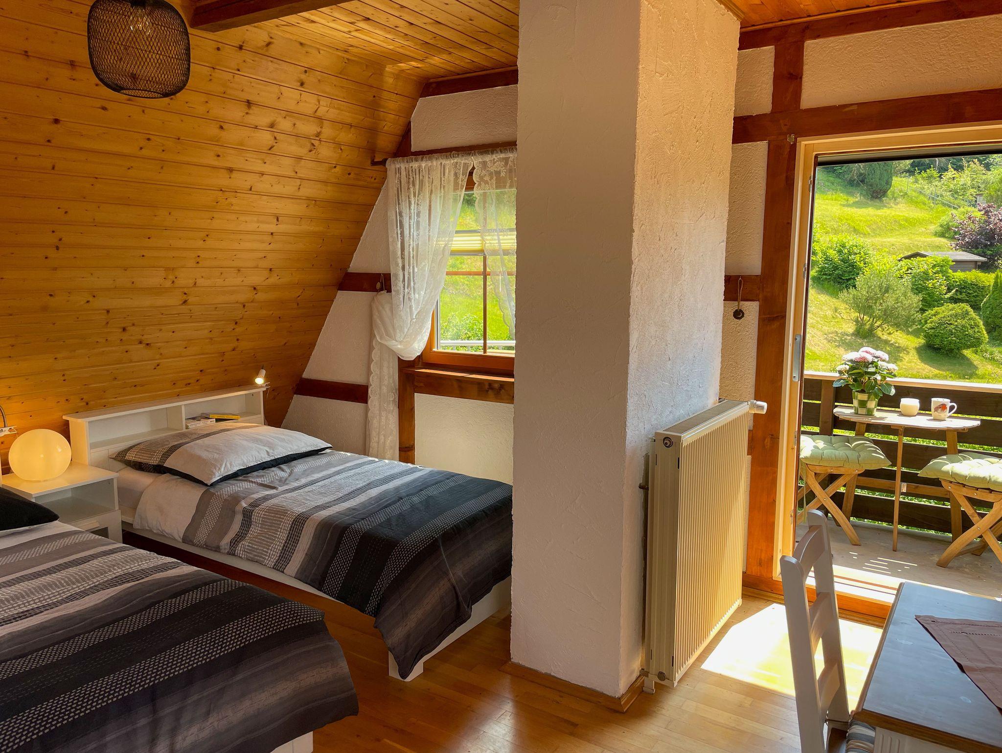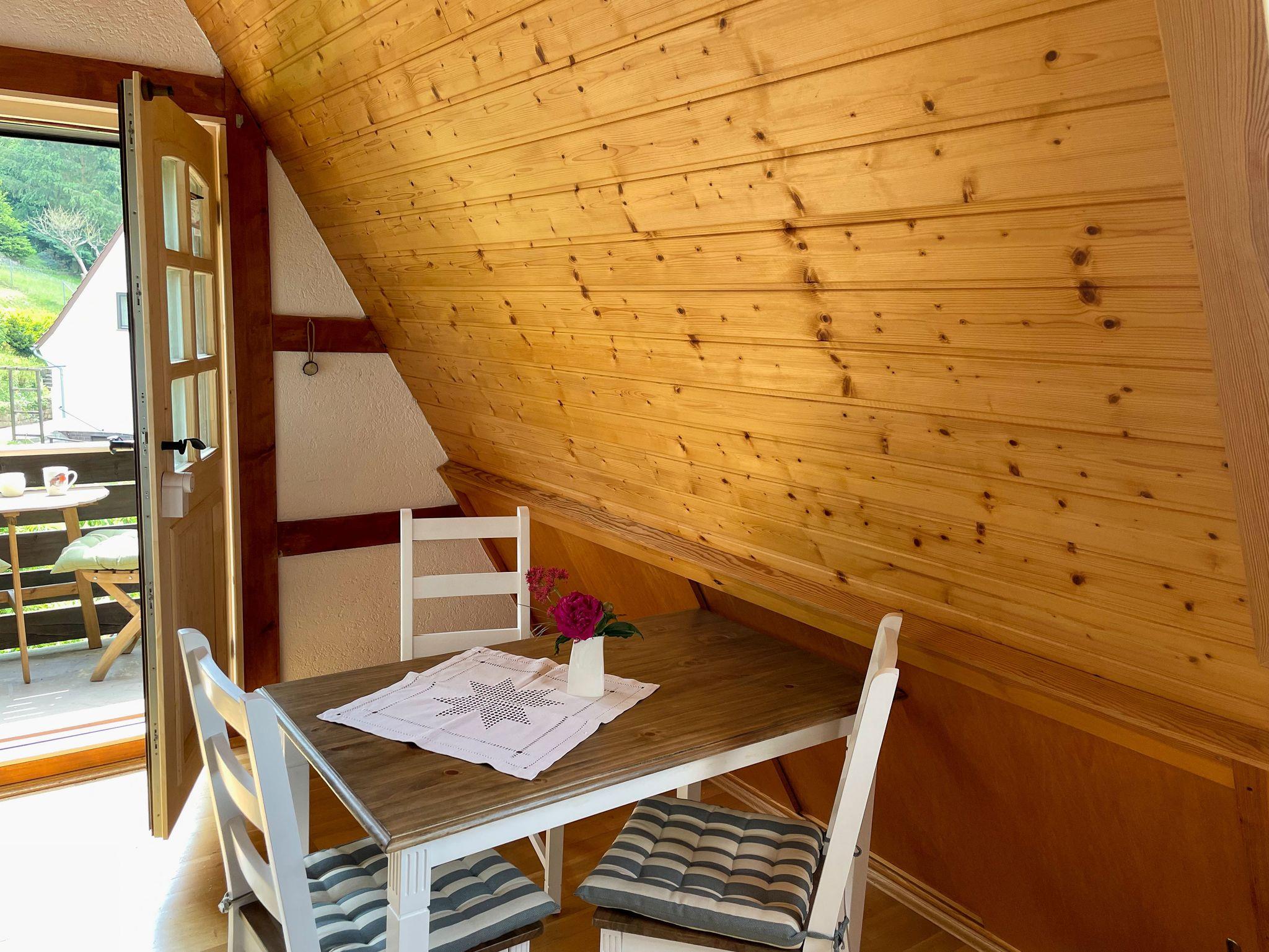 Die Ferienwohnung „Baumkrone“ befindet sich im 1. Stock. Der Wohn- und Schlafraum ist urig gemütlich. Der Panoramablick einzigartig. Frühaufsteher und Sonnenuntergangsbewunderer können mit großer Wahrscheinlichkeit Rehe und andere Waldtiere beobachten.