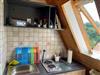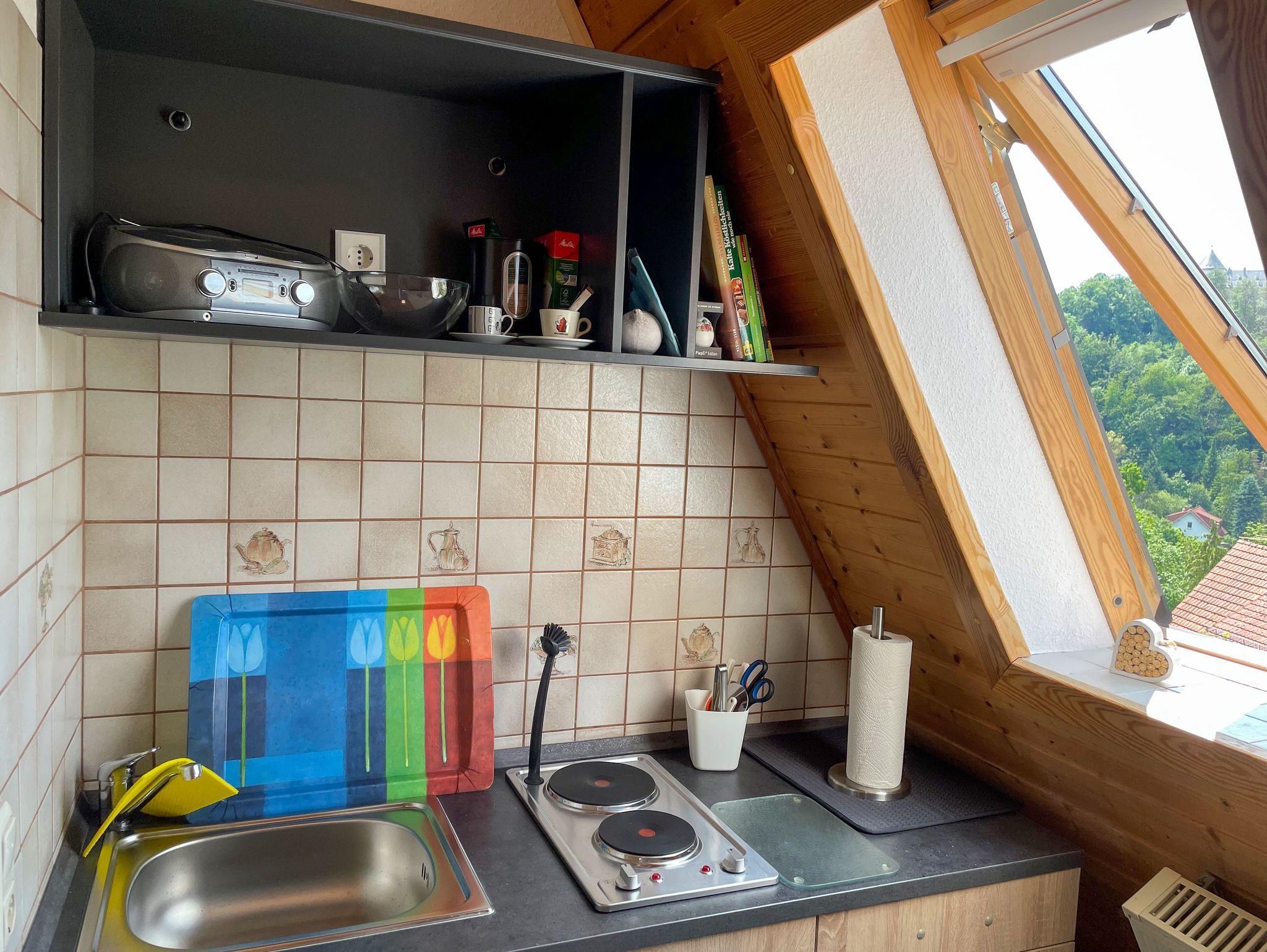 Das Studio Baumkrone mit separater Küche ist 45 qm groß (inkl. Balkon), bietet Platz für zwei Erwachsene und befindet sich im Obergeschoss des Hauses. Auch diese Wohnung ist über einen separaten Eingang, über eine gut begehbare Wendeltreppe zu erreichen.