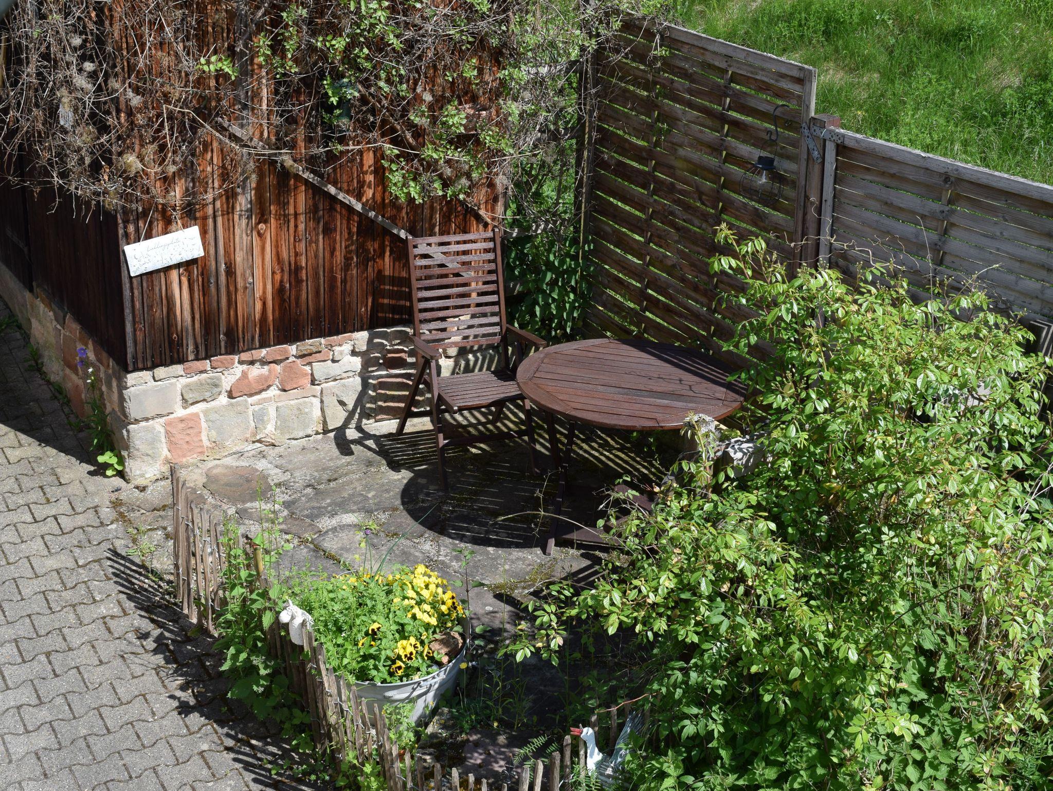 Eine Sitzecke auf dem Balkon oder im naturbelassenen Garten laden zum Verweilen ein.