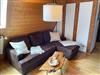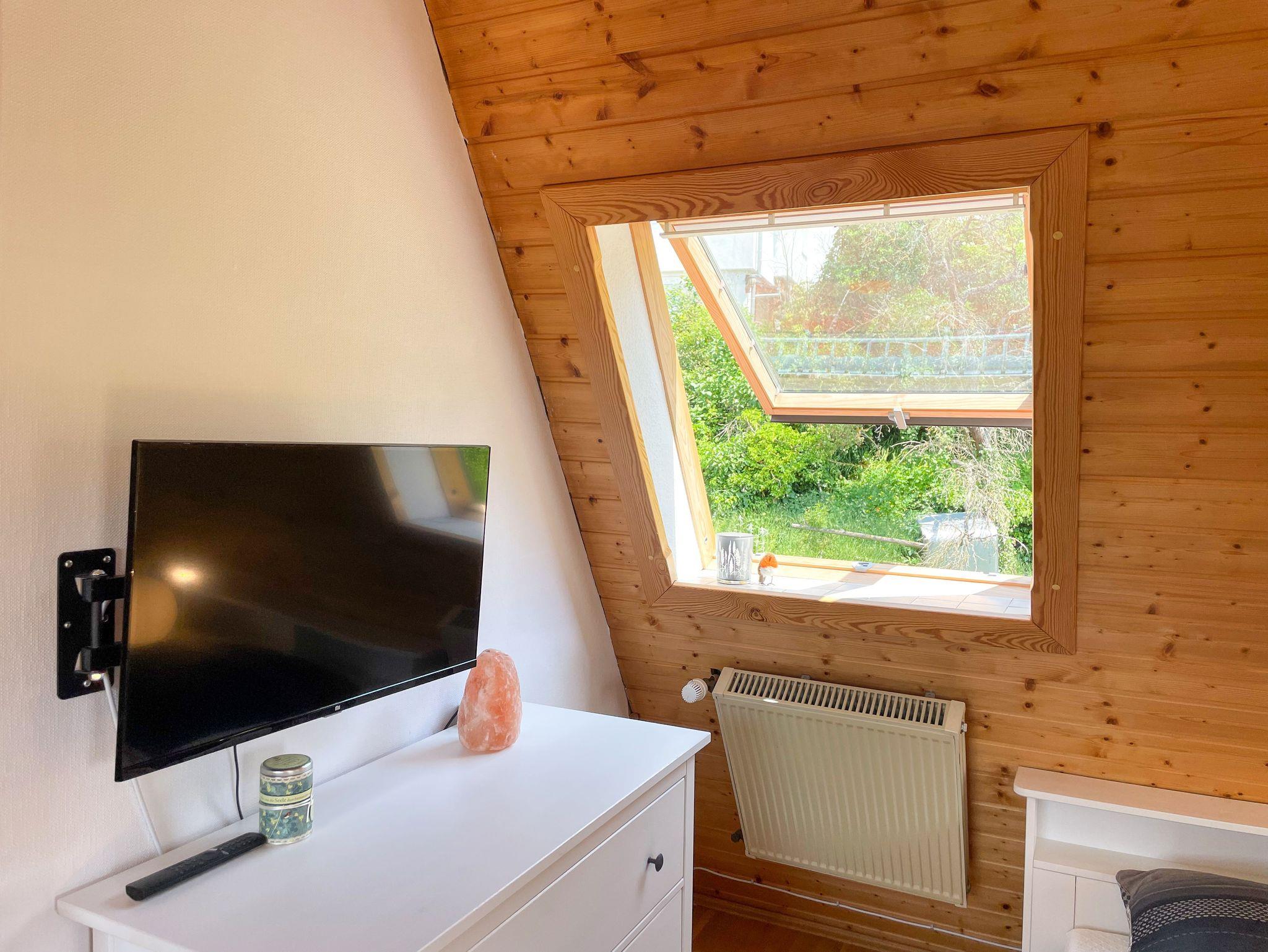 Die kleine Wohnung ist mit zwei Einzelbetten ausgestattet. Fernsehen kann man sowohl vom Sofa als auch vom Bett aus.