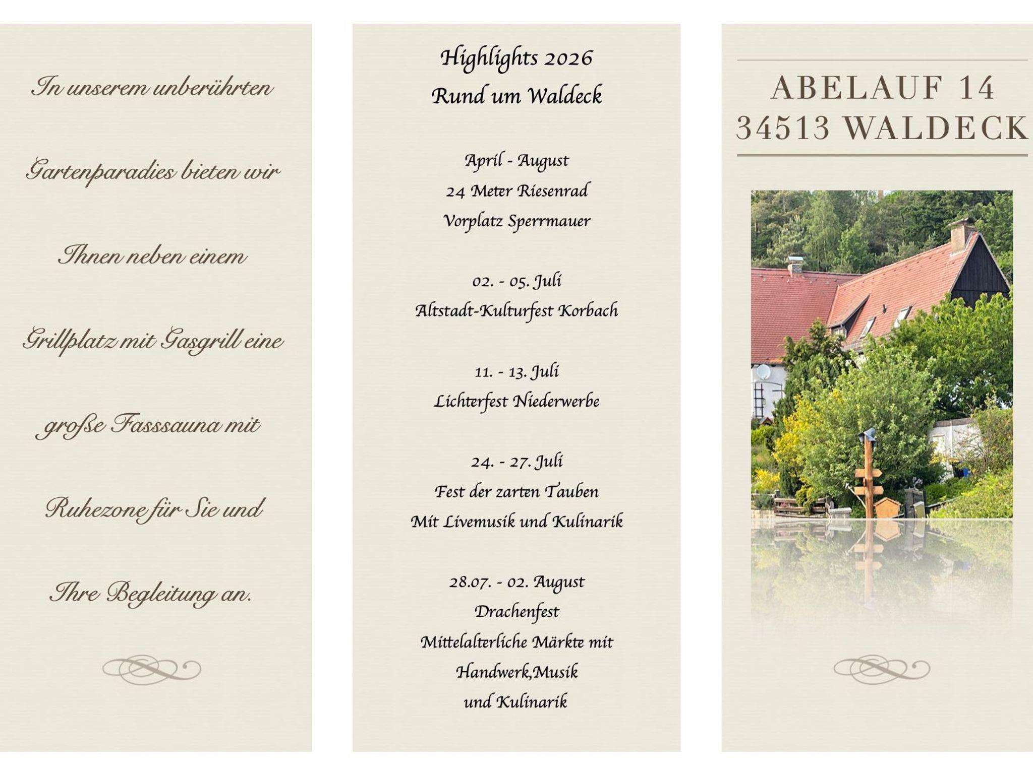 Die Nationalparkstadt Waldeck erhebt ganzjährig einen Tourismusbeitrag von 1,- Euro; pro Person und Tag. (Kinder bis zum vollendeten 14. Lebensjahr sind frei). Der Tourismusbeitrag wird vor Ort gesondert berechnet!