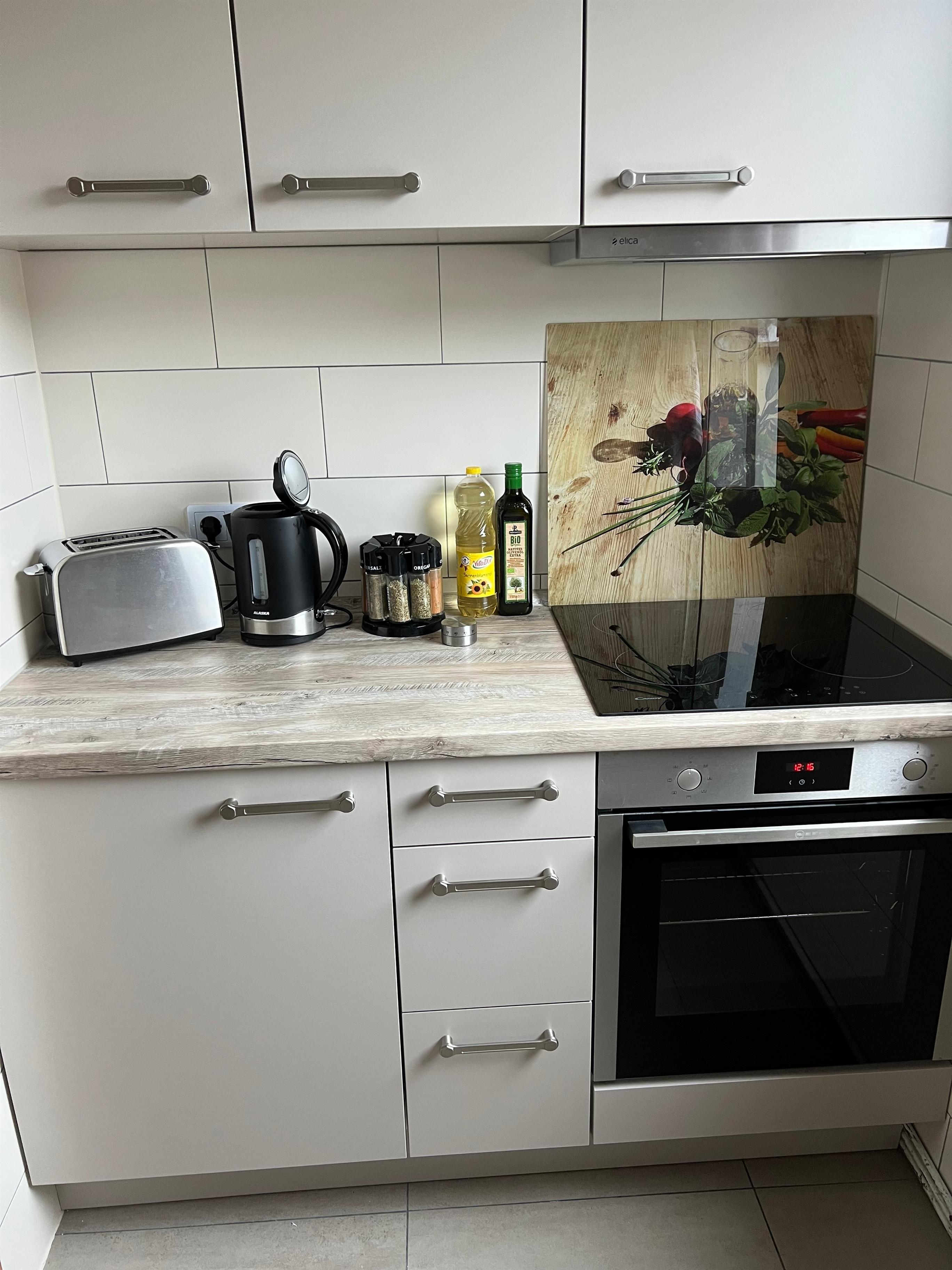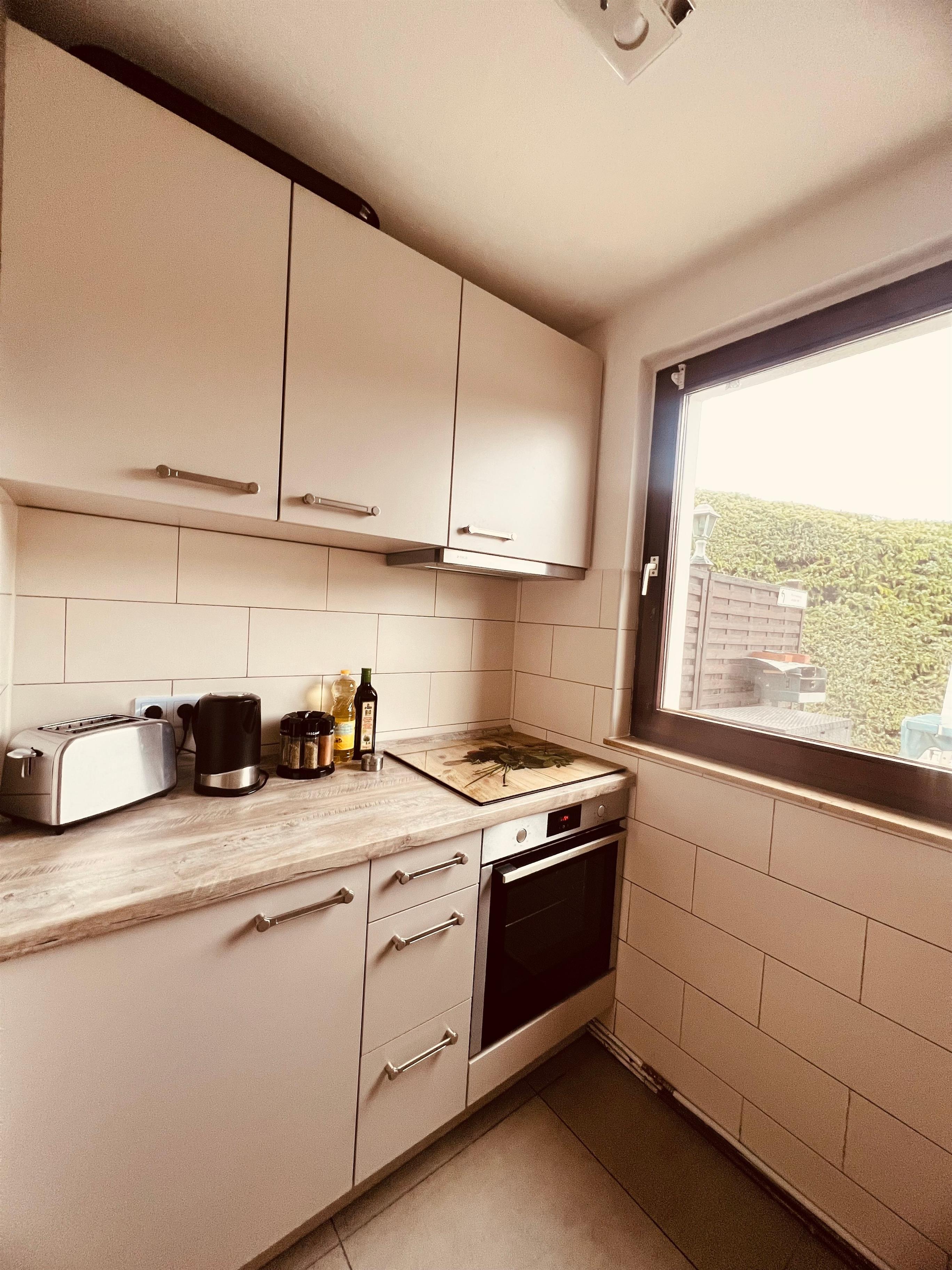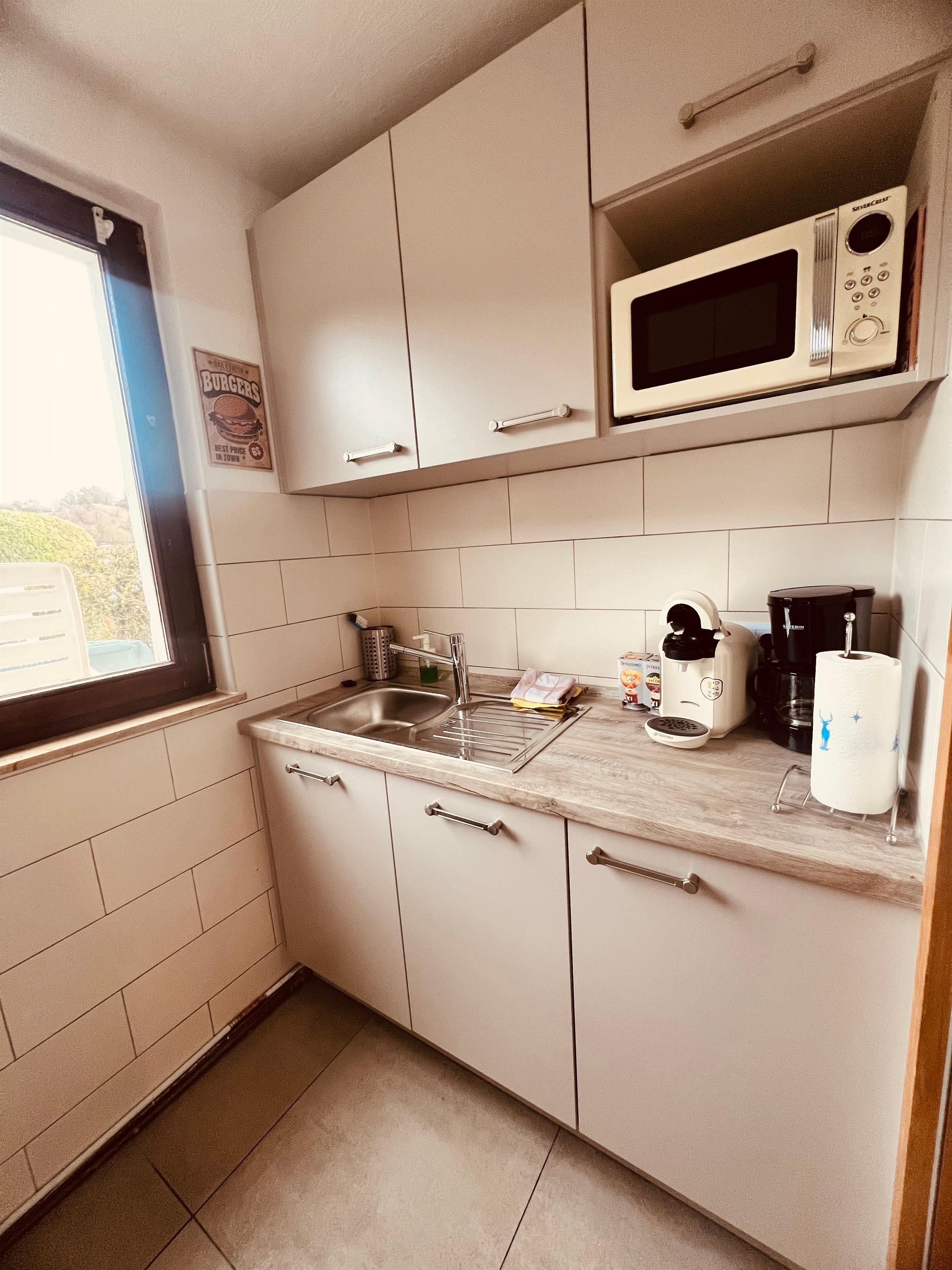 Richtige Urlaubsstimmung kommt auf der schönen Terrasse der Ferienwohnung auf. In der gut ausgestatteten Küche finden Sie neben einem Kühlschrank auch eine Mikrowelle und einen Backofen.