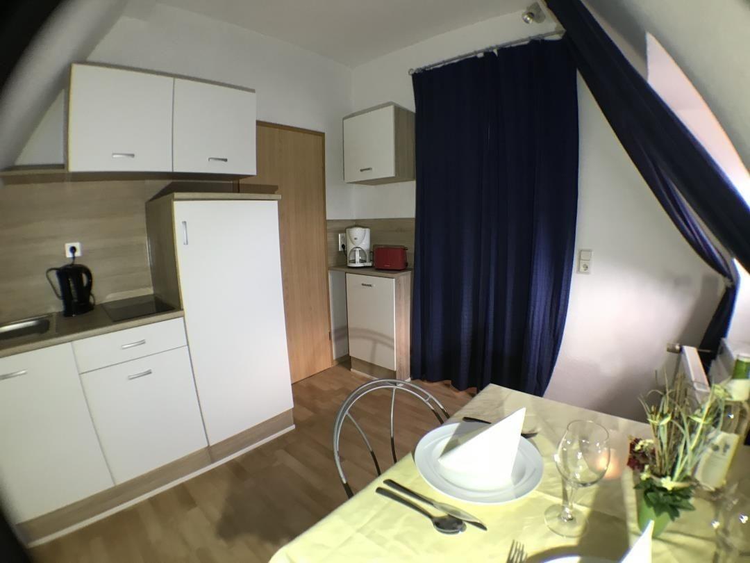 Sie besteht aus einem Wohn/Schlafraum mit einem Boxspringbett. In der kleinen smarten Küche, befindet sich ein Esstisch mit Stühlen. Die Küche ist für kleinere Zubereitungen ausgestattet. Die Ferienwohnung kann z.Zt. mit maximal 2 Personen belegt werden.
