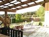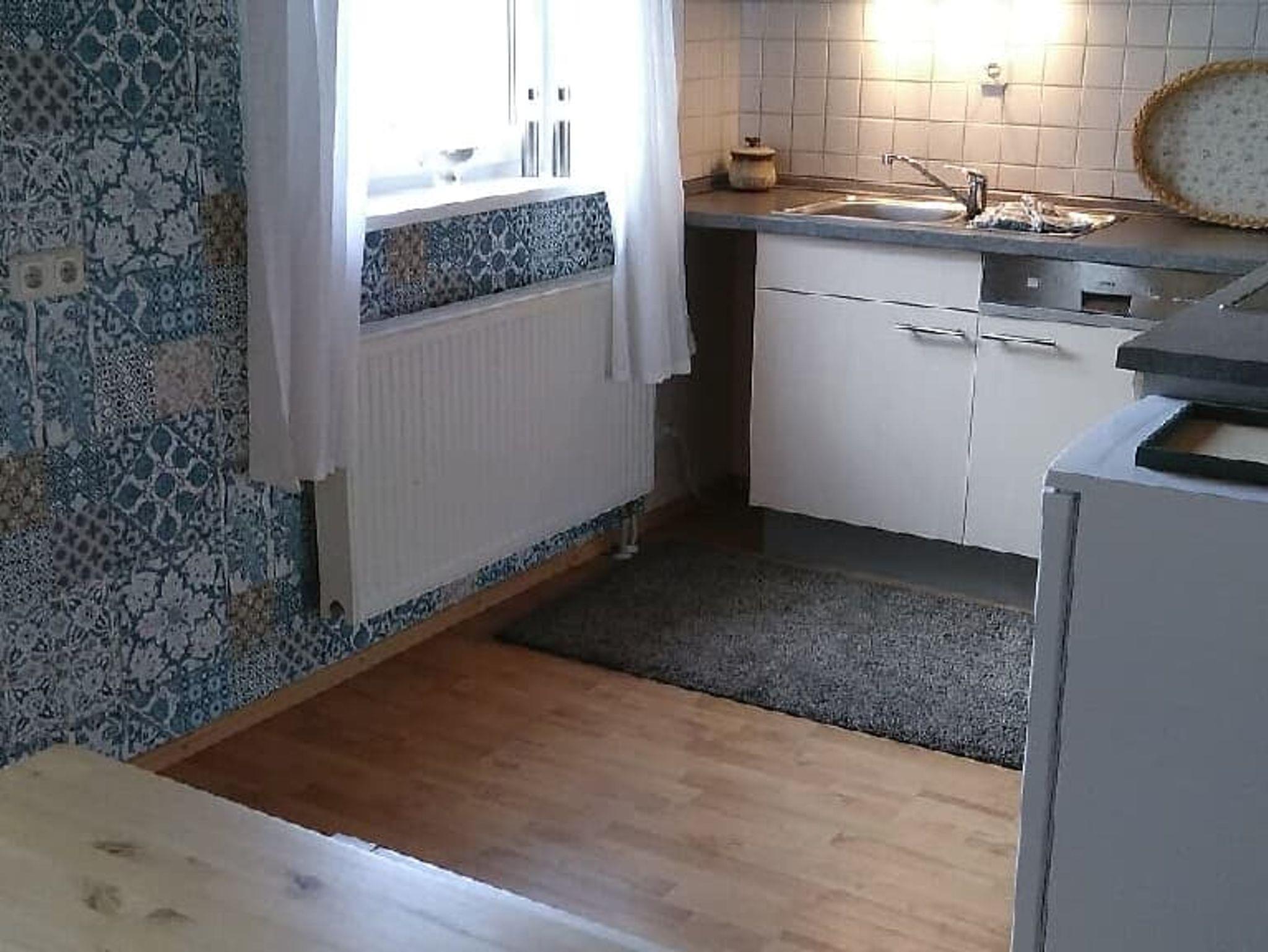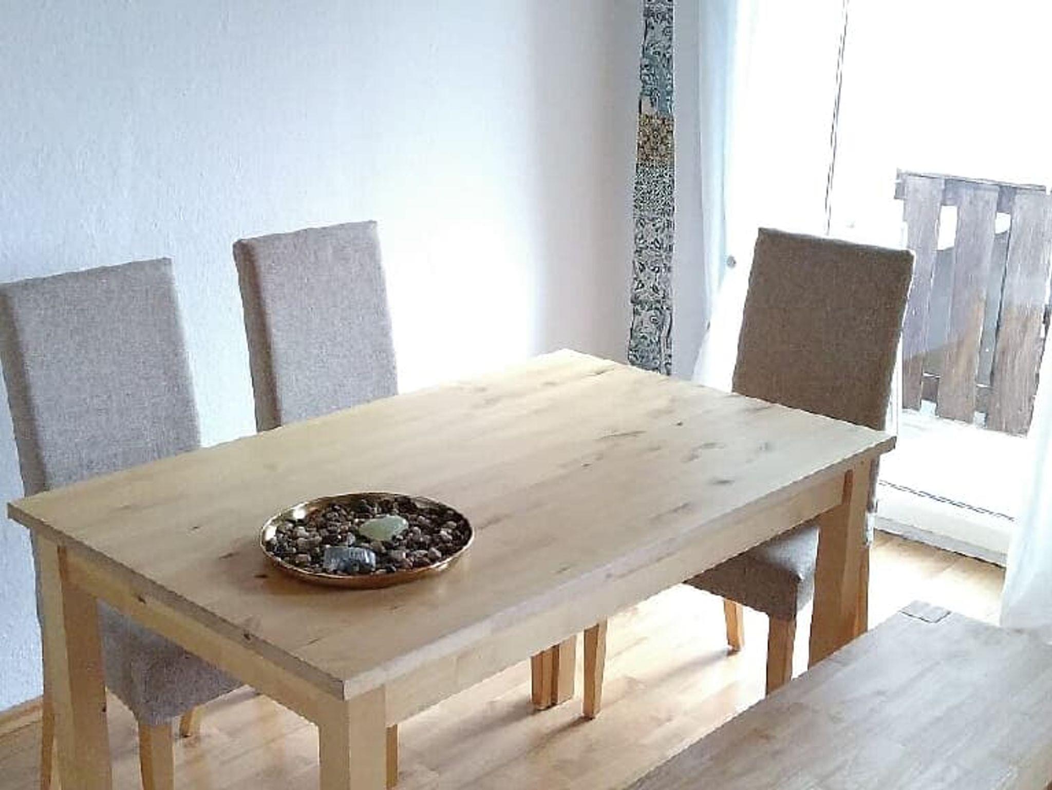 Von der Küche kann man direkt auf die Terrasse im eingezäunten Garten mit 2 Liegestühlen, Tisch und 4 Stühlen mit Überdachung. Für die kleinen Gäste gibt es eine Kinderbank mit Tisch.