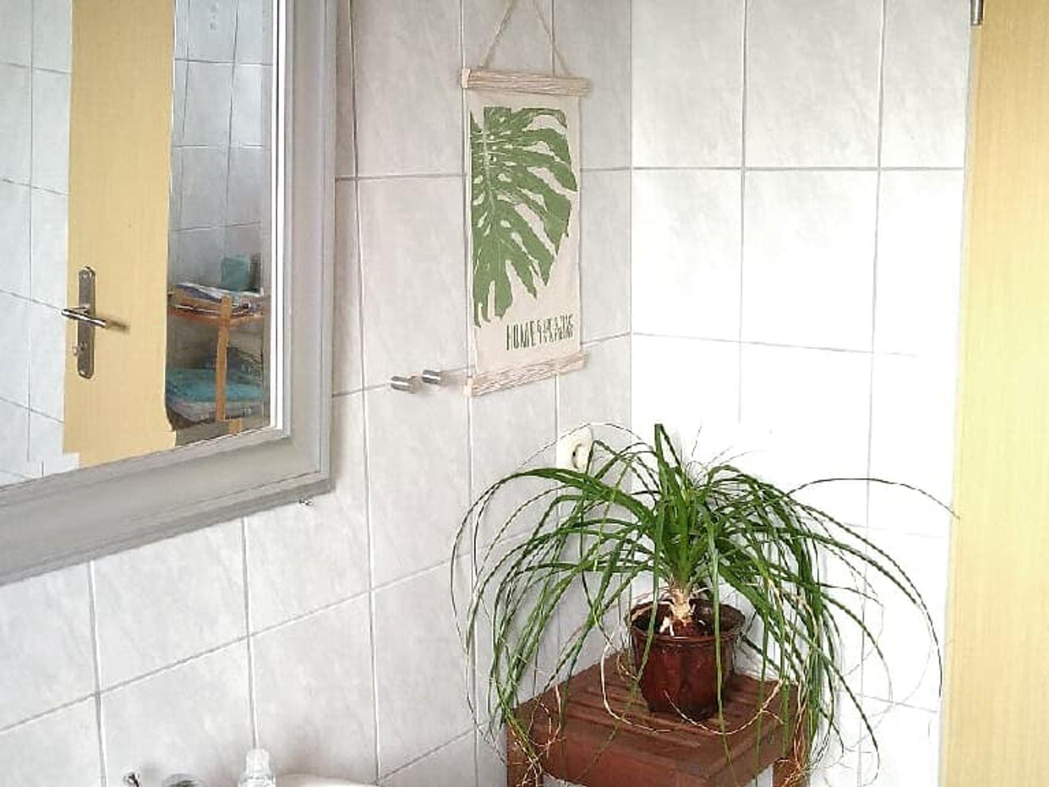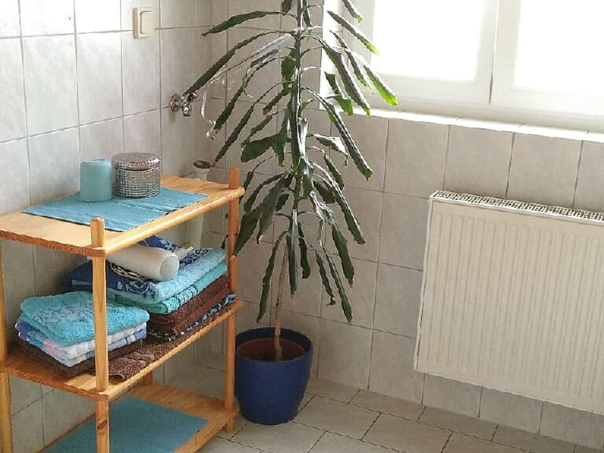 Im Badezimmer befindet sich die Dusche, ein Waschbecken und das WC. Handtücher und ein Fön liegen bereit.