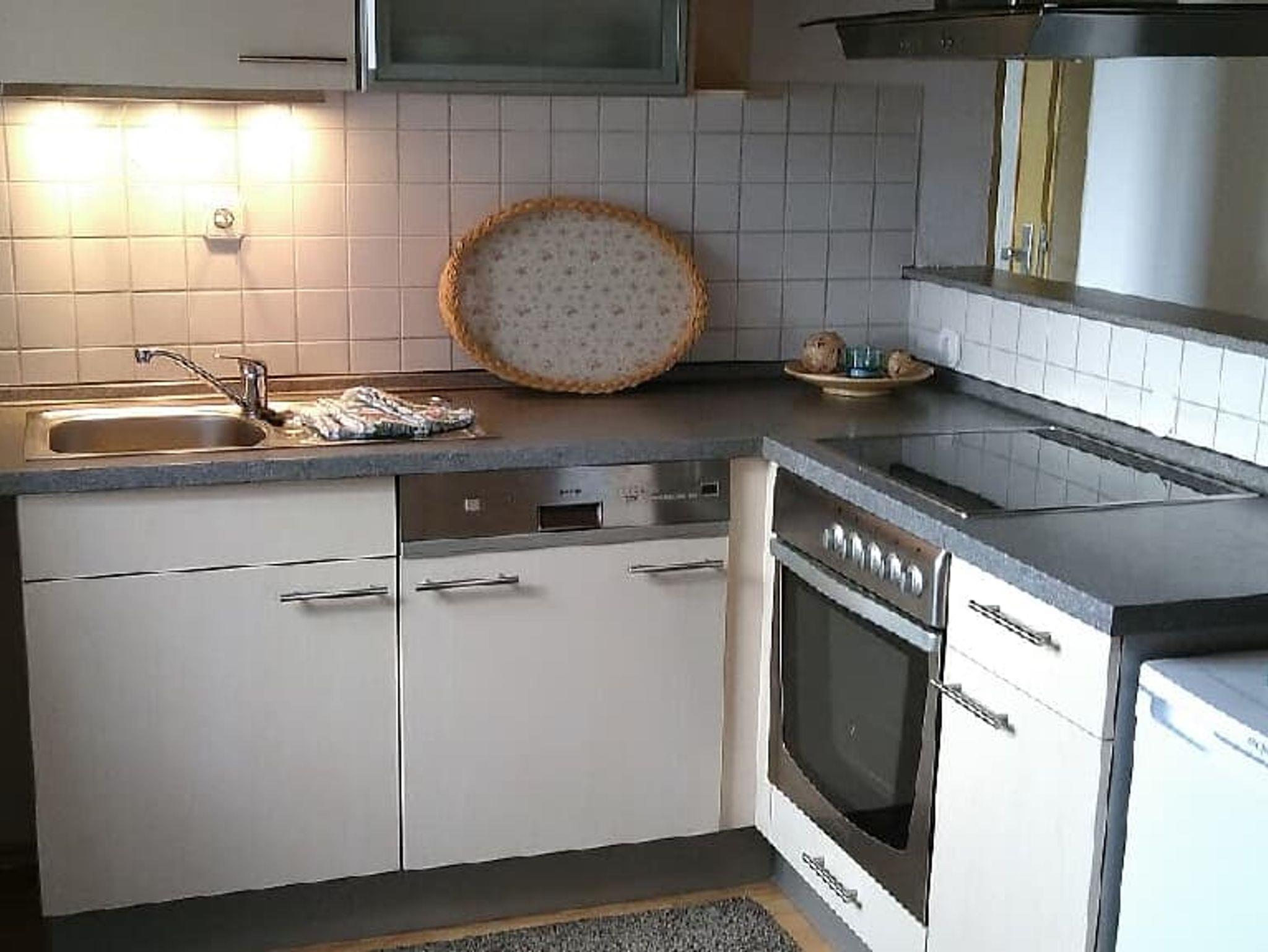 Geschirrspüler, Backofen, Kühlschrank mit kleinem Gefrierfach, Kochfeld mit Dunstabzug, Wasserkocher, Teller, Tassen, Gläser, Besteck, Expressokocher, Geschirrtücher, Schüsseln, Pfannen und Töpfe.