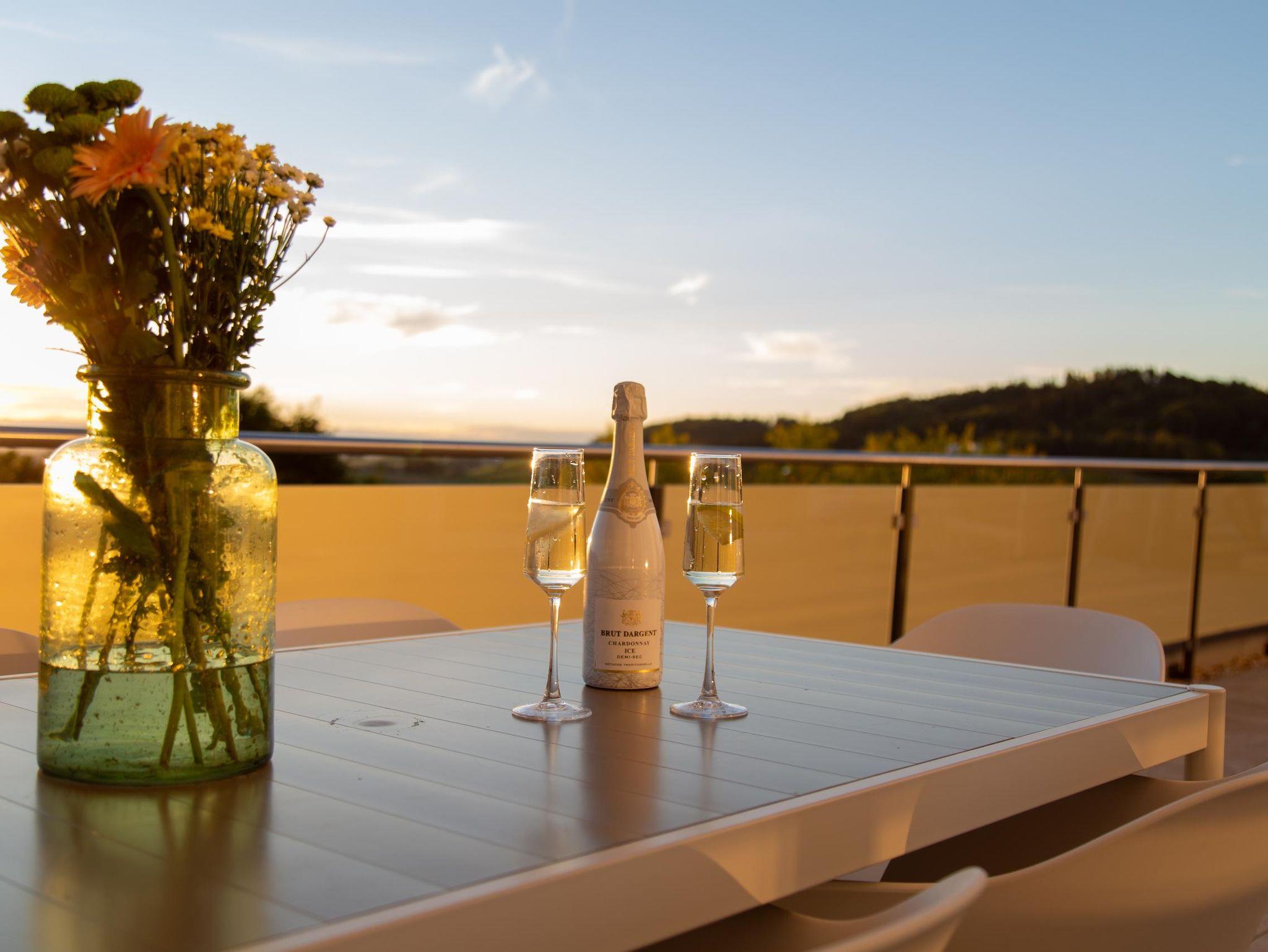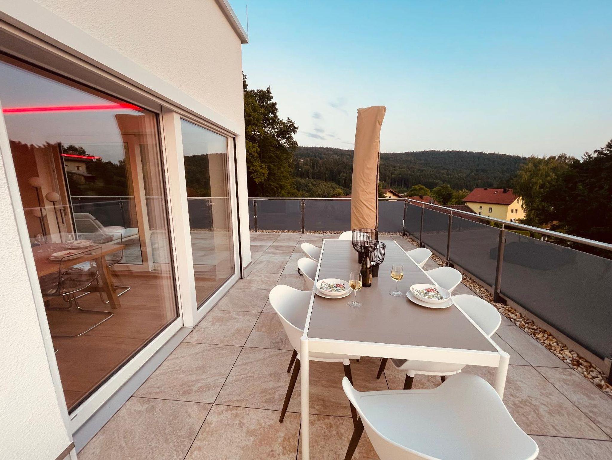 Auf 256 m² genießen Sie hochwertige Ausstattung, großzügige Zimmer und absolute Privatsphäre. Die Wohnung liegt im obersten Stockwerk und bietet über die einzigartige Dachterrasse einen weiten Blick auf den Bayerischen Wald, das umliegende Bergpanorama sowie die benachbarte Penninger Hausbrennerei.