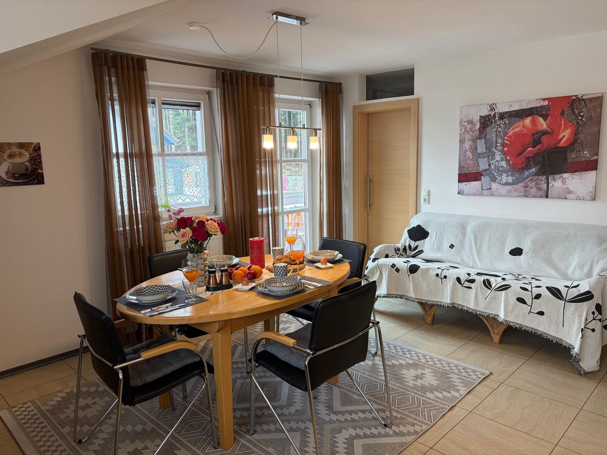Sehr schöne lichtdurchflutete Ferienwohnung am Waldrand. Große Wohnküche mit kompletter Ausstattung inklusive einer Speisekammer. Sowohl Küche als auch Wohnzimmer ermöglichen Zugang zum weit überdachten großen Balkon an der Südseite. Im Wohnzimmer ist eine Eckcouch mit Tisch, Wohnwand mit TV, Schreibtisch mit Laptop am Internet. Die Wohnung verfügt über zwei Schlafräume mit je einem Doppelbett, Schrank und Sideboard. Alle Fenster in der Wohnung haben Rollos, teilweise mit Insektenschutzgitter. Des weiteren hat die Wohnung eine große Diele mit Garderobenmöbeln, ein voll ausgestattetes Badezimmer sowie ein extra WC.