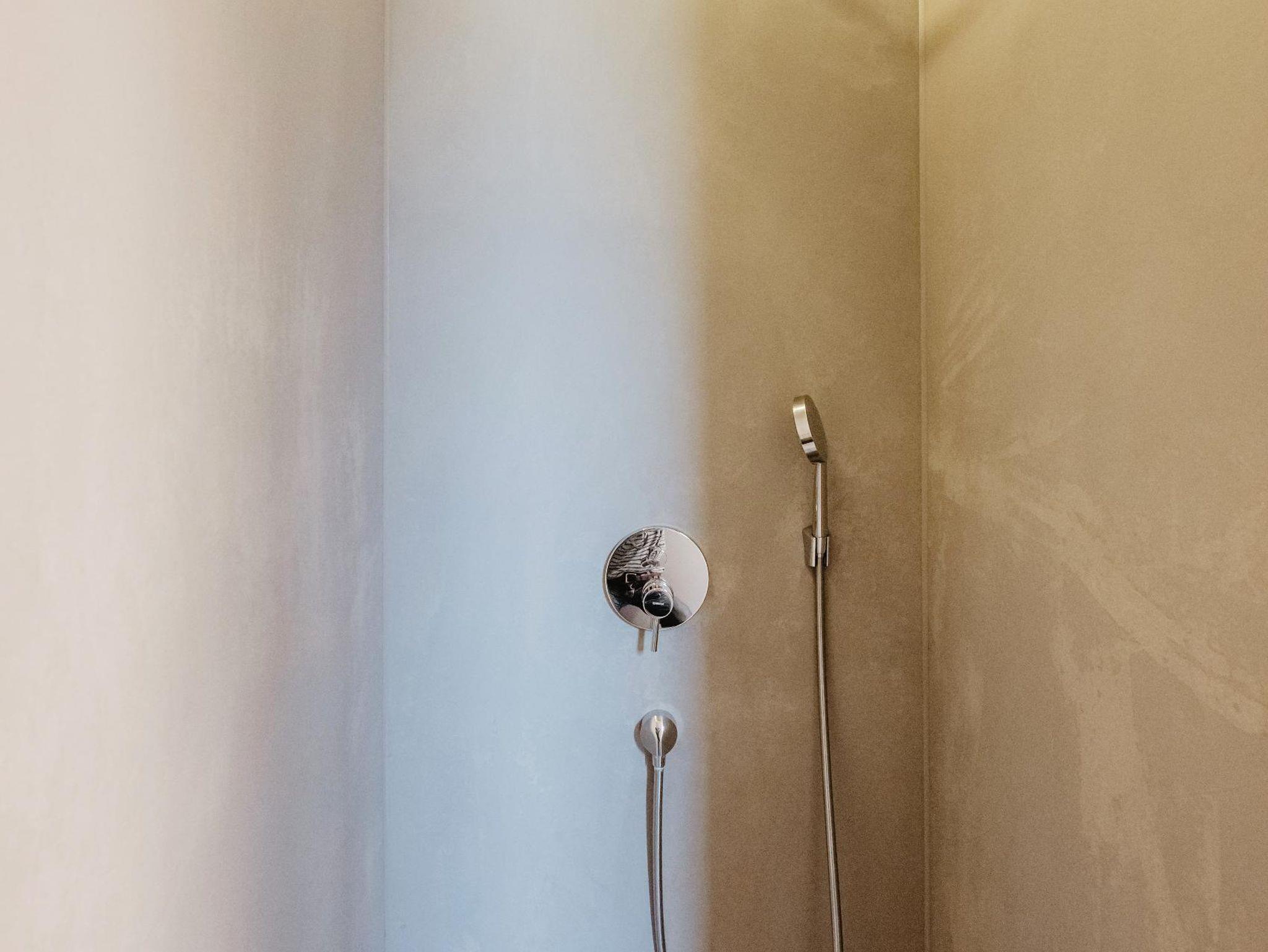 Das moderne Badezimmer ist mit einer großzügigen, begehbaren Dusche mit Regendusche ausgestattet, das WC ist separat.