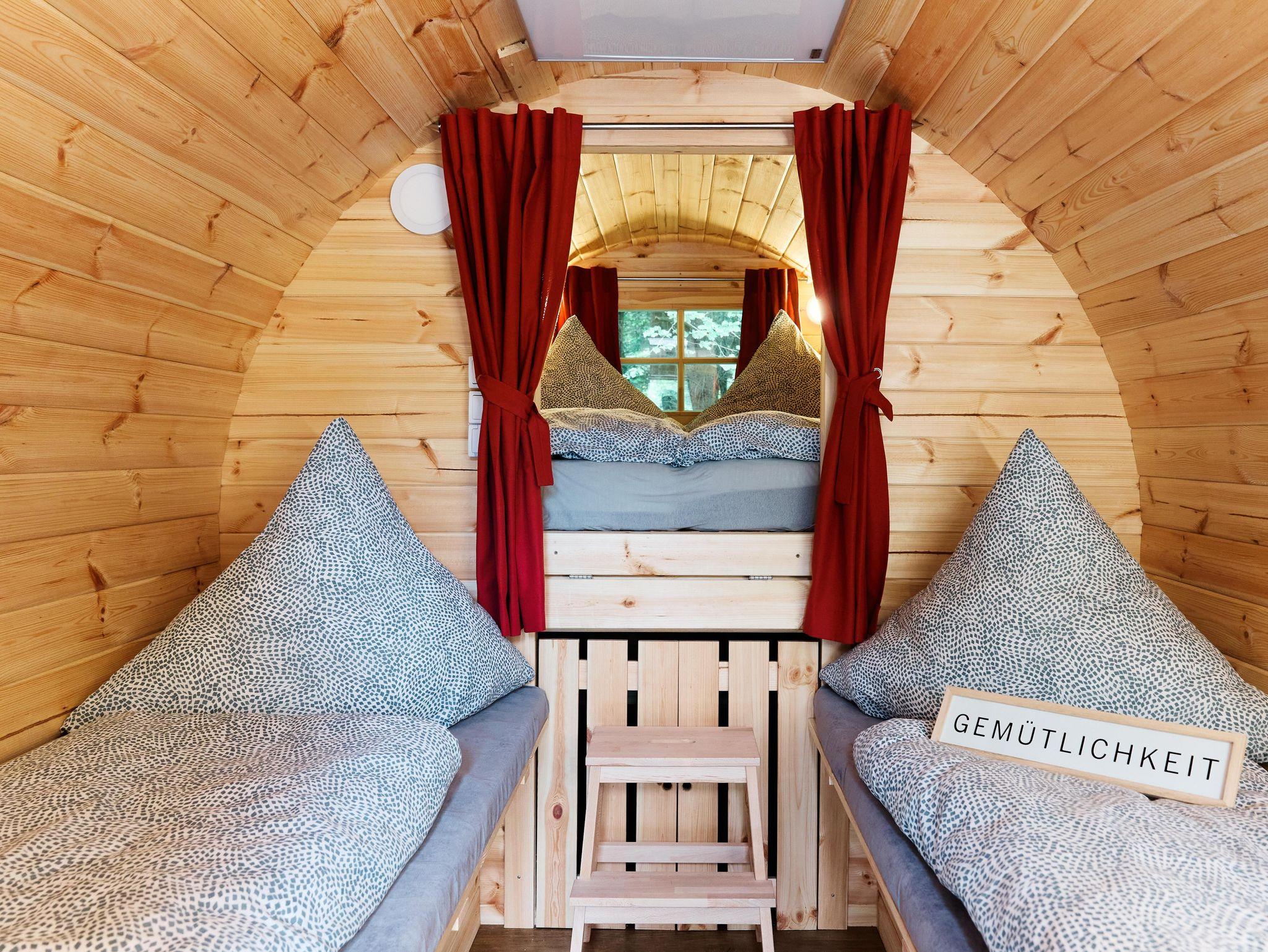 Ausstattung Unsere Schlaffässer bieten eine außergewöhnliche Übernachtungsmöglichkeit mit Fußbodenheizung, komfortablen Matratzen und weiterem Zubehör. Das kleinste Fass bietet Platz für zwei, die anderen vier für je vier Personen. Unsere Premium-Schlaffässer enthalten zusätzlich einen Kühlschrank und Stauraum. Erleben Sie gemütliche und unvergessliche Nächte inmitten der Natur.