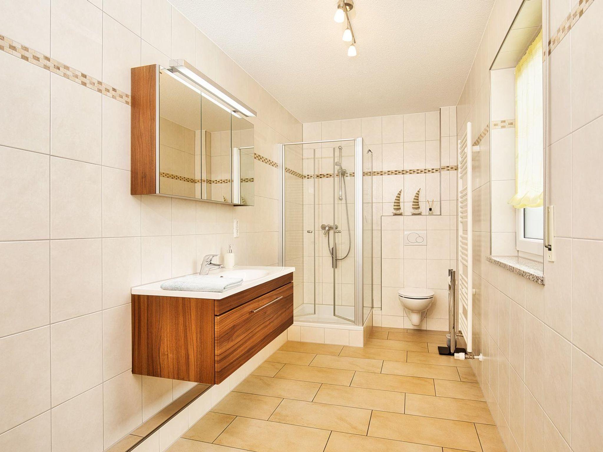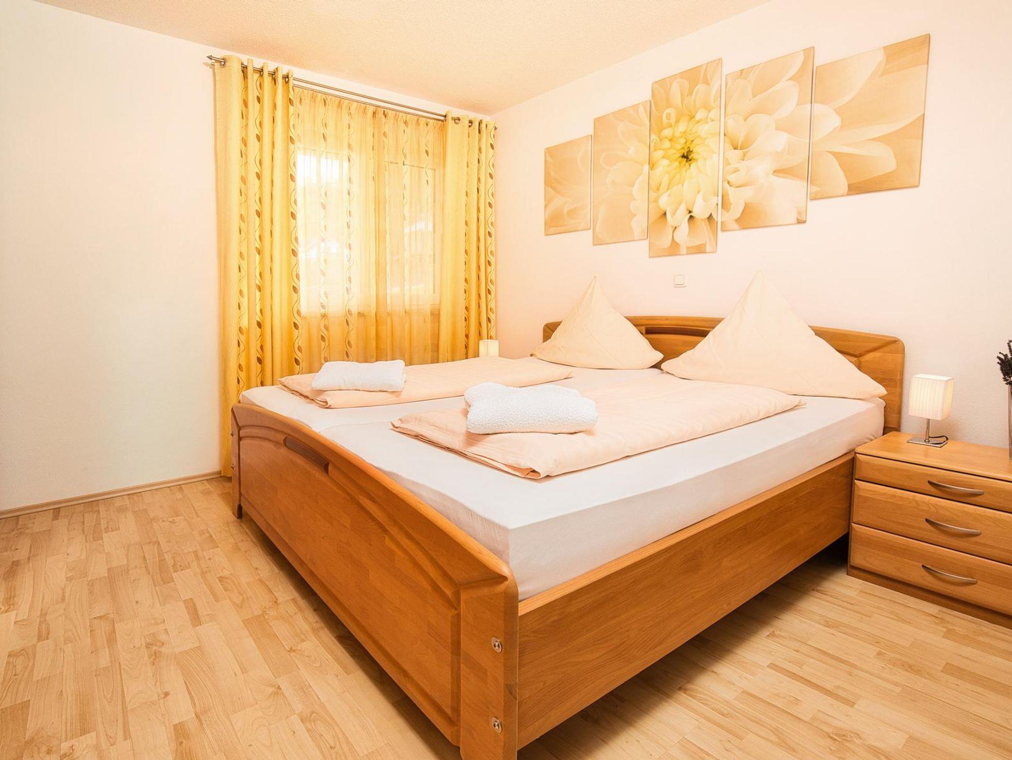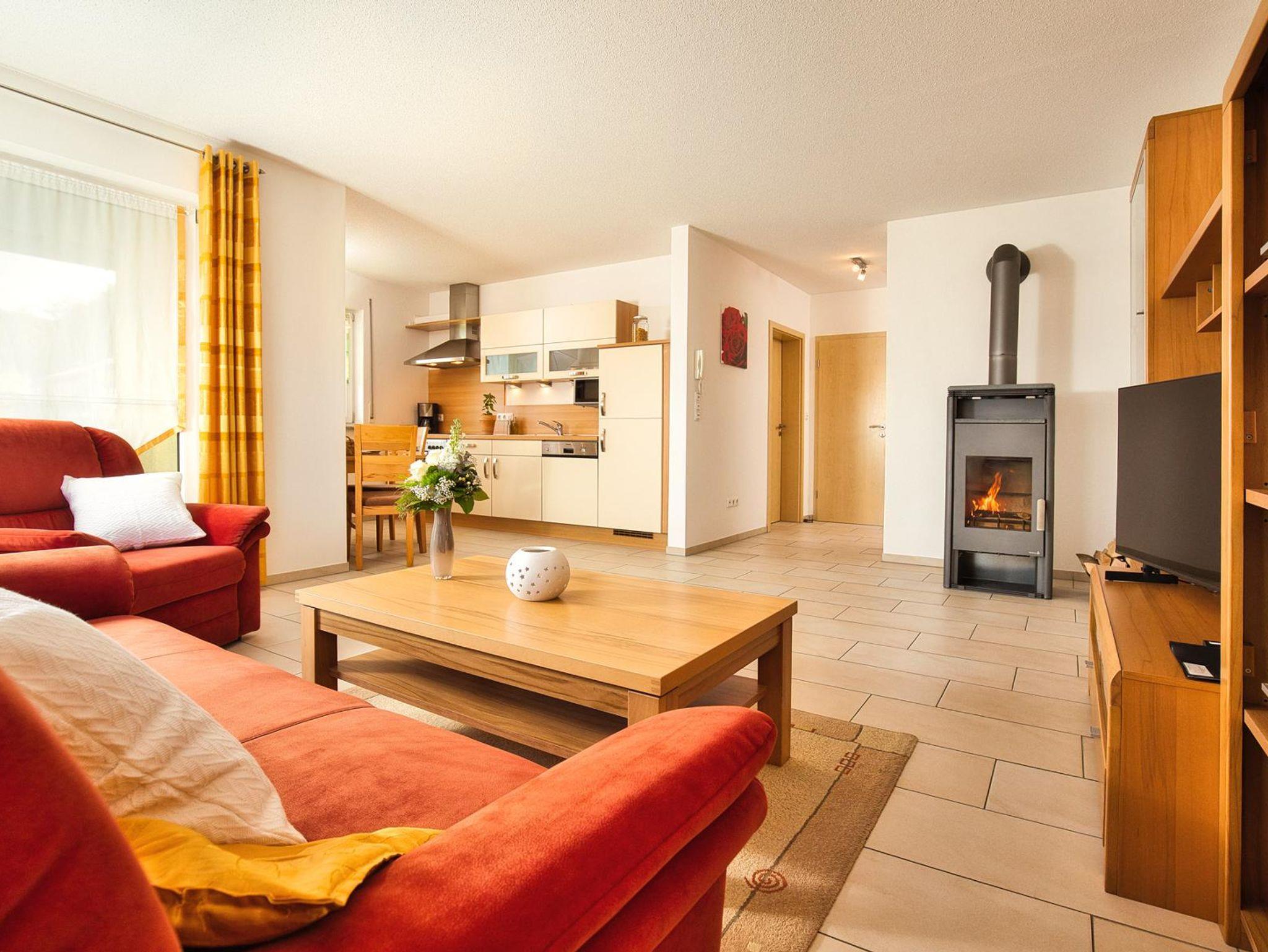Das Badezimmer hat einen großen Waschtisch, WC und Dusche, Wandheizkörper und Fußbodenheizung. Handtücher und Bademäntel werden kostenlos zur Verfügung gestellt. Das Schlafzimmer besteht aus einem Doppelbett und einem großen Schrank. Ein Kinderreisebett kann ggf. noch beigestellt werden. Die Küche ist komplett ausgestattet. So enthält diese Cerankochfeld, Backofen, Dunstabzug, Mikrowelle, Spülmaschine, Toaster, Kühlschrank mit Gefrierfach, Kaffeemaschine etc. Eine Essecke ist ist in der Küche integriert. Der Wohnraum besteht aus einem Sofa sowie einem Sessel, Flachbildfernseher mit SAT-Anschluss ist vorhanden. Ebenso Radio/CD-Player. Ein Kaminofen unterstreicht die gemütliche Atmosphäre. Das Holz zum Heizen steht kostenlos zur Verfügung. Bücher, Zeitschriften sowie Gesellschaftsspiele sind vorhanden. Die Wohnung befindet sich im Erdgeschoss und hat einen großen Balkon. Balkonmöbel sind vorhanden. Ebenfalls kann der große Garten genutzt werden. Von der Wohnung aus kann man den herrlichen Panoramablick zum nahegelegenen Perlsee sowie zum rund herum befindlichen schönen Bayerischen Wald und Böhmerwald genießen.