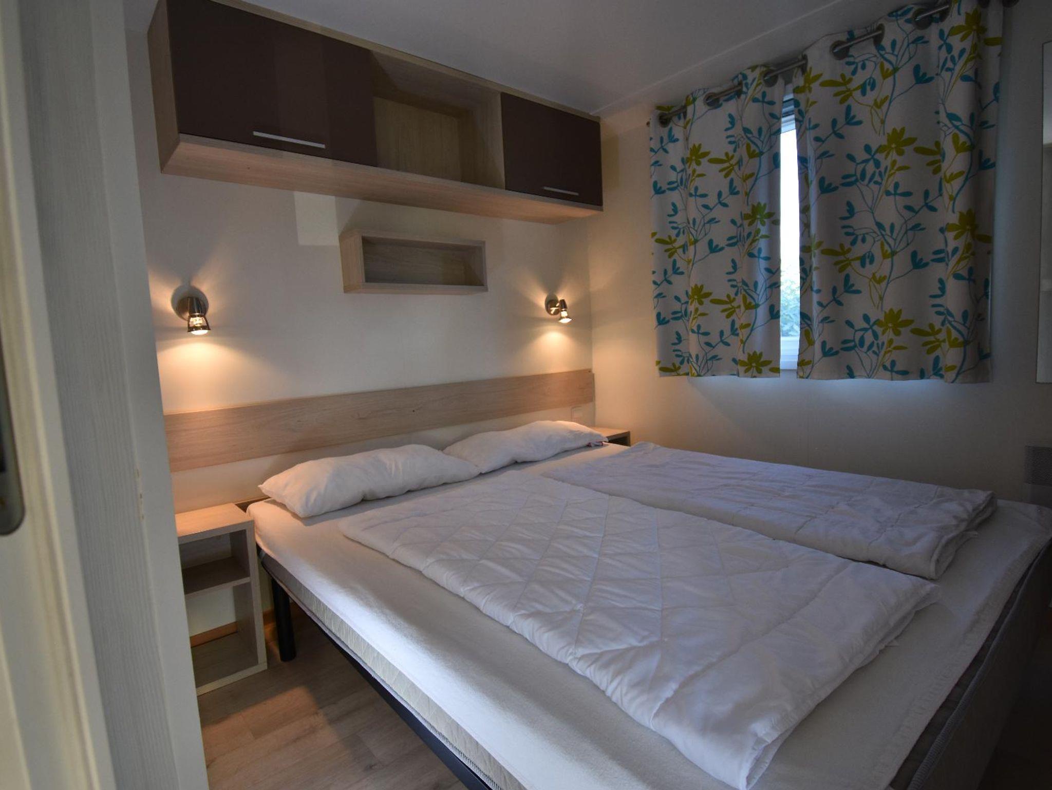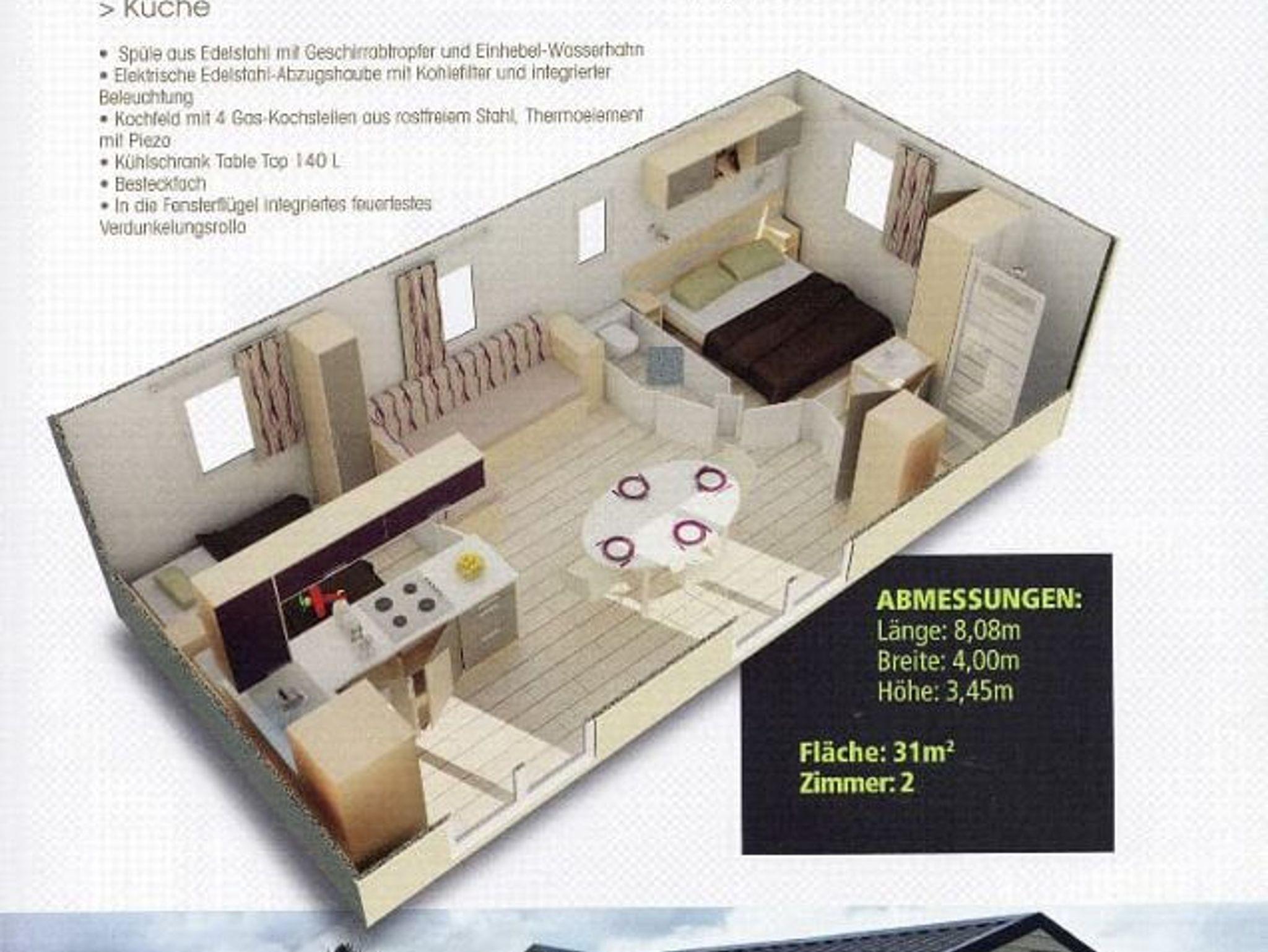 Das behagliche, modern eingerichtete Mobilheim Grand Large ist 31qm groß und bietet Platz für 4 Personen. Im ersten Schlafzimmer befindet sich ein Doppelbett. Im zweiten Schlafzimmer befinden sich zwei Einzelbetten. Das Bad besteht aus Dusche und WC. Im Wohnzimmer befindet sich eine Couch und ein Fernseher. Die separate Küchenzeile mit Mikrowelle, Kaffeemaschine, Backofen, Kühlschrank, Herd, Geschirr und Toaster lässt keine Wünsche offen. Auf der schönen Terrasse können Sie die Sonne genießen. Parkplatz auf dem Grundstück und WLAN vorhanden. Hunde gegen Bezahlung erlaubt!