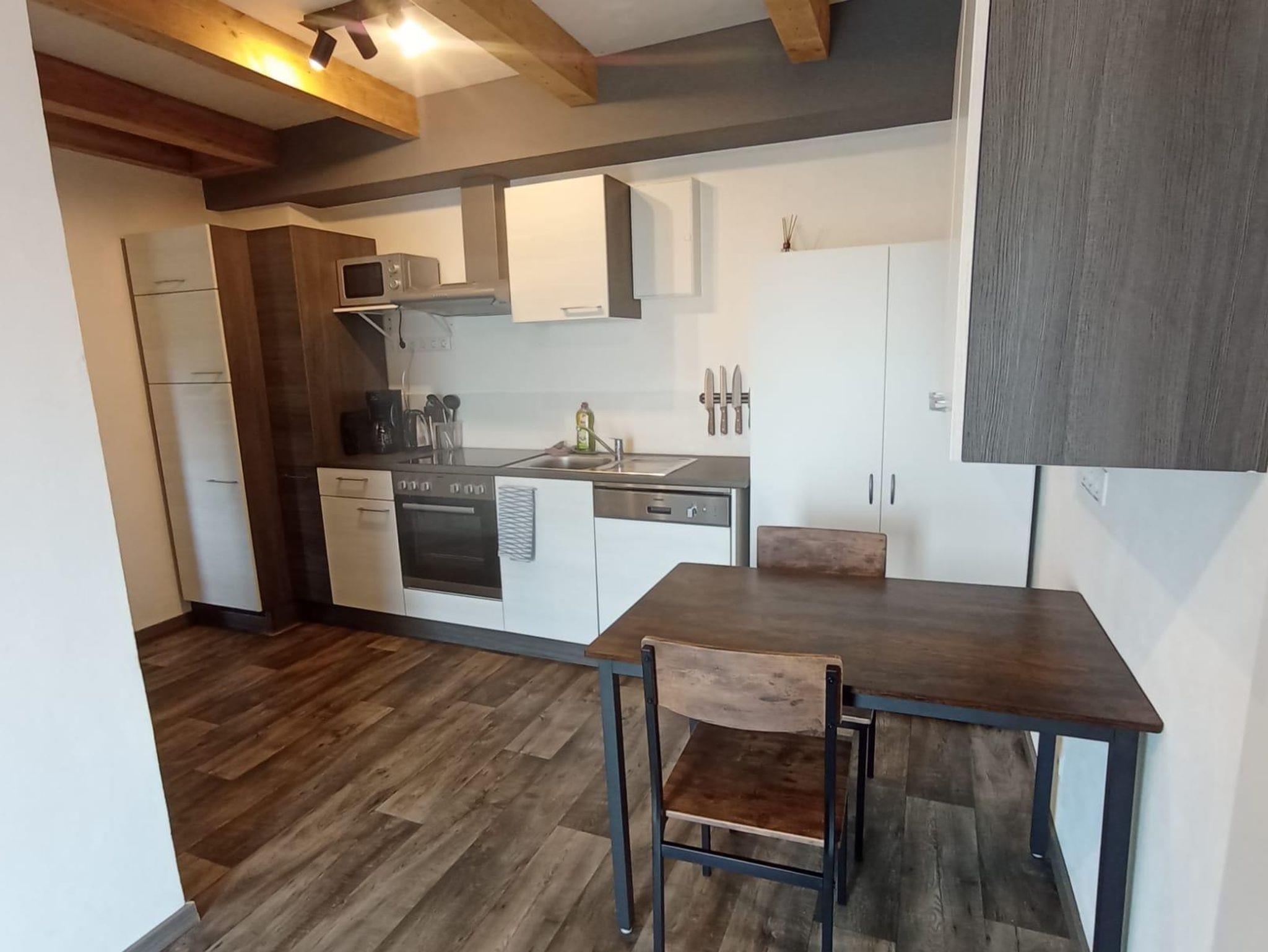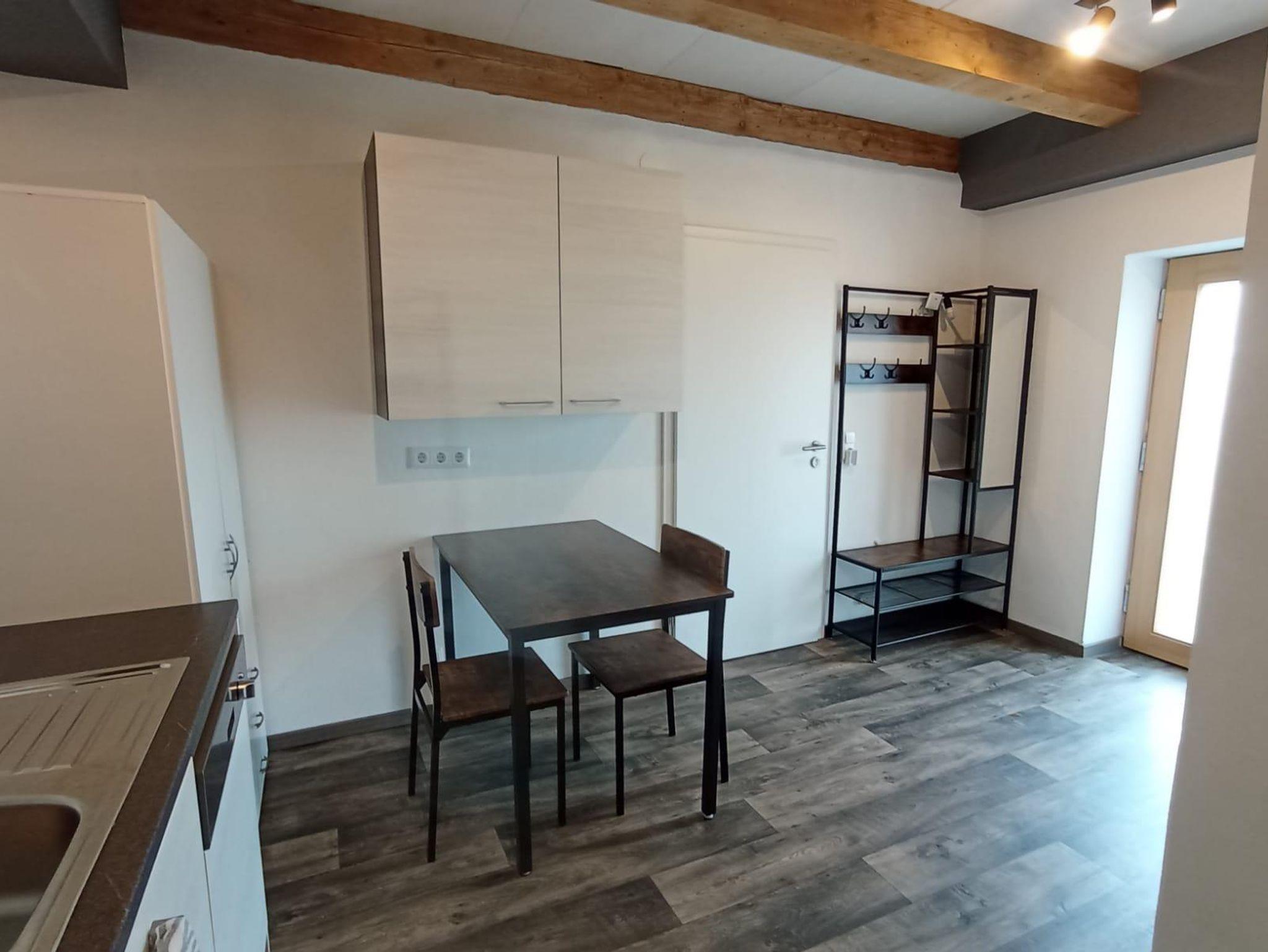 Das komplett neu eingerichtete und renovierte Appartment besteht aus einem Schlafraum mit einem 1,80 breiten Doppelbett mit durchgängiger Matratze, einem Schrank, einem Schreibtisch und einem Sessel. Zudem hat der Schlafraum noch einen Holzofen für eine angenehme Wärme an kalten Tagen. In der Wohnküche, mit komplett ausgestatteter Küche (mittelgroßes Gefrierfach, Mikrowelle, Kaffeemaschine, Wasserkocher, Backrohr, Geschirrspülmaschine, Geschirr, ect.) sollte an alles gedacht sein für das leibliche Wohl. Auch eine Waschmaschine steht für eine geringe Gebühr von 3€ pro Nutzung zur Verfügung.