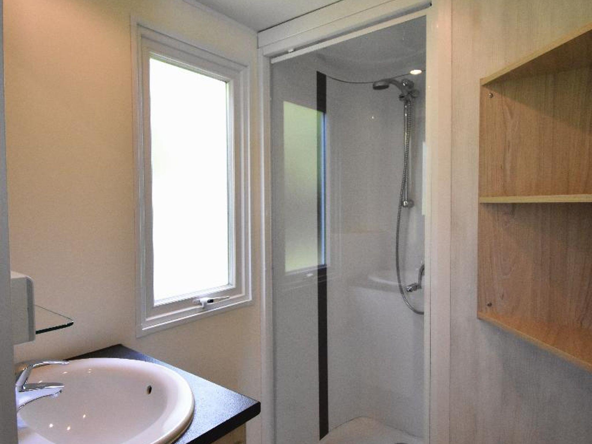 Das behagliche, modern eingerichtete Mobilheim OCEANE ist 27qm groß und bietet Platz für 4 Personen. Im ersten Schlafzimmer befindet sich ein Doppelbett. Im zweiten Schlafzimmer befinden sich zwei Einzelbetten. Das Bad besteht aus Dusche und WC. Im Wohnzimmer befindet sich eine Couch und ein Fernseher. Die separate Küchenzeile mit Mikrowelle, Kaffeemaschine, Kühlschrank, Herd, Geschirr und Essecke lässt keine Wünsche offen. Auf der schönen Terrasse können Sie die Sonne genießen. Parkplatz auf dem Grundstück und WLAN vorhanden. Hunde gegen Bezahlung erlaubt!
