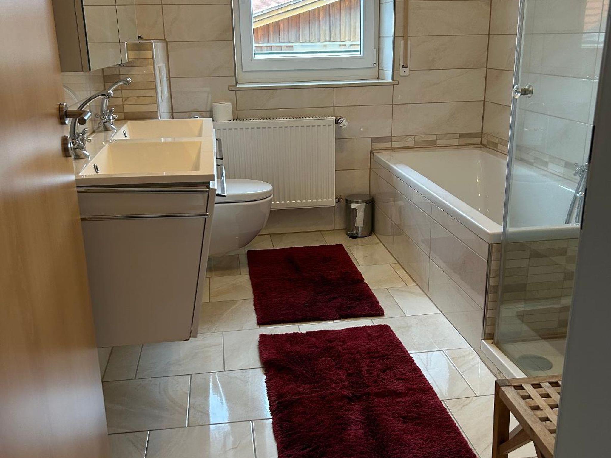 Badezimmer verfügt über Dusche, Badewanne und WC. WC extra vorhanden. Ein privater PKW-Parkplatz steht nur auf