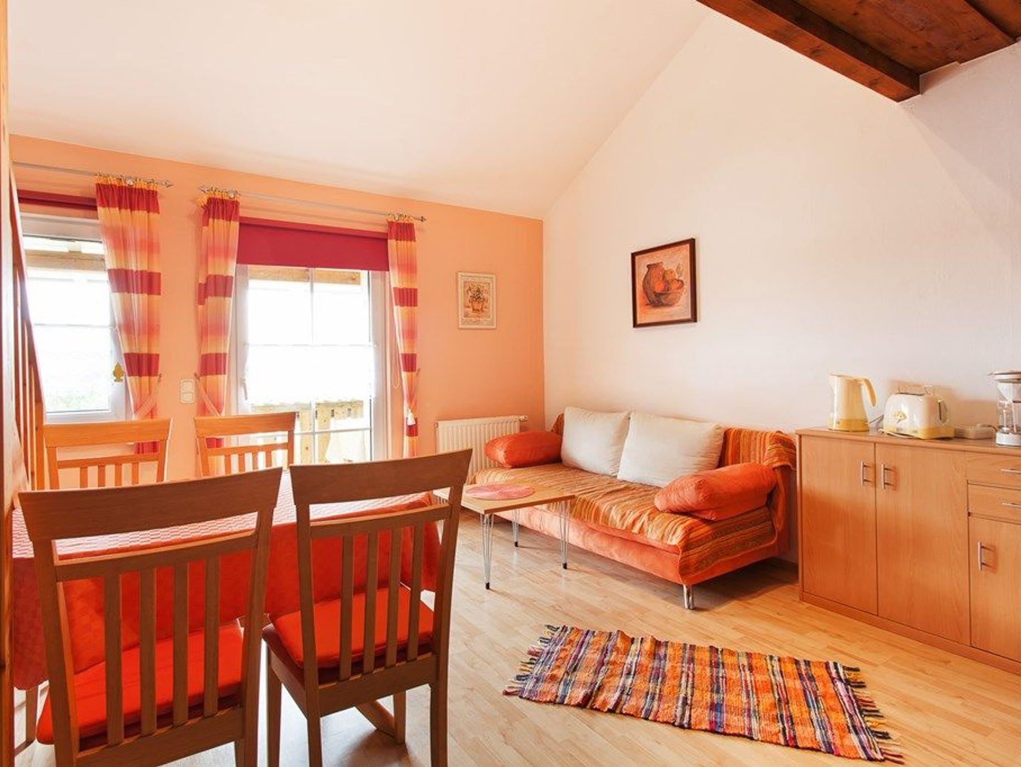 Esstisch). Zur Ausstattung gehört ebenfalls ein Farbfernseher mit SAT-Anschluss.