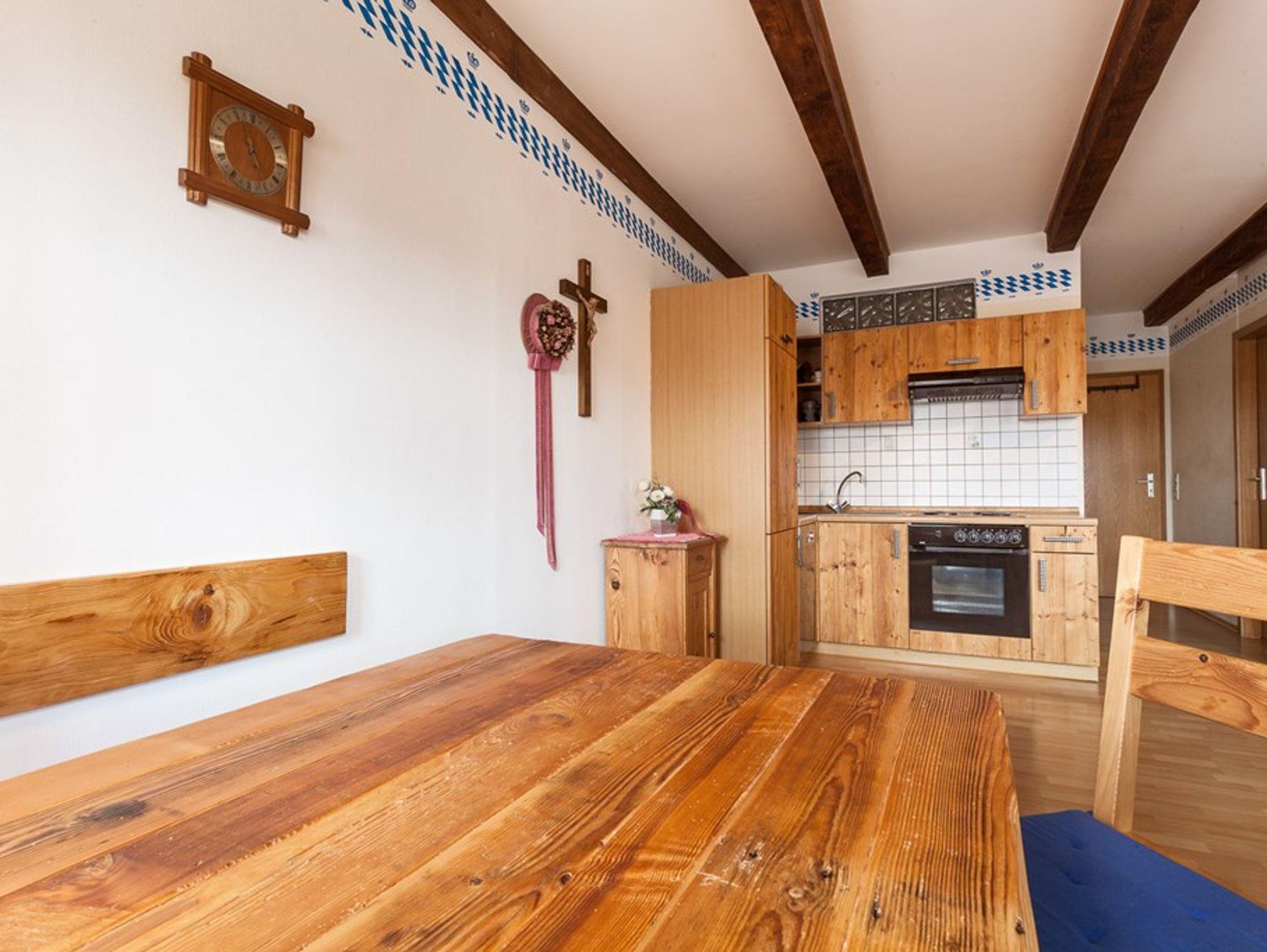 Erker steht ein rustikaler Esstisch mit Eckbank. Die Wohnung verfügt über eine