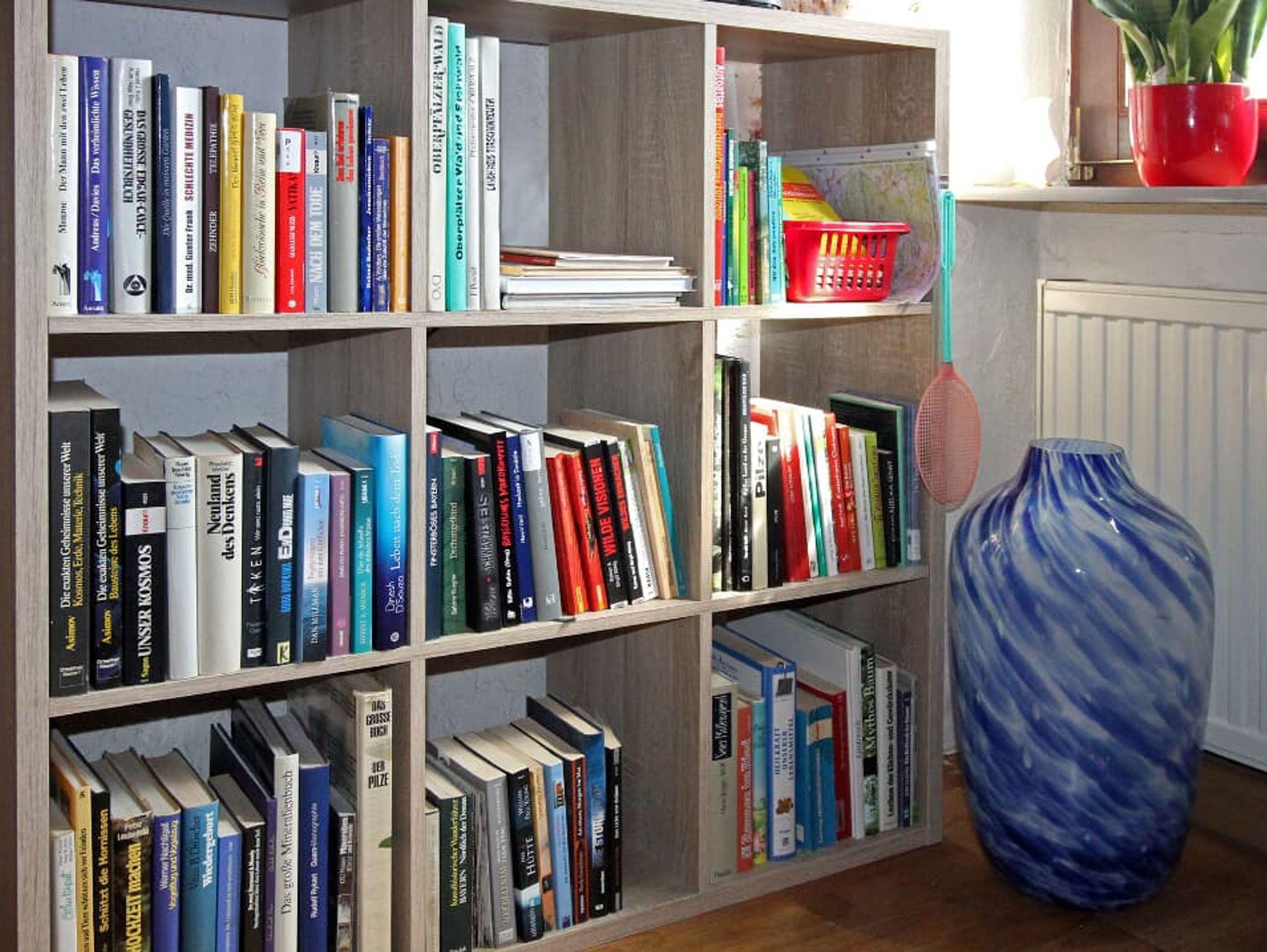 Esszimmer mit Eckbank, Bücherschrank und Leseecke. Kaffeemaschine mit Wasserkocher und Toaster