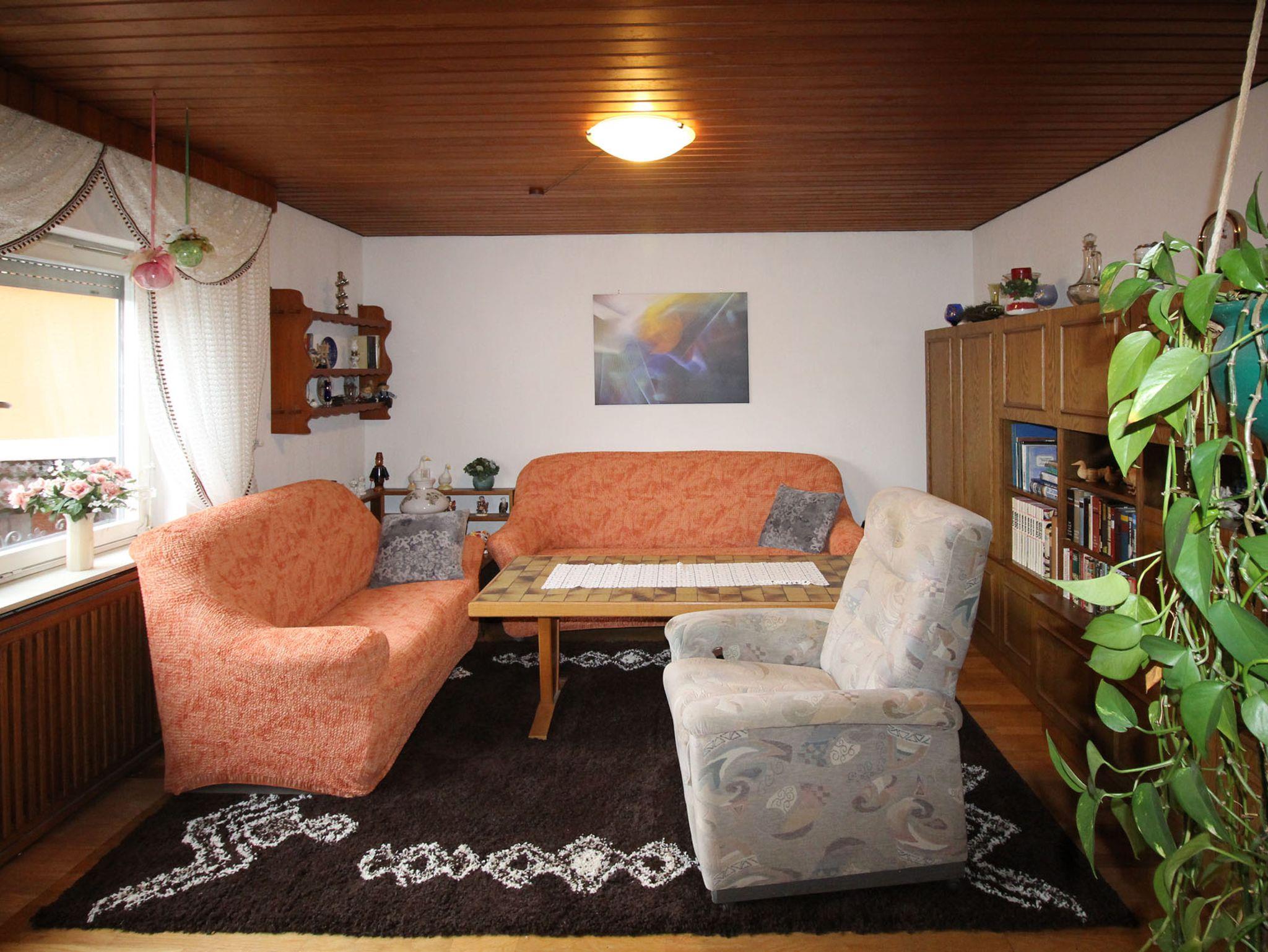 Geräumiges Wohnzimmer mit 2 Sofas, verstellbarem Sessel und Kabel-TV sowie Radio mit CD-Player, Plattenspieler und Kassettendeck.