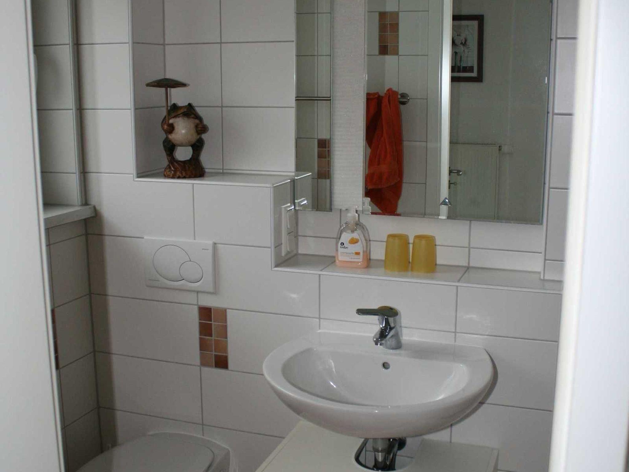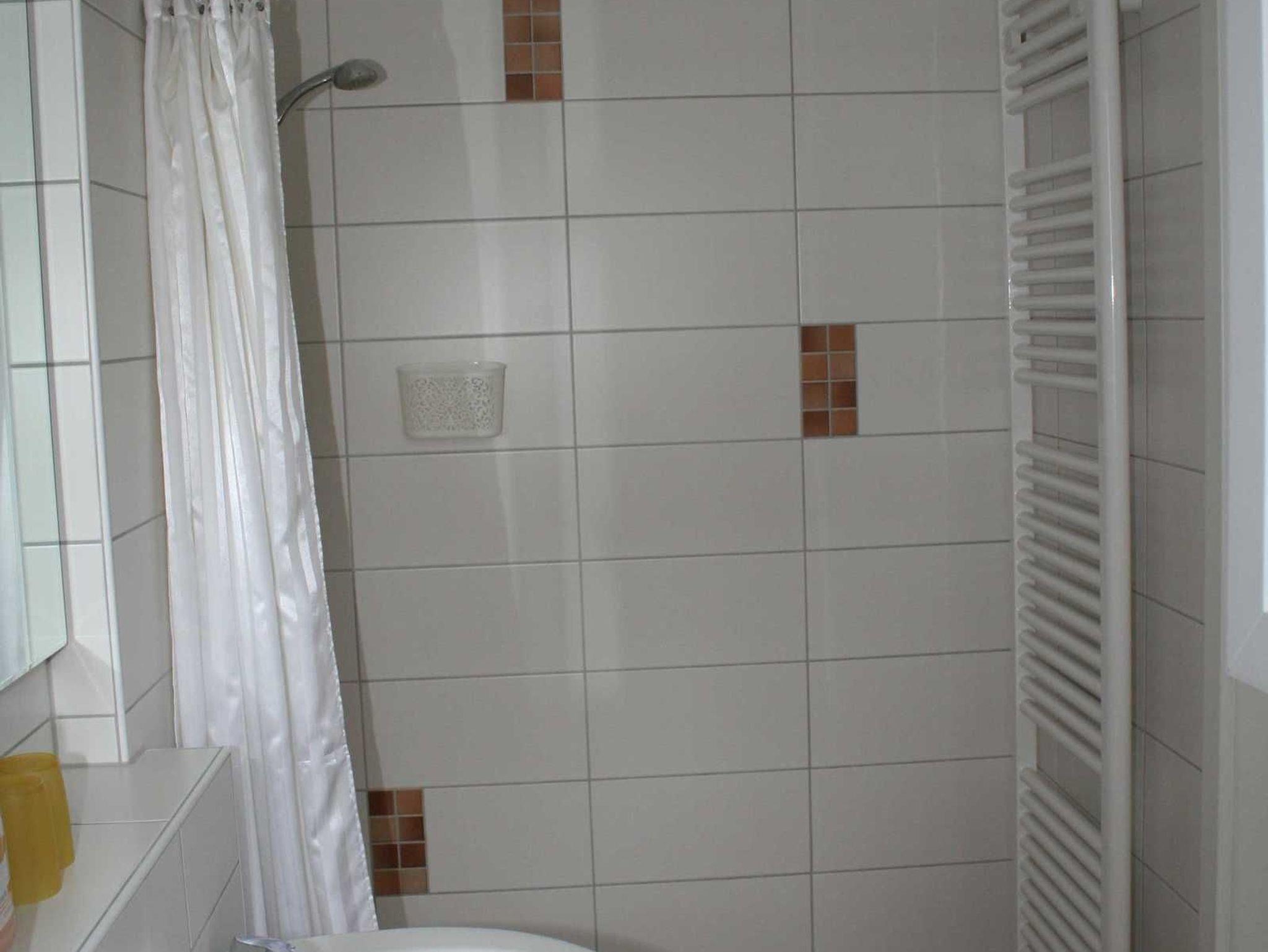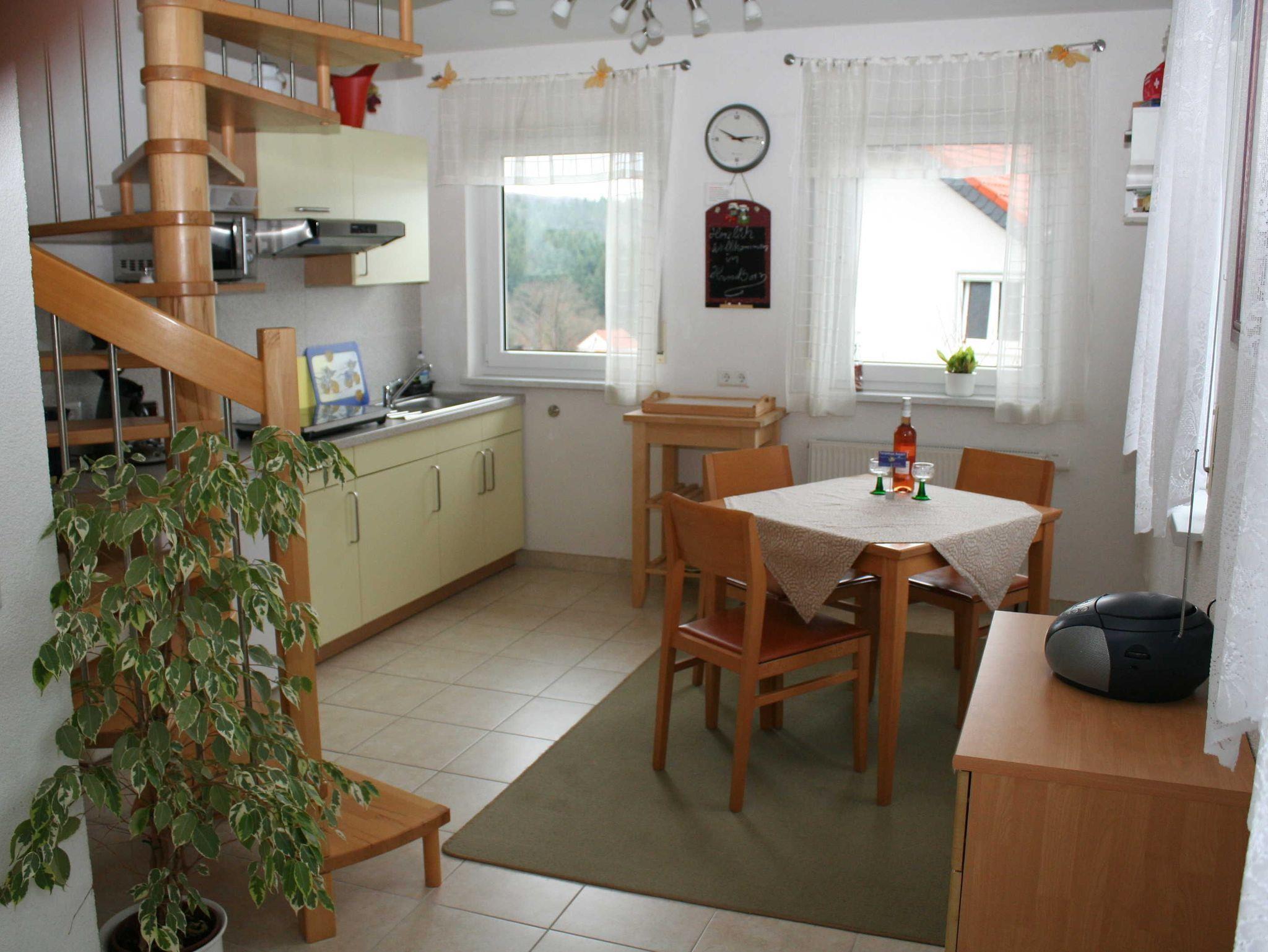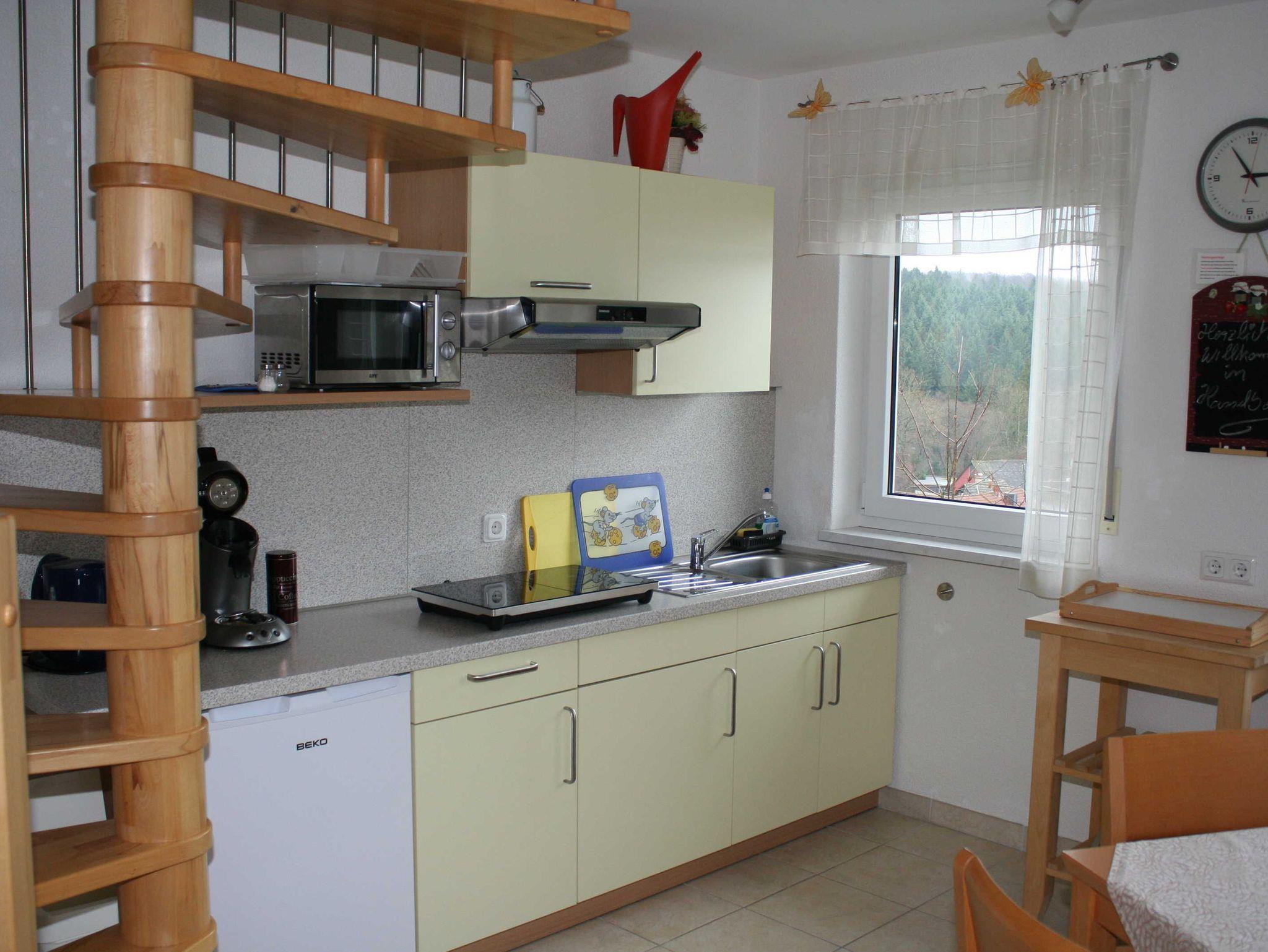 Im Erdgeschoss der Ferienwohnung befindet sich das Bad und eine kleine Wohnküche mit zwei Induktionskochfeldern, kein Backofen, Microwelle, Wasserkocher, Kaffeemaschine mit Filtertüten.
