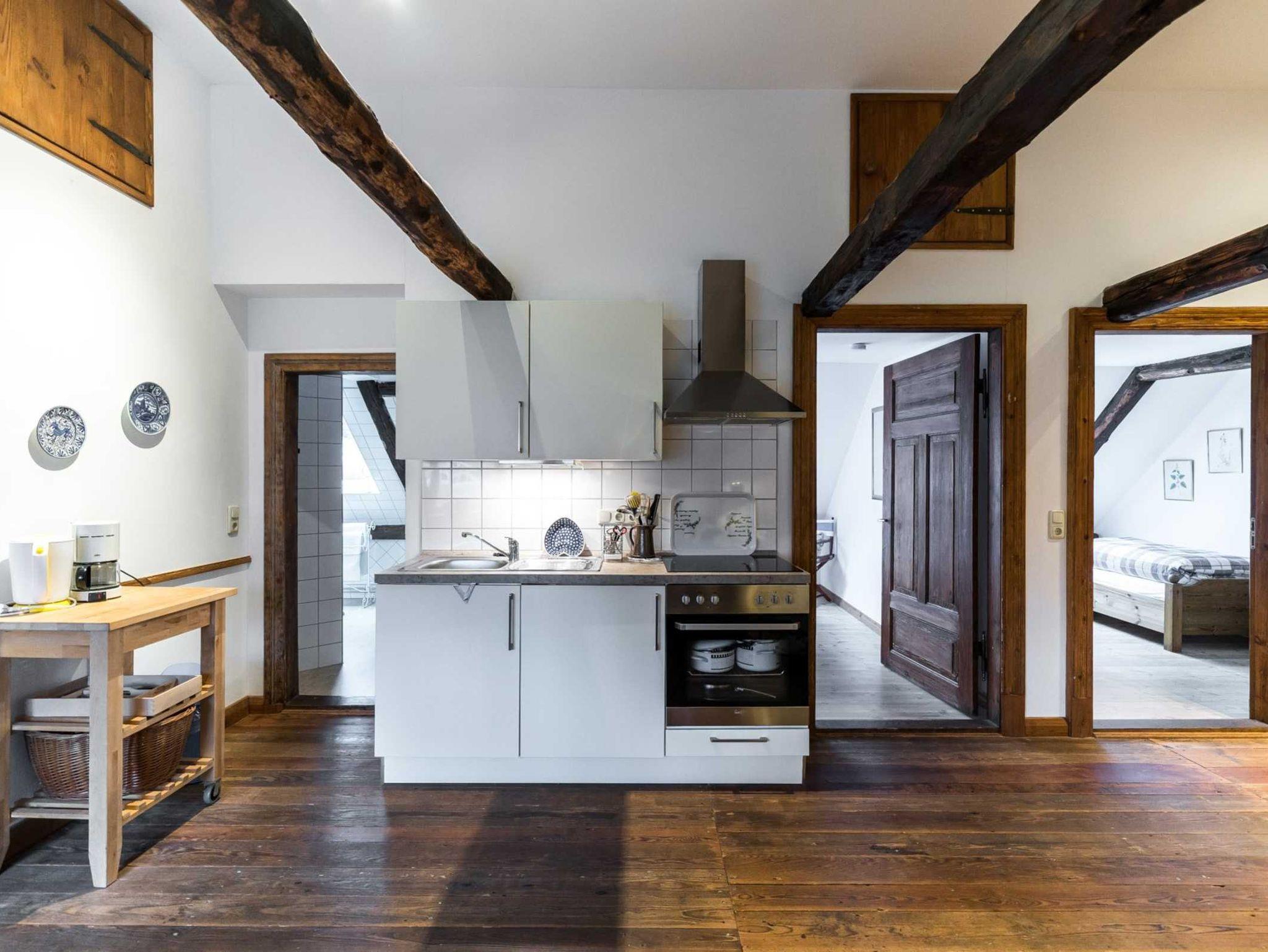 Die Zofenkammer ist eine kleine süße Wohnung (48 qm) im 2. OG des Kavliershauses mit gemütlichem Kaminofen. Der Blick geht in die östliche Lindenallee (Schlafen) und nach Westen über den Ehrenhof.