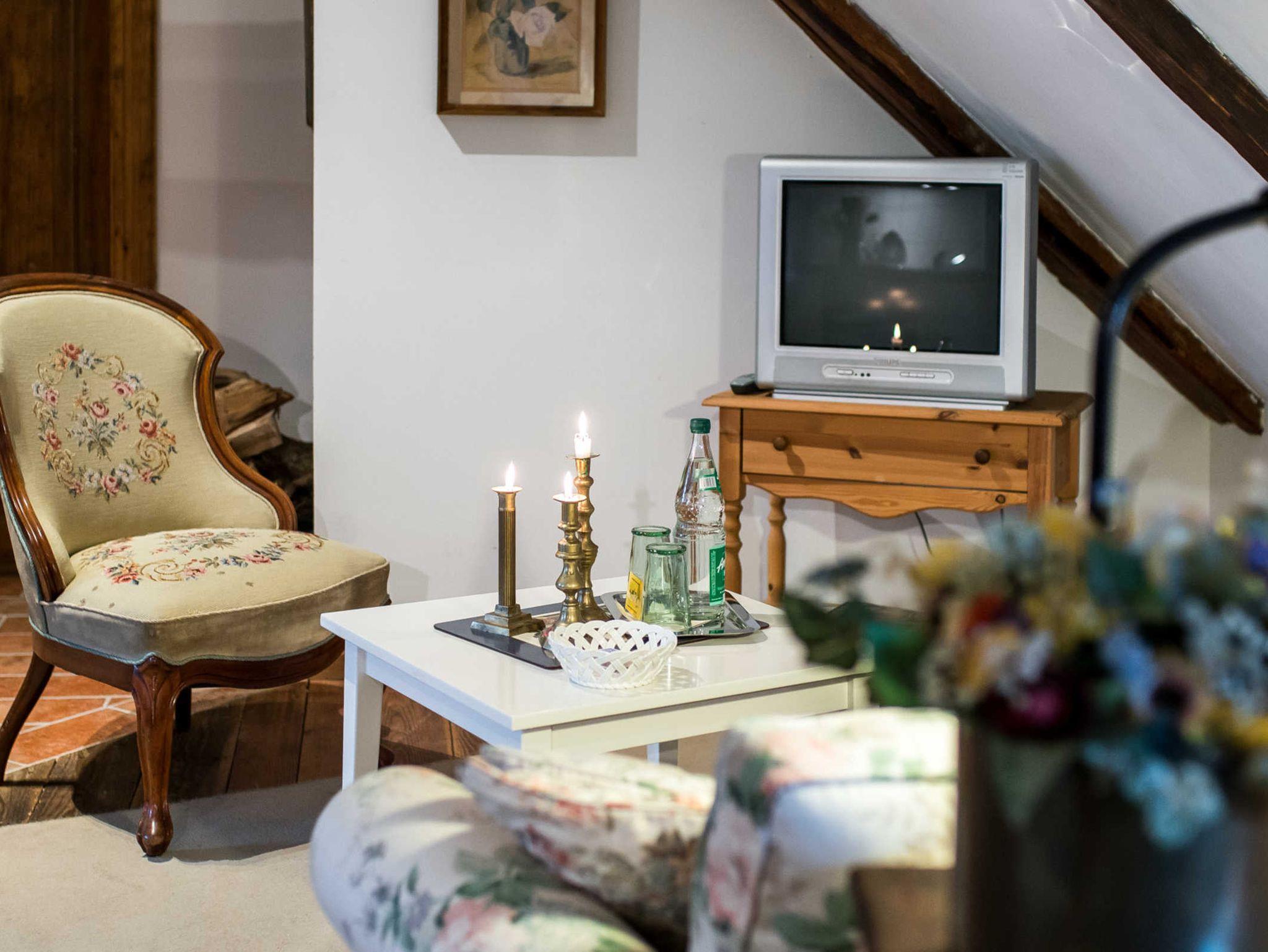 • rustikal, gemütliches Ambiente mit Dachbalken, alten Dielenböden und Türen sowie einem kuschligen Kaminofen mit Sichtscheibe