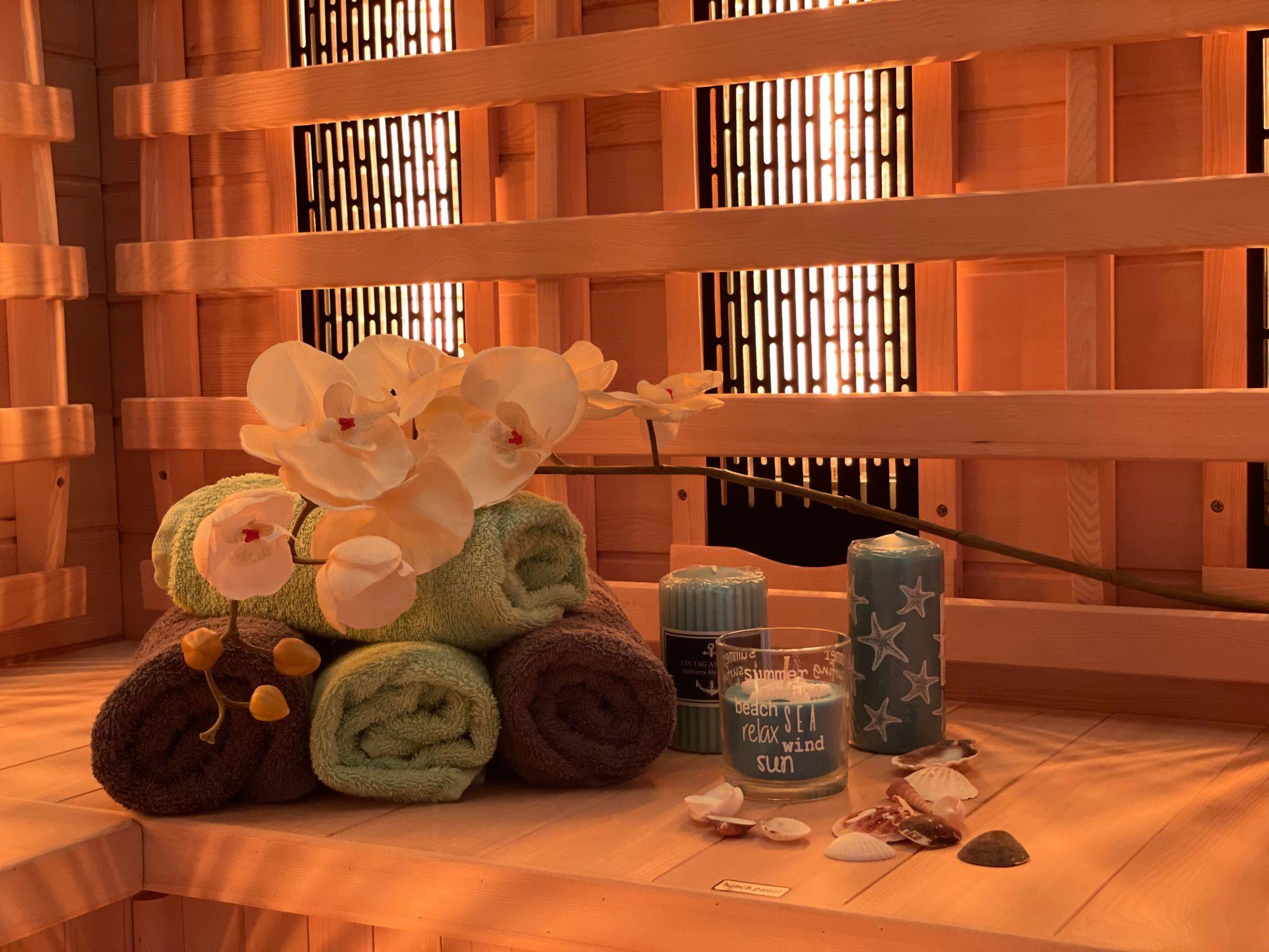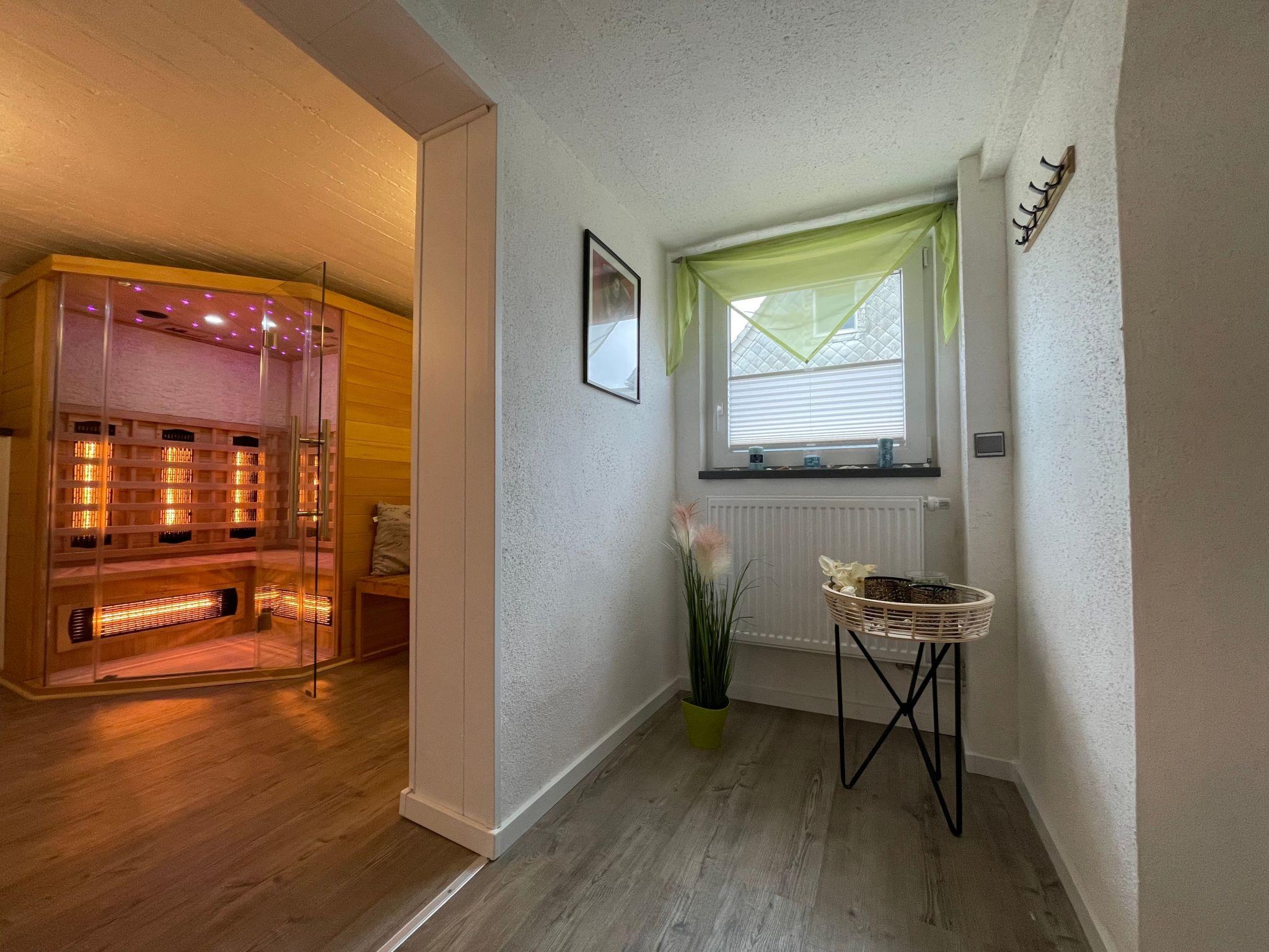 On the ground floor there is a spacious entrance area with a small office corner - from there you can access the small wellness area with an infrared sauna.
