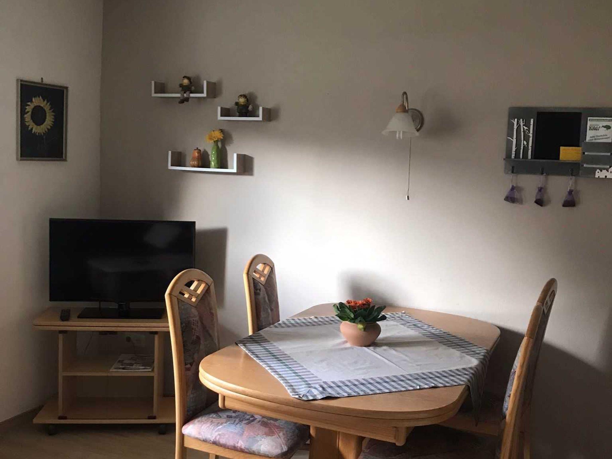 - einem Wohnzimmer mit Polstergarnitur, Essecke, Radio und TV sowie komplett eingerichteter Küchenzeile