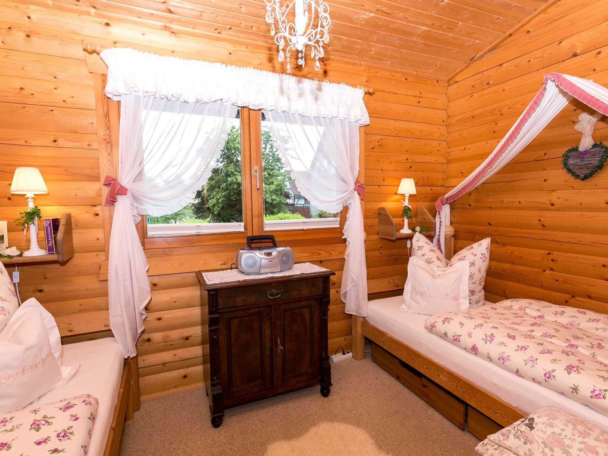 Appartement 1, Blockhaus, ca. 63 m², für 2 - 4 Personen, sehr komfortabel, liebevoll und individuell eingerichtet. 1 Wohnzimmer m. komfortable Schlafcouch, 2 Schlafzimmern, KÜ, DU/WC (Fön), Balkon (16 m²)