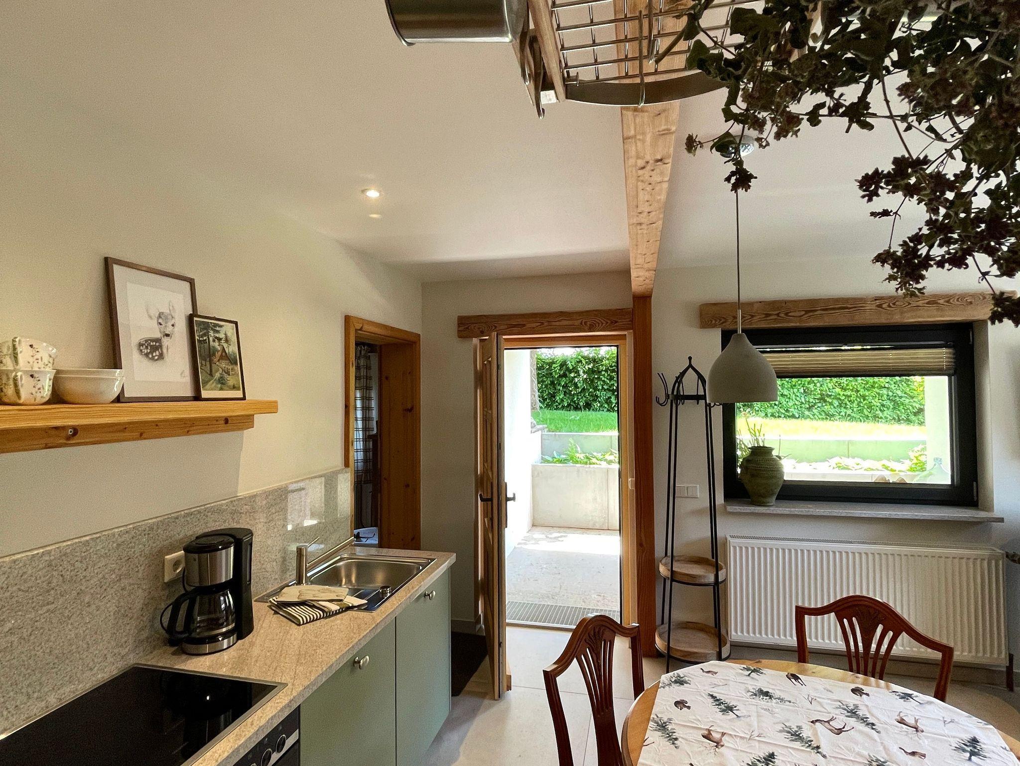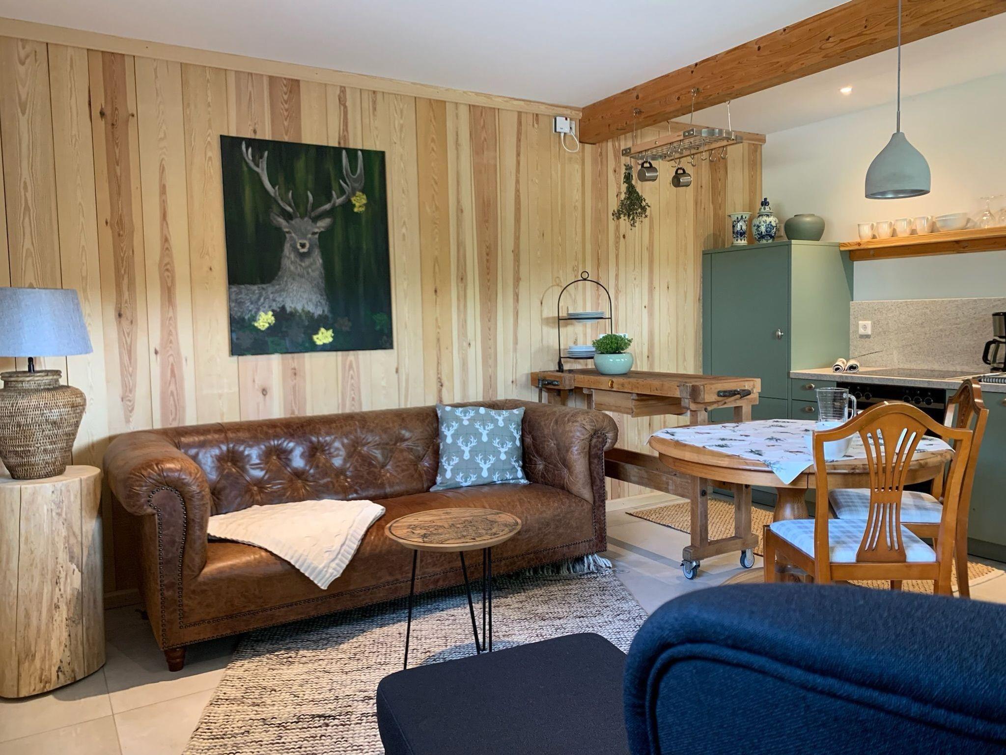 Im gemütlichen Wohnzimmer mit Ledercouch und Wollteppich ist eine hochwertige, komplett ausgestattete Küchenzeile integriert. Ein runder Esstisch und feines Ambiente laden zum Wohlfühlen ein. Von hier haben Sie Zugang zur großen, überdachten Eingangsterrasse mit Holzbank, Tisch und Hängesitz zum entspannen.