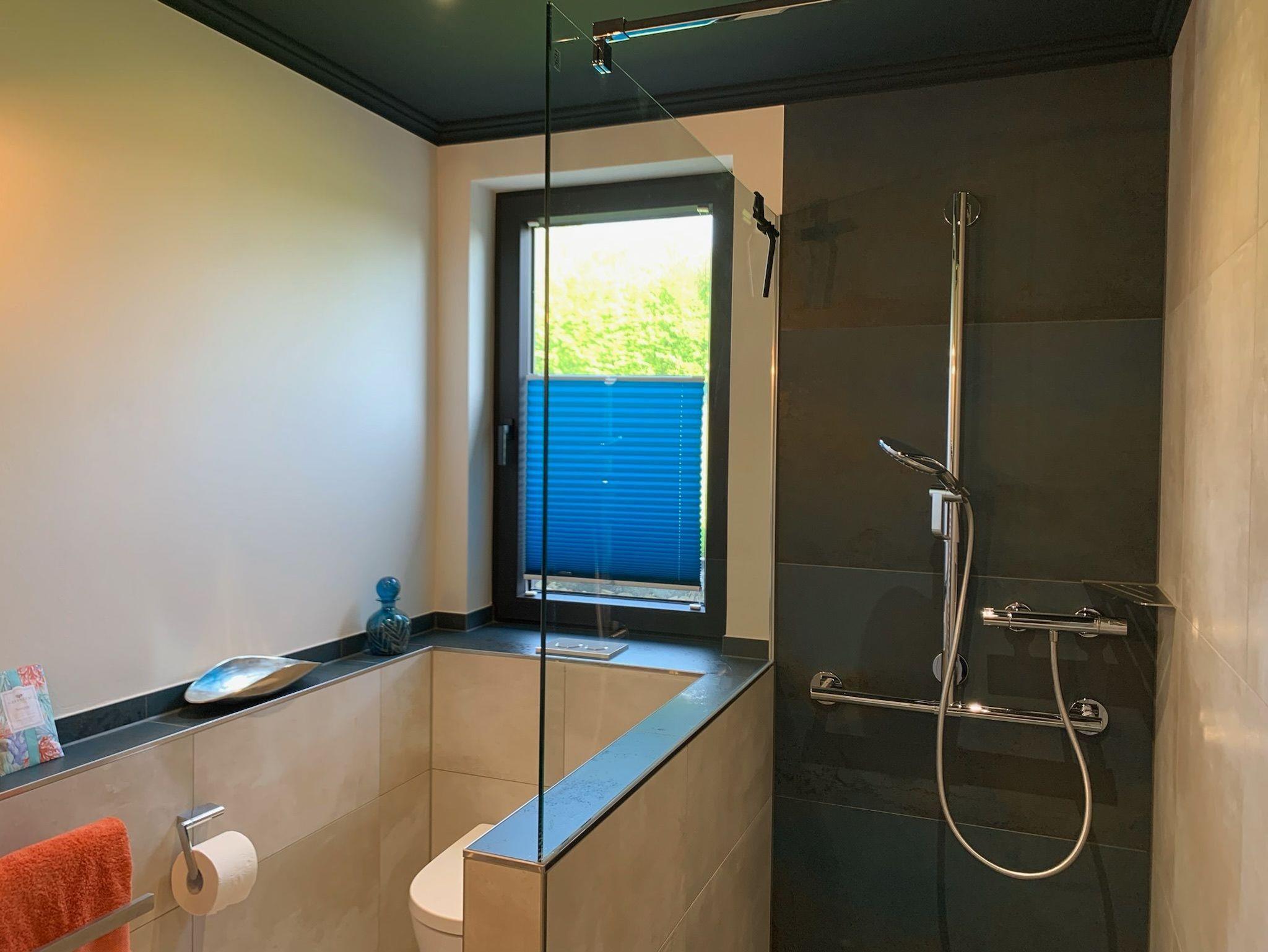 Das moderne Bad ist mit einer barrierefreien Dusche,WC und Designwaschtisch ausgestattet.