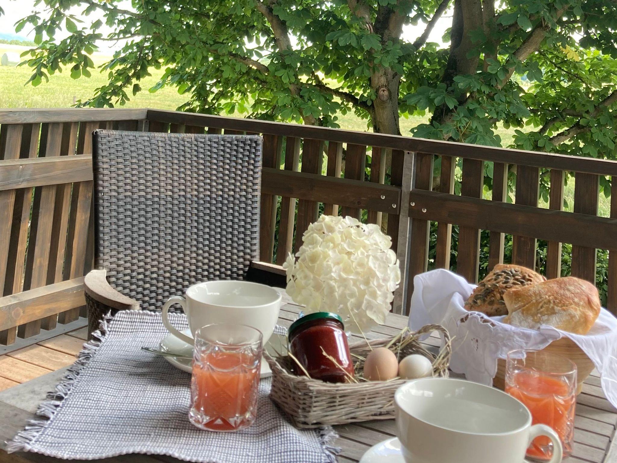 In der großen Ferienwohnung Milan für bis zu 4 Personen können Sie auf 2 überdachten Balkonen die Natur mit freiem Blick über Wiesen und zum Wald genießen.
