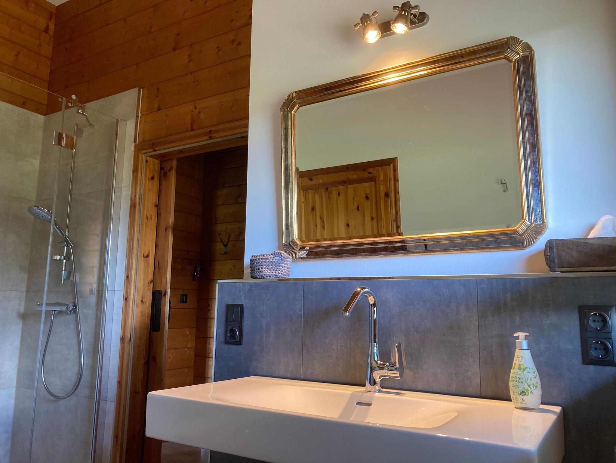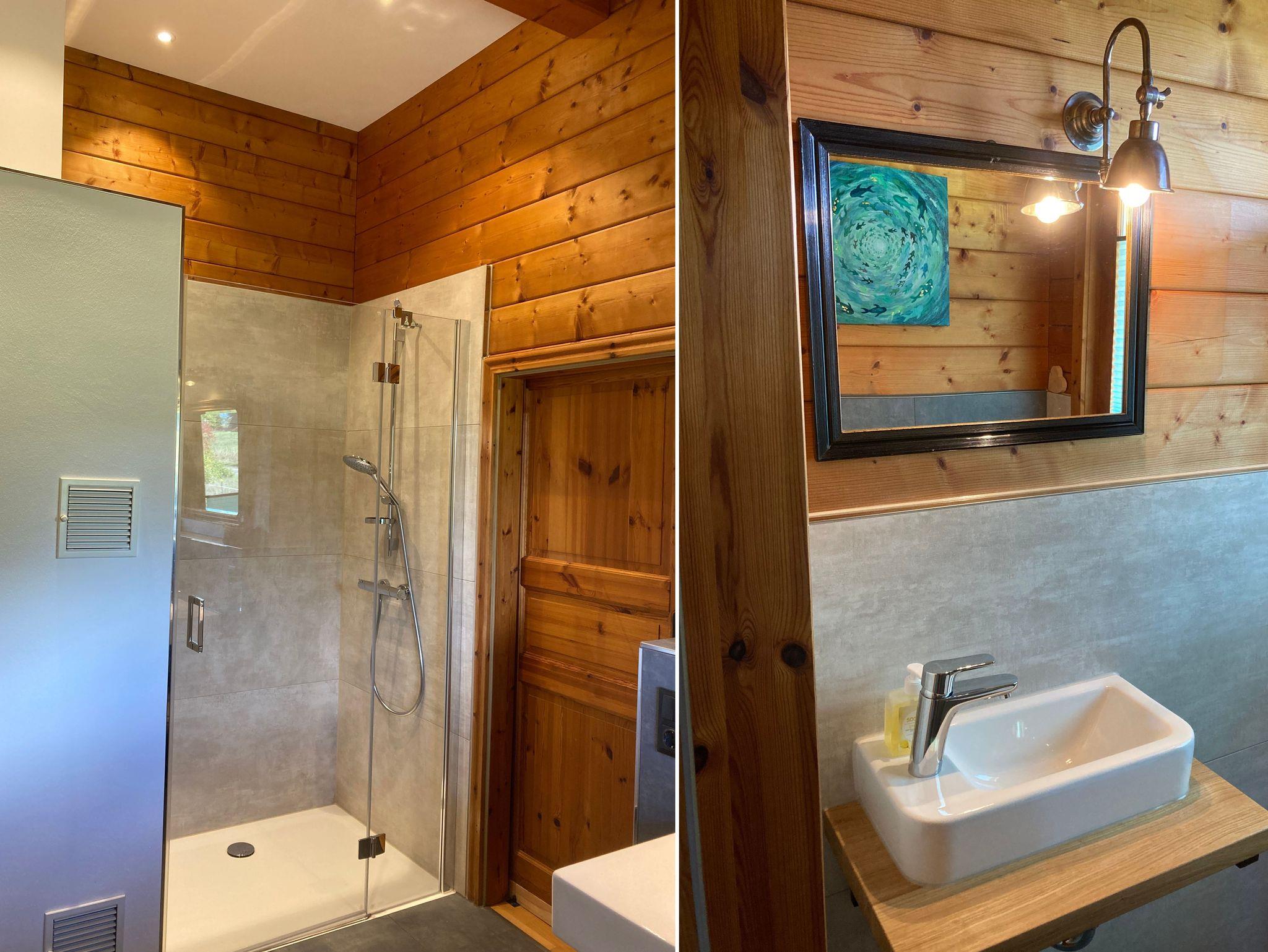 Es stehen ein Boxspringbett und Zirbenkissen, bei Belegung von 3 bis 4 Personen ein weiteres Schlafzimmer zur Verfügung. Im Bad befindet sich eine große Dusche und ein Design Waschtisch mit WC separat.