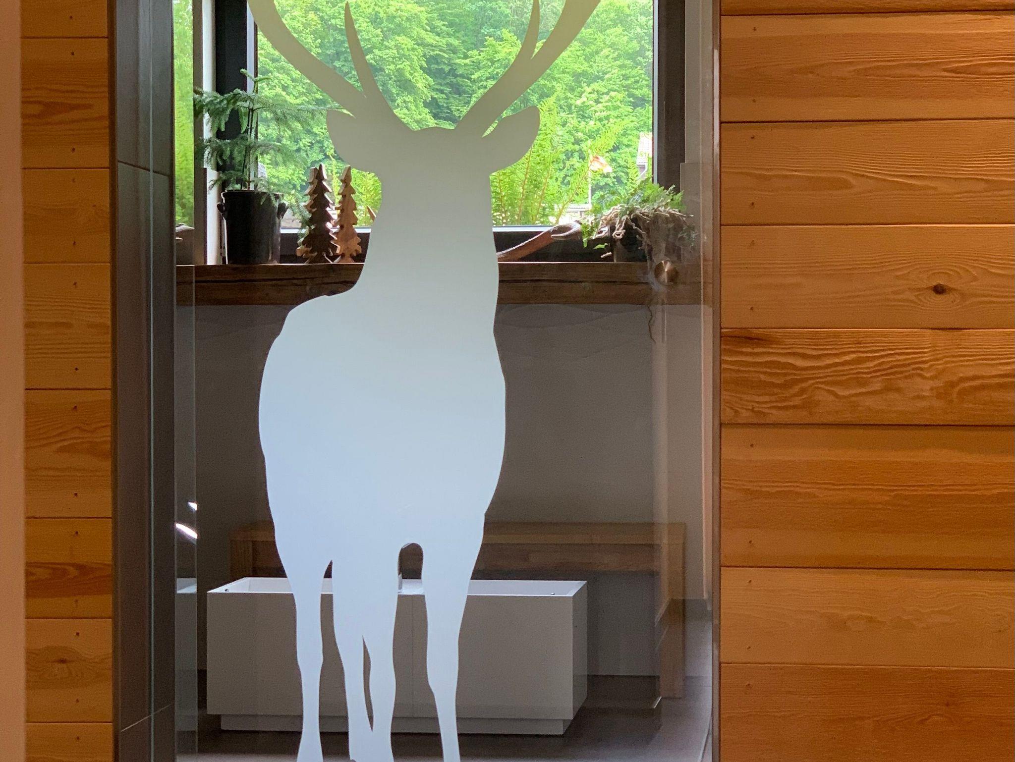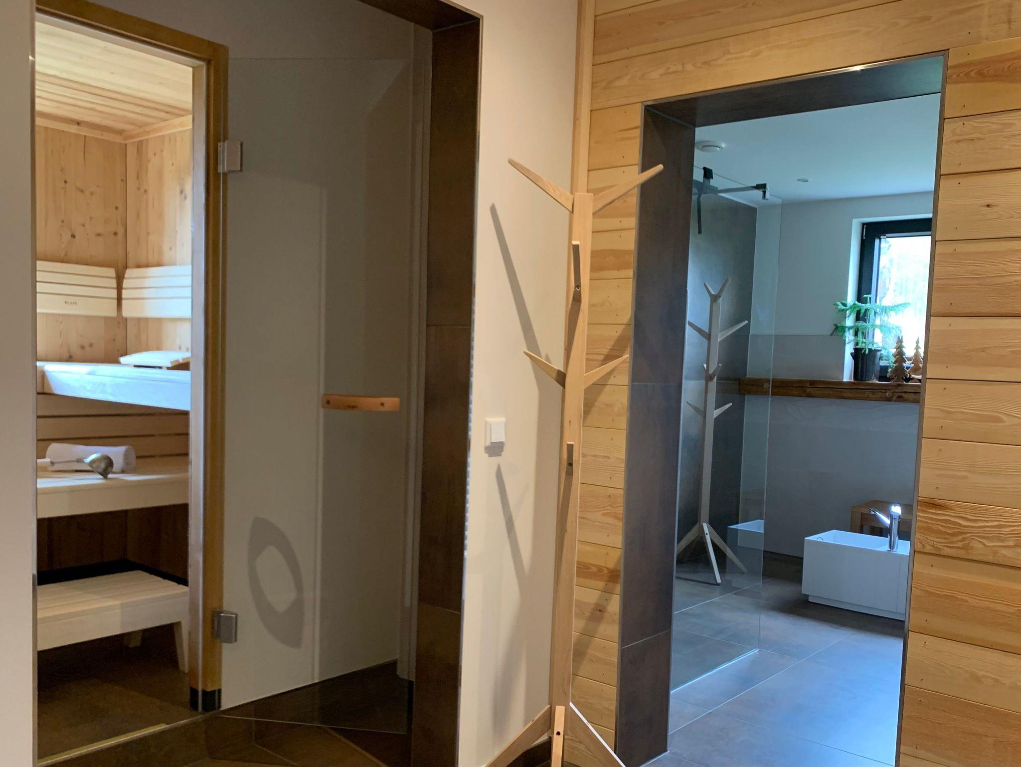 Zu dieser Wohnung gehört unser Spa-Bereich mit einer Sauna, Dusche mit Fußbecken und ein Ruheraum mit Waldsofas.