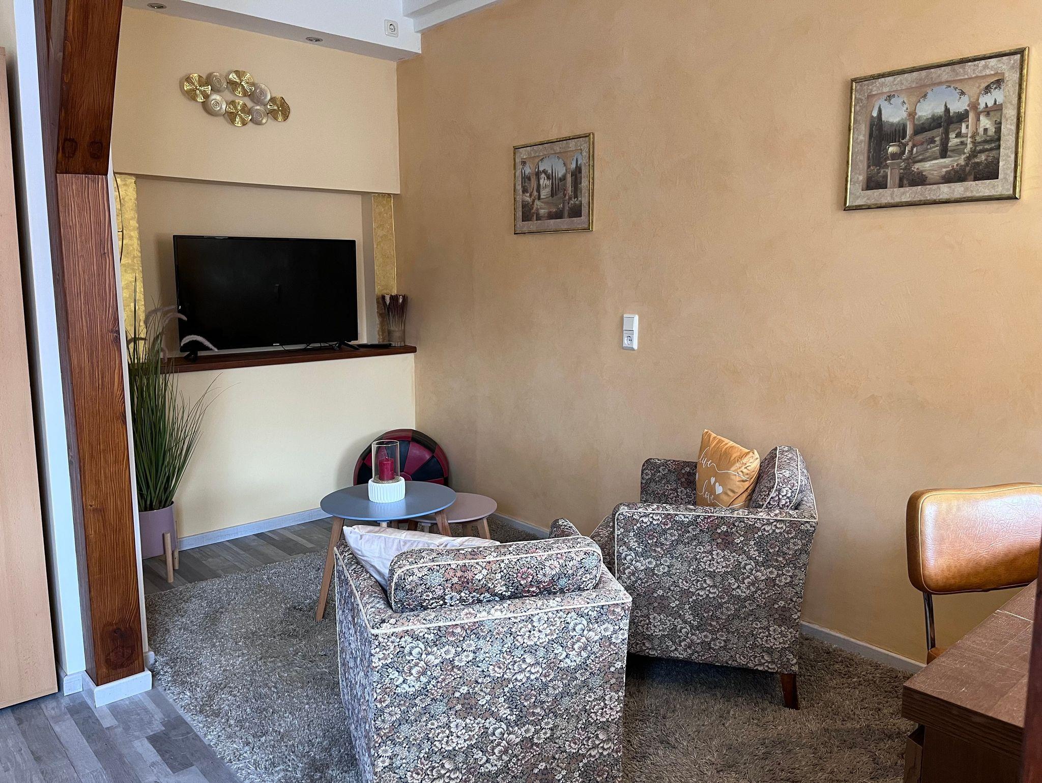 Die Ferienwohnung befindet sich im Erdgeschoss der Villa Genzel. Sie verfügt über ein Wohnzimmer mit angrenzendem Schlafzimmer sowie einem zweiten Schlafzimmer mit eigenem Arbeits- und Sitzbereich. Die Küche ist voll ausgestattet und das Bad verfgt über eine ebenerdige Dusche.