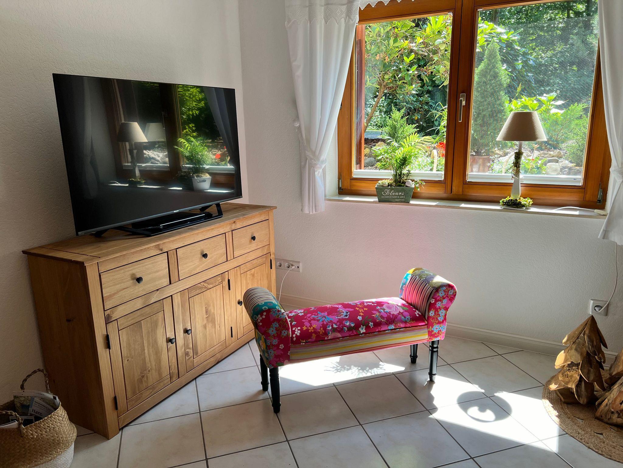 Appartement 2, Blockhaus, ca. 60 m², Parterre, für 2 Personen, sehr komfortabel, liebevoll und individuell eingerichtet. 1 Wohnzimmer, 1 Schlafzimmer, KÜ, DU/WC (Fön), Freisitz, Microwelle, Kabel-TV, Video-Rekorder, Musikanlage, inkl. Bettwäsche, Tischwäsche (Handtücher bitten wir mitzubringen), zuzüglich Endreinigung und Kurtaxe.