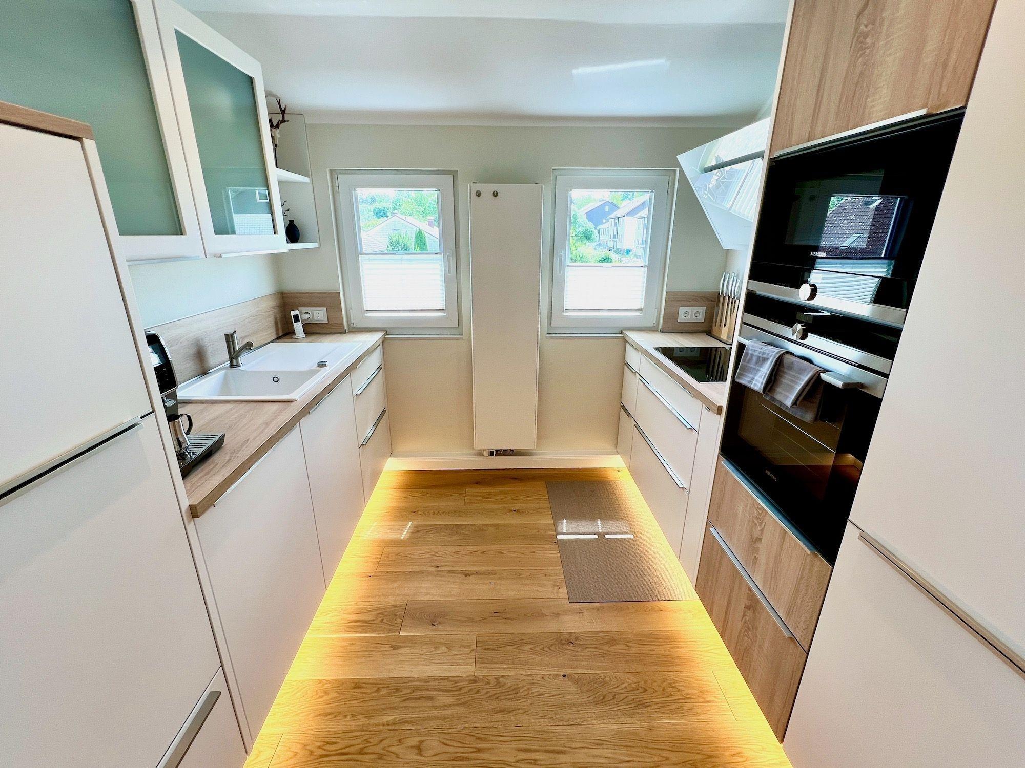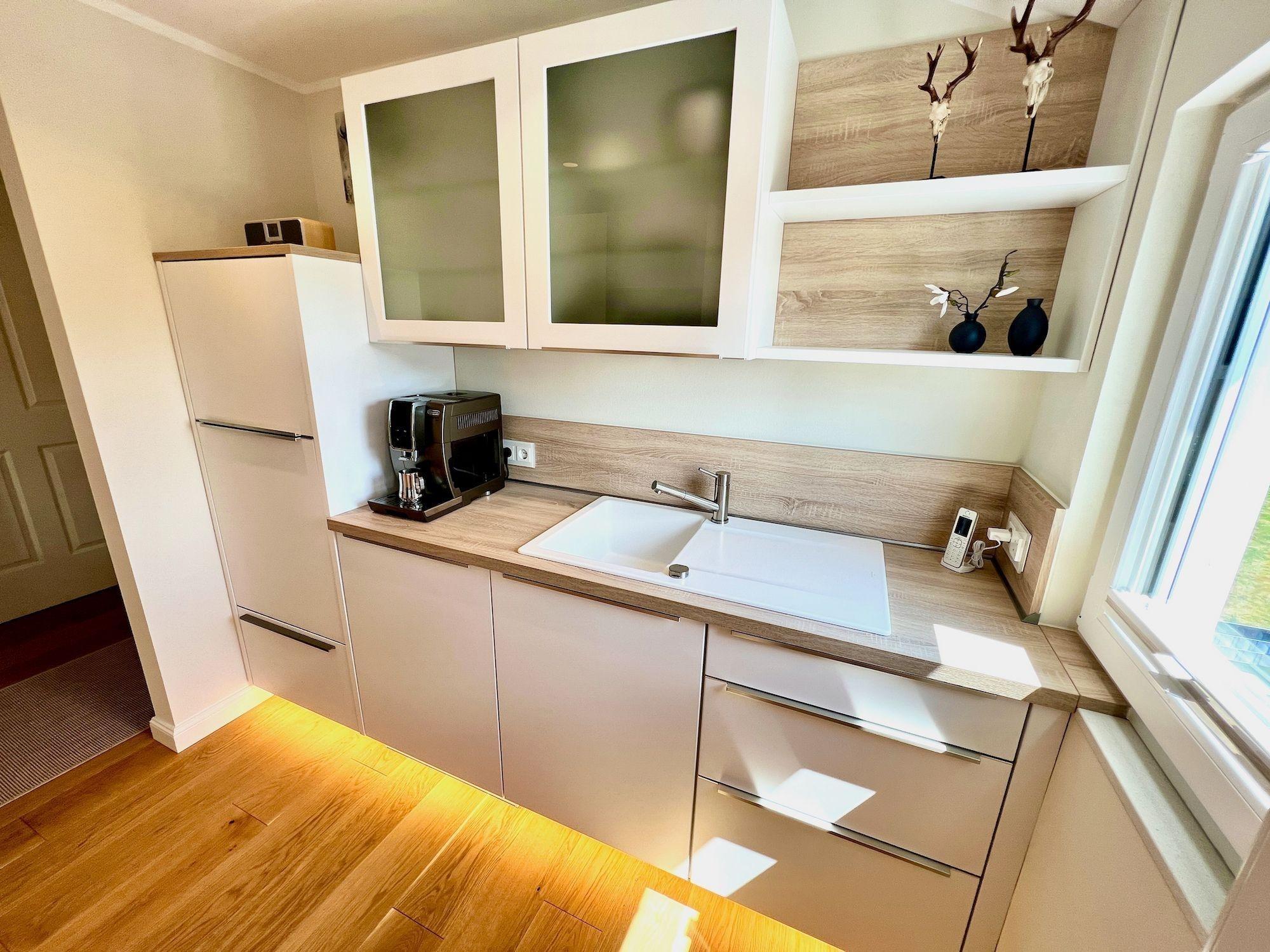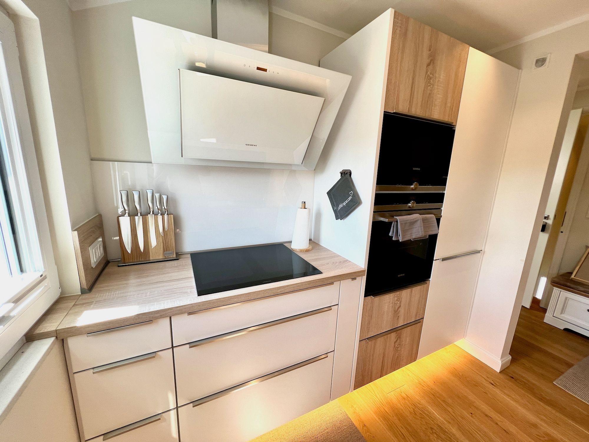 Eine vollausgestattete moderne Küche mit sehr hochwertiger WMF Ausstattung, Küchengeräten von Siemens mit Induktionskochen, Geschirrspülmaschine, Mikrowelle, Waschmaschine und Trockner, uvm. steht für Sie bereit.