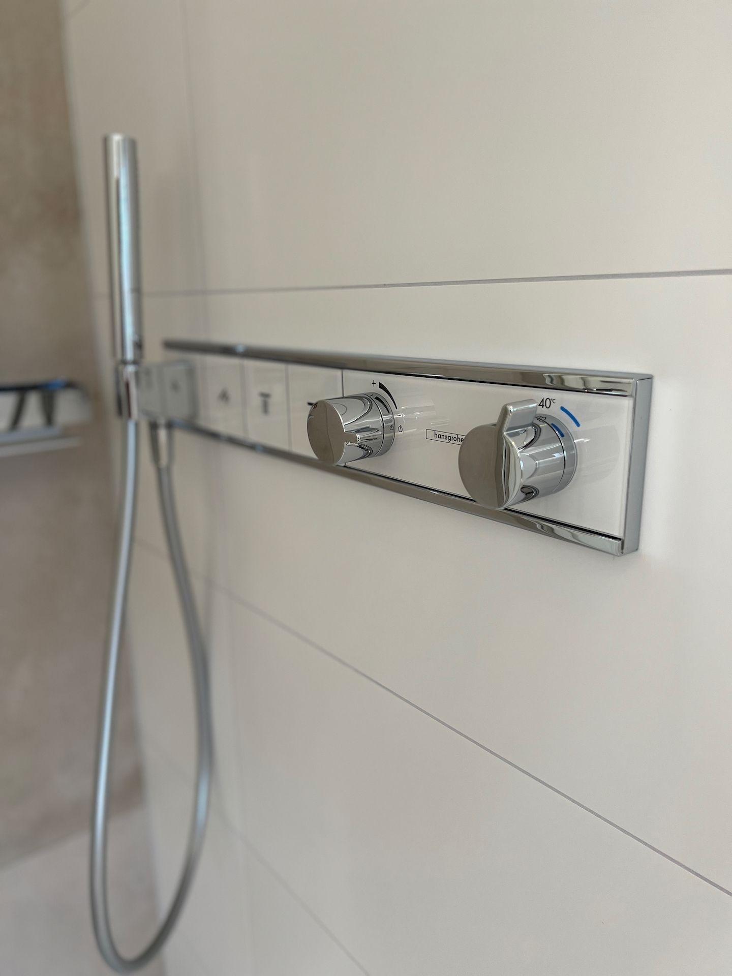Badezimmer mit bodenbündiger Funktionsdusche, Haartrockner und Radio