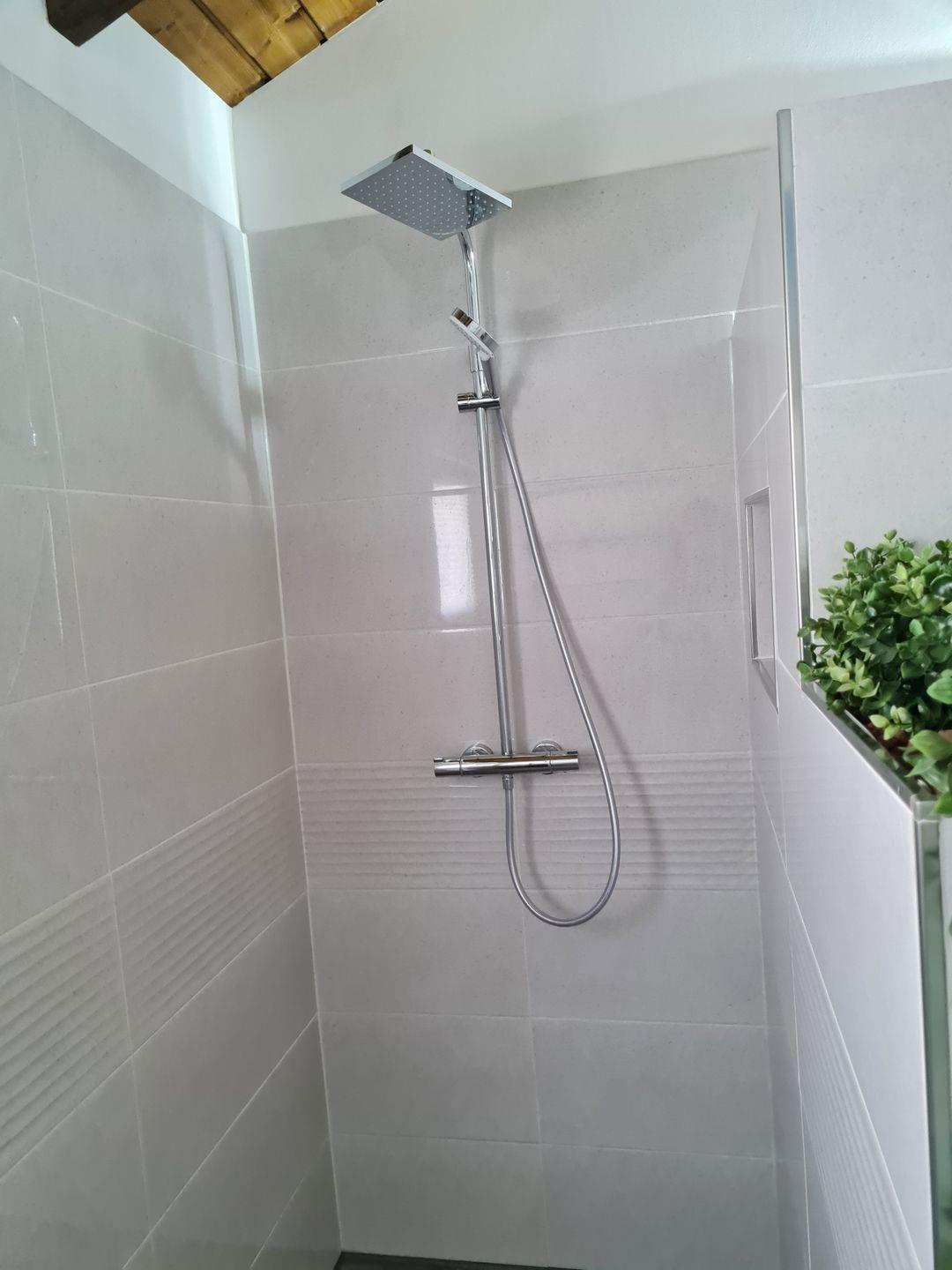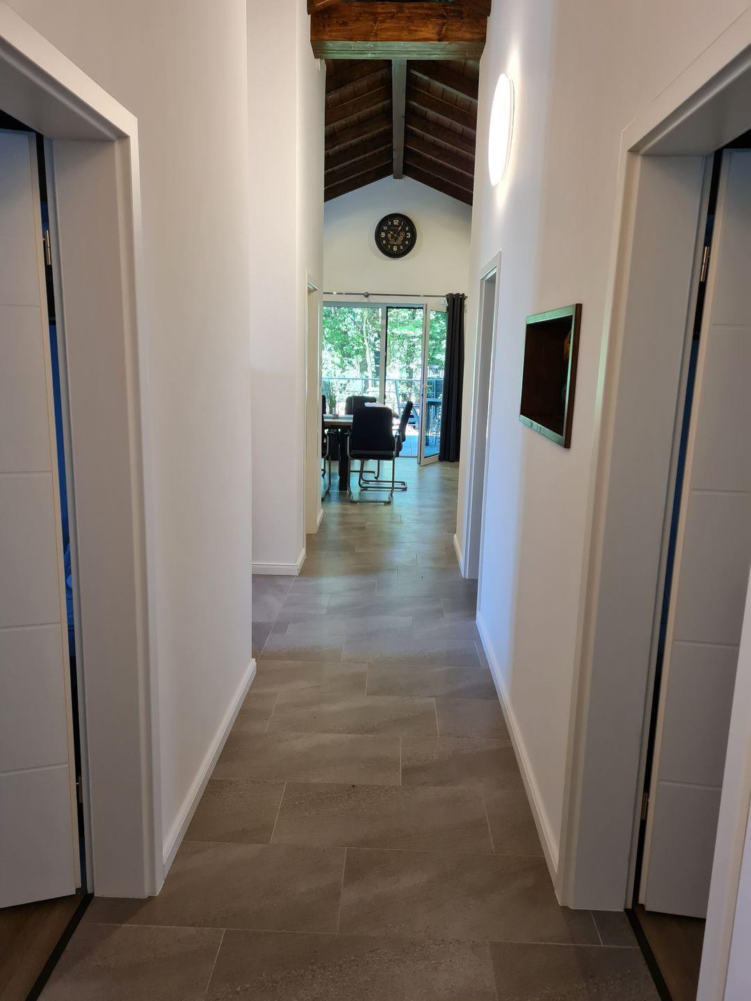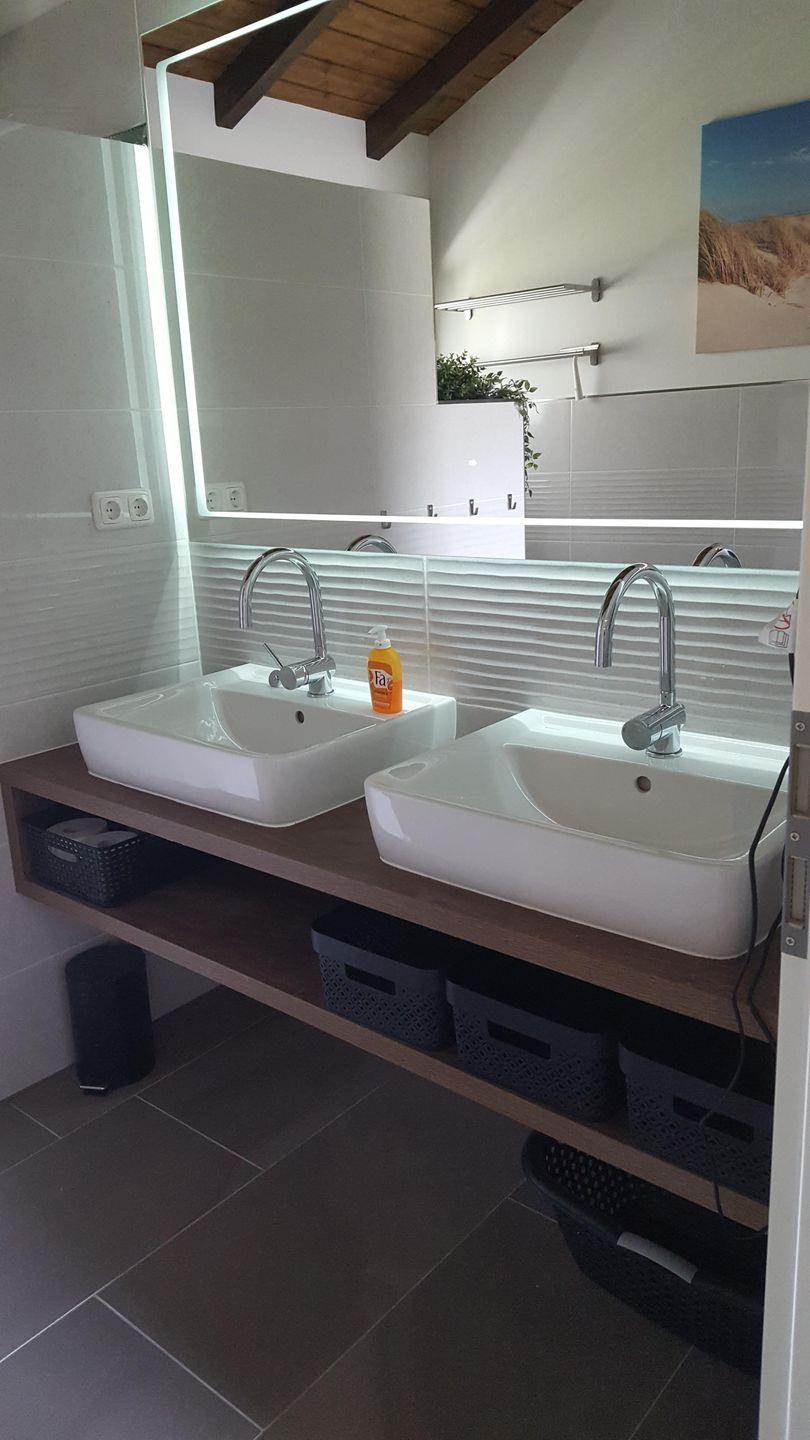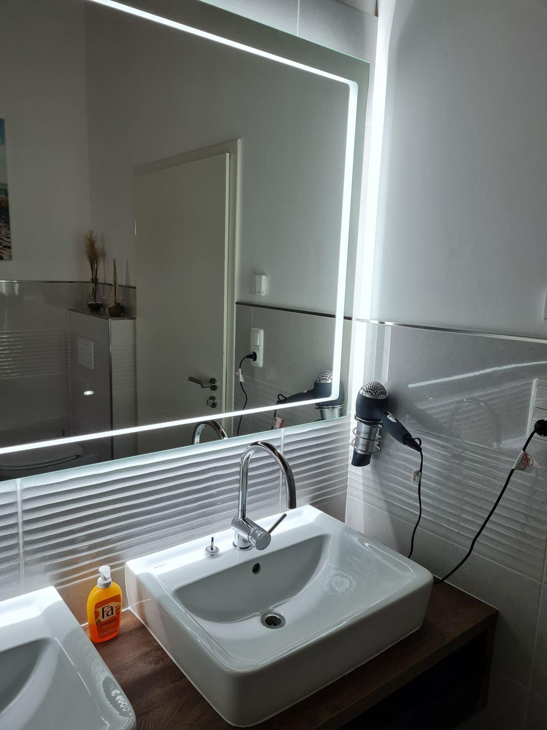 Im Tageslichtbad befinden sich zwei Waschtische, eine bodengleiche Dusche und eine Toilette. Zusätzlich gibt es ein Gäste WC mit Waschbecken