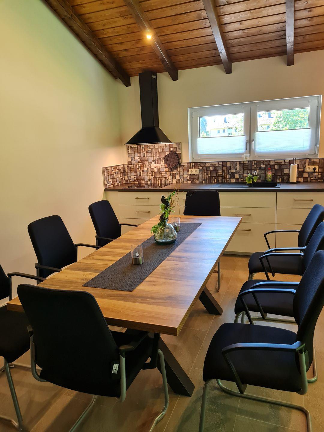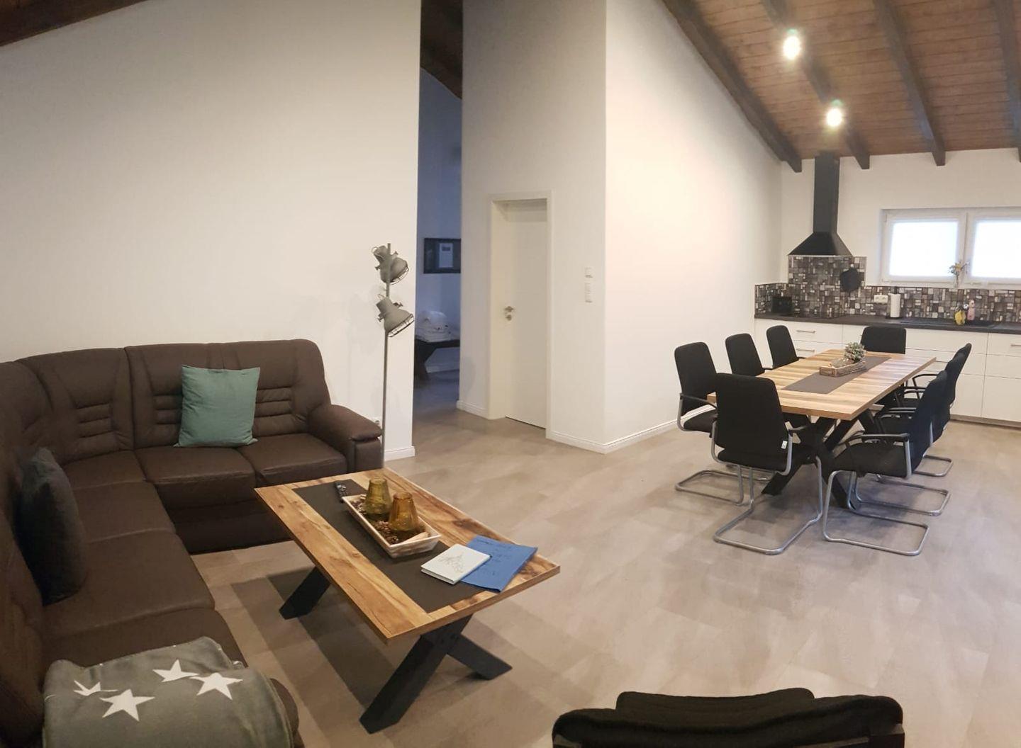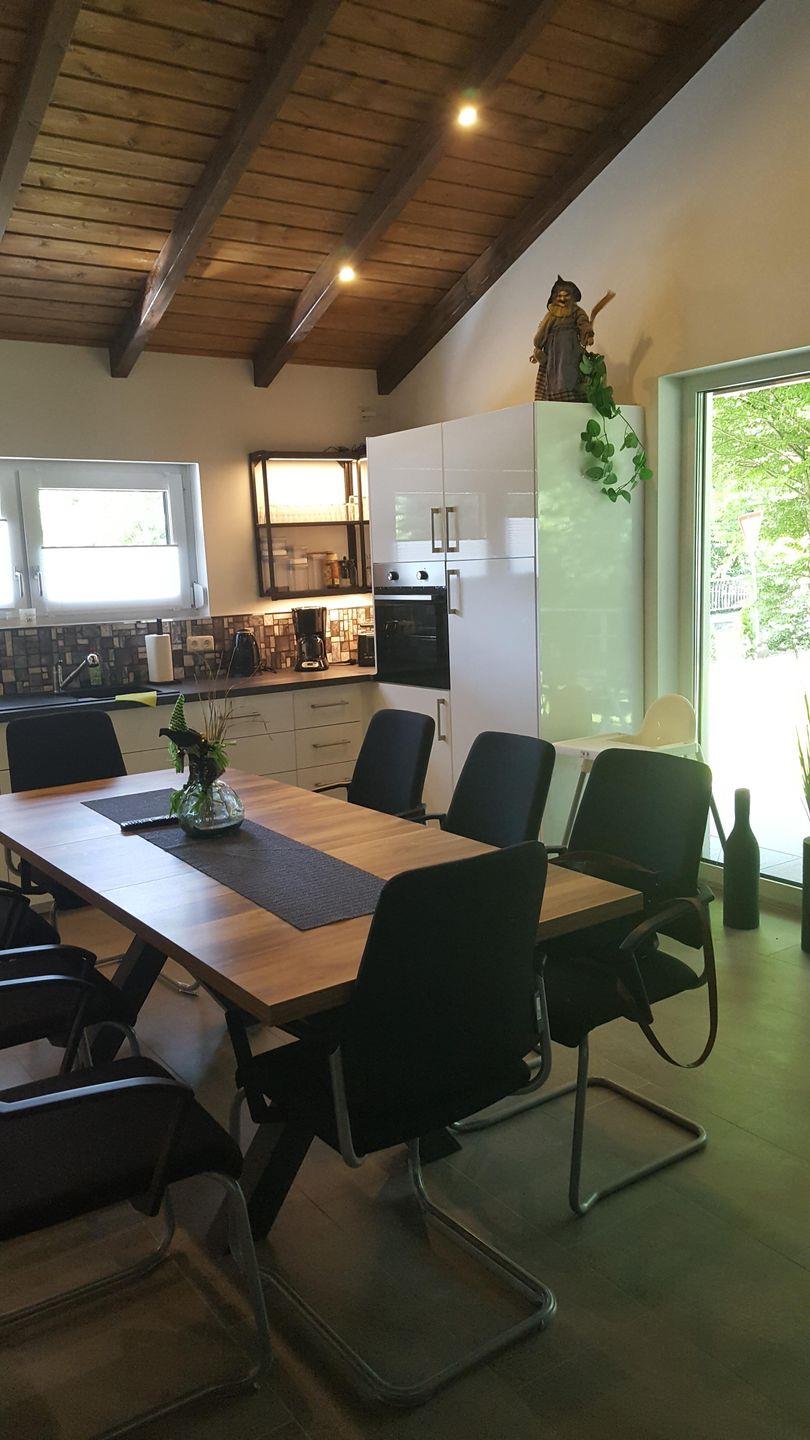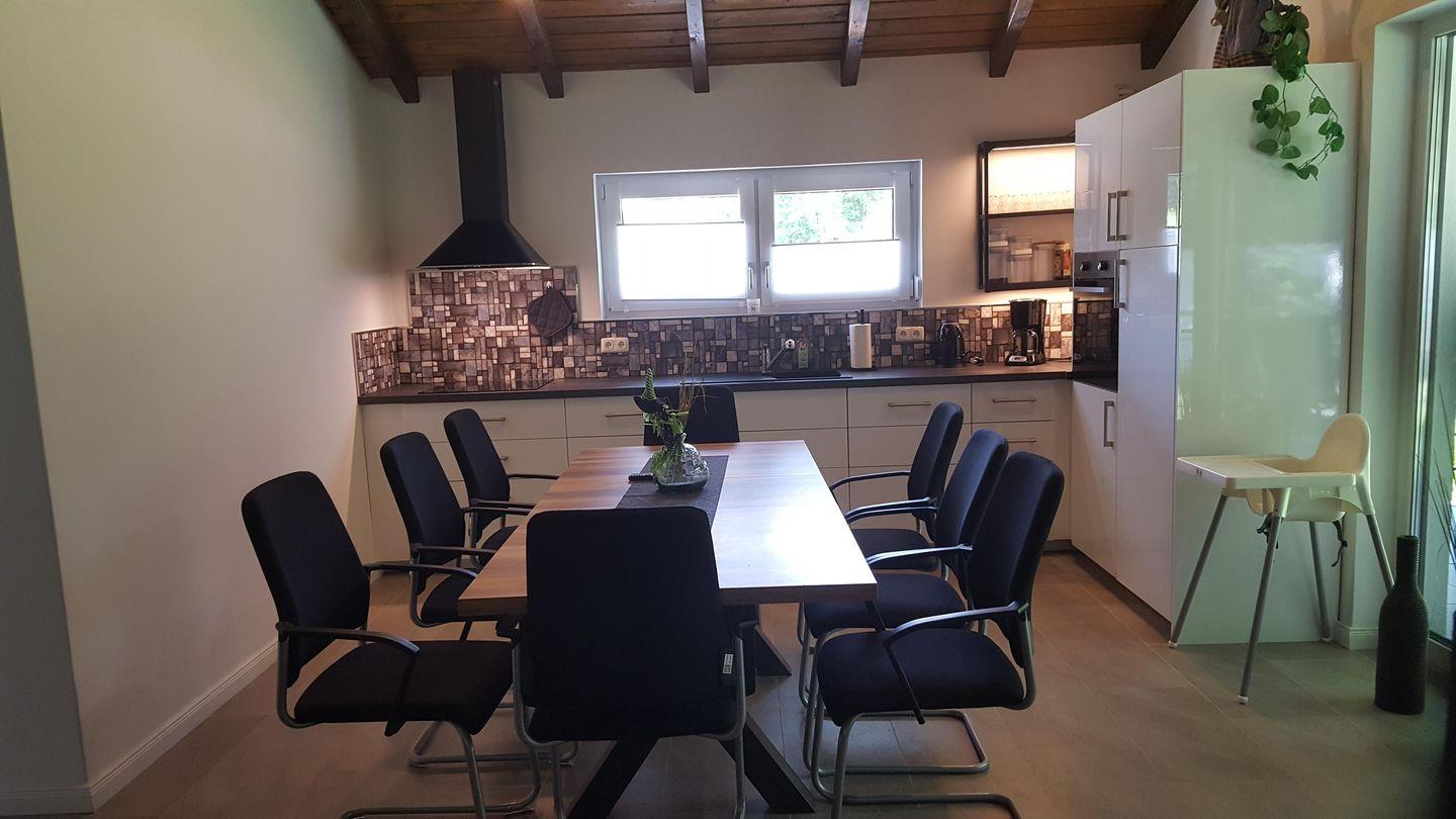 Die große Ess- und Wohnlandschaft mit komplett ausgestatteter Küchenzeile lädt am Esstisch in großer Runde ein. Das moderne Ecksofa bietet ausreichend Platz für gemütliche Fernsehabende.
