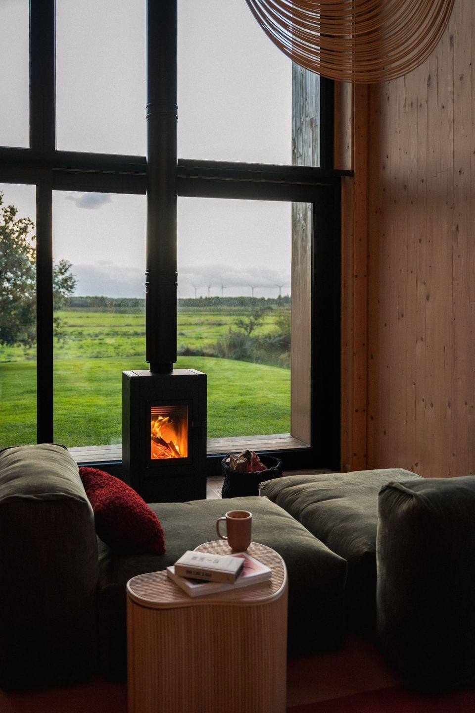 Das Wohnzimmer verfügt über einen Kamin und eine Sofalandschaft, auf der Ihr euch einkuscheln könnt. Der Blick in die Weite begeistert bei jedem Wetter - hier fühlt sich Stubenhocken an wie Draußensein. Ihr könnt Rehe und Fasane beobachten und blickt über die Feuchtwiesen bis hin zu den Windrädern am Horizont. Eine Sitzbank unter der Treppe bietet Ablagefläche und Stauraum. Bei eurer Anreise findet Ihr einen Korb mit Feuerholz vor, der für 2-3 Tage ausreicht. Solltet ihr mehr Holz benötigen, gibt es in der Umgebung jede Menge Supermärkte und private Anbieter.