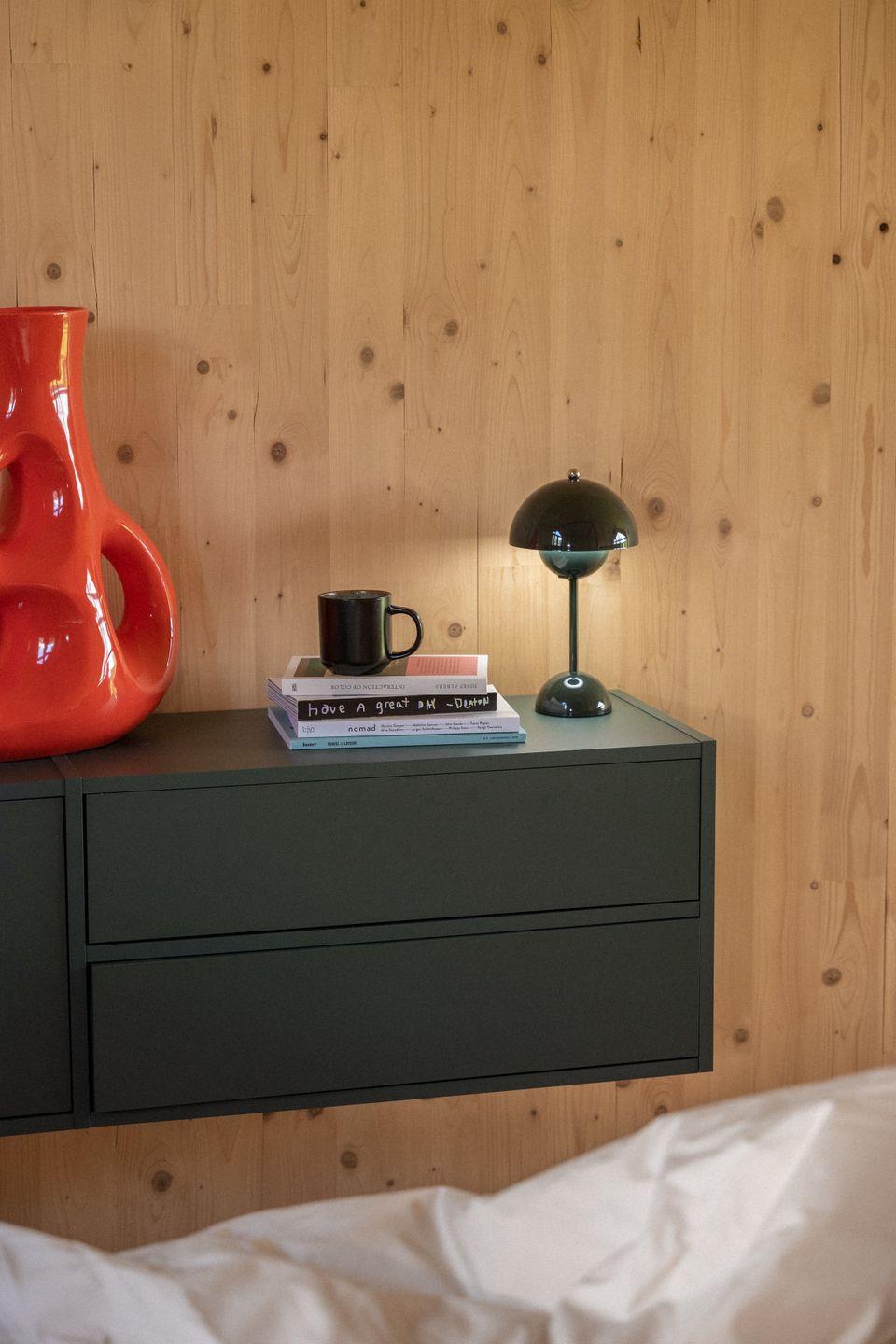 Ein 1,80 Meter breites Himmelbett mit mittelharter Matratze lässt euch richtig gut und komfortabel schlafen. Es stehen zwei Kissengrößen zur Verfügung (80x80cm und 40x80cm) sowie wahlweise eine große Bettdecke (240x220cm) oder zwei kleine in Standardgröße. In der Kommode könnt ihr weitere Kleidung verstauen. Eine Tagesdecke, Zierkissen und Nachttische stehen zur Verfügung. Der Sisalteppich sorgt für eine angenehme Akustik und am Arbeitsplatz mit Blick durch die große Fensterfront über die Wiesen wird auch die Arbeit zur Entspannung.