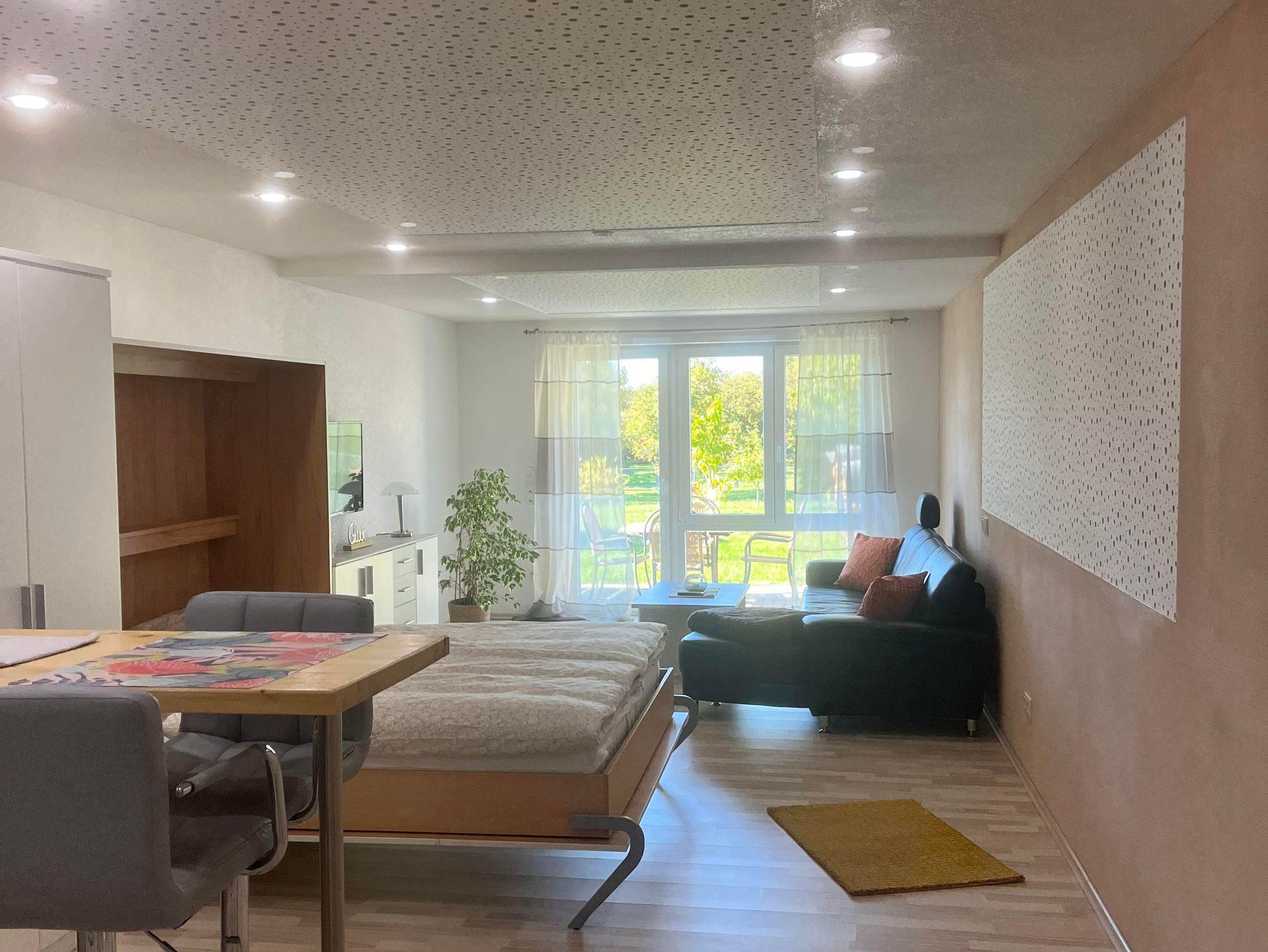 Unsere neue, moderne Ferienwohnung bietet auf ca. 60m2 Platz für 1 bis 2 Personen. Es gibt einen separaten, barrierefreien Eingang im Erdgeschoss. Die Ferienwohnung besteht aus einem großen Raum mit ausgestatteter Küche und Essinsel, Kleiderschrank und Schrankdoppelbett, Wohnzimmer mit einem Fernseher, einem kleinen, aber feinen Badezimmer mit Regendusche, Handtuchheizkörper und Toilette sowie einem Abstellraum. Die Küche ist ausgestattet mit einer Senseokaffeemaschine mit Kaffeepads, Toaster, Wasserkocher, Kühlschrank mit kleinem Gefrierschrank, Ofen mit Backblech, Herdplatte, Geschirr und Besteck, Tassen und weitere Ausstattungen. Die große, möblierte Süd-Terrasse lädt für einen schönen Sonnenuntergang mit Ausblick in Garten und Natur ein.