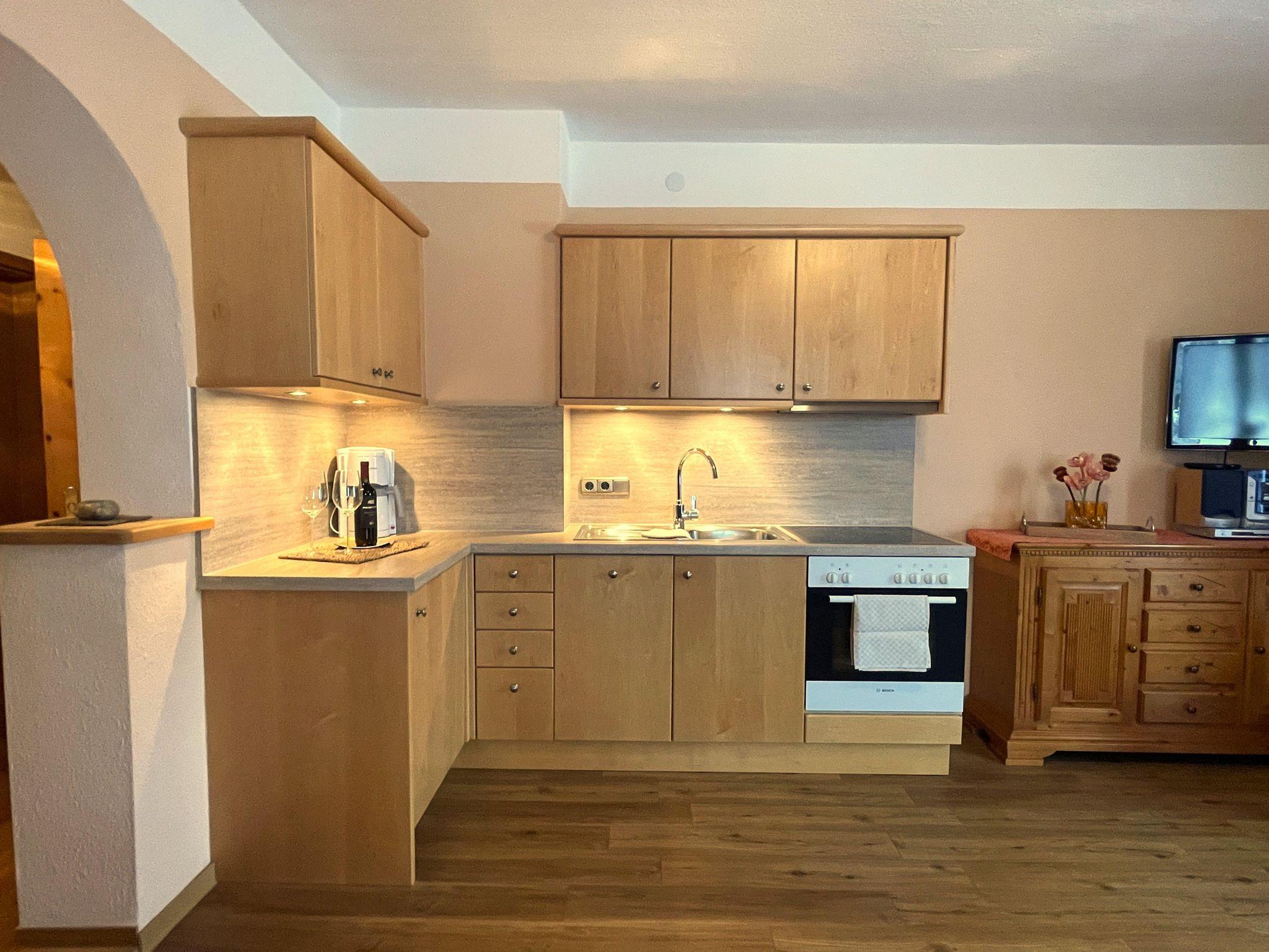 Gemütlich eingerichteter Wohnraum mit Schlafcouch für zwei Personen und Sessel, Eßecke für 4 Personen und voll ausgestattete Küchenzeile.