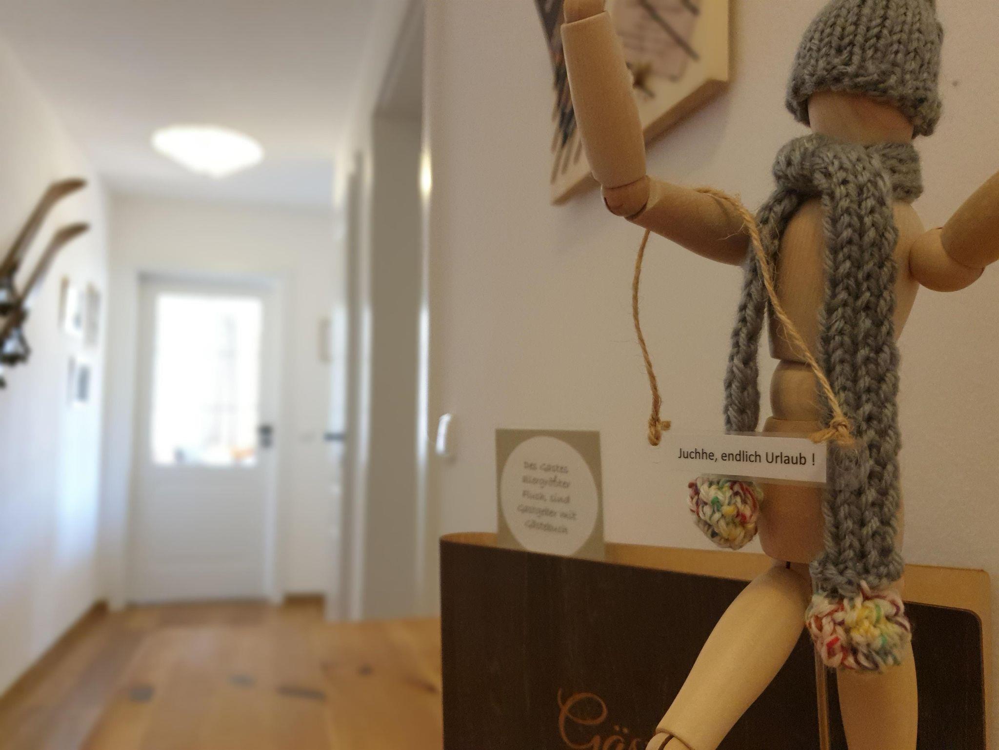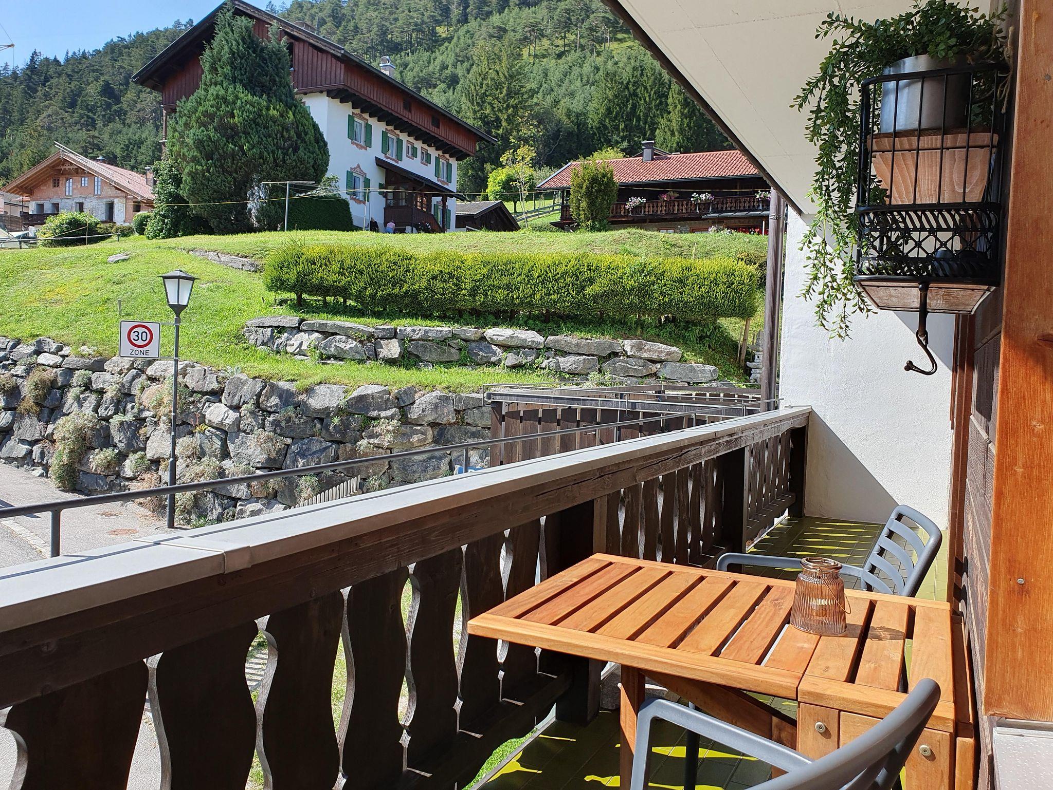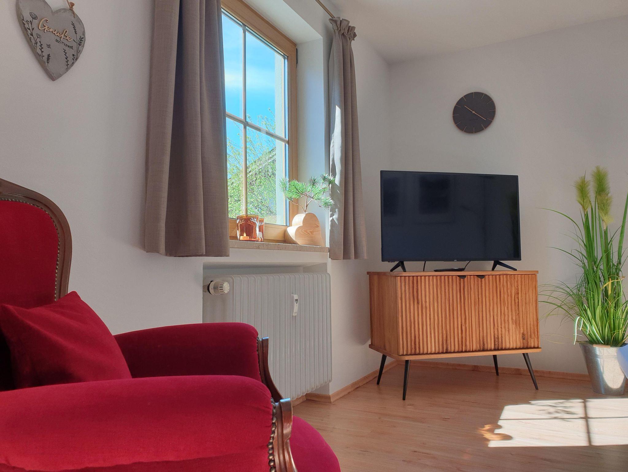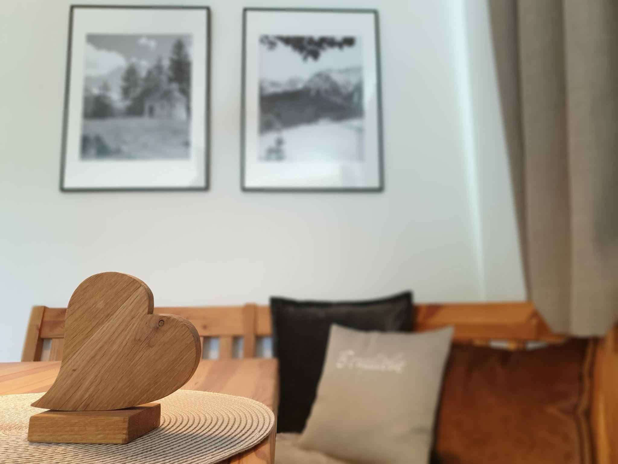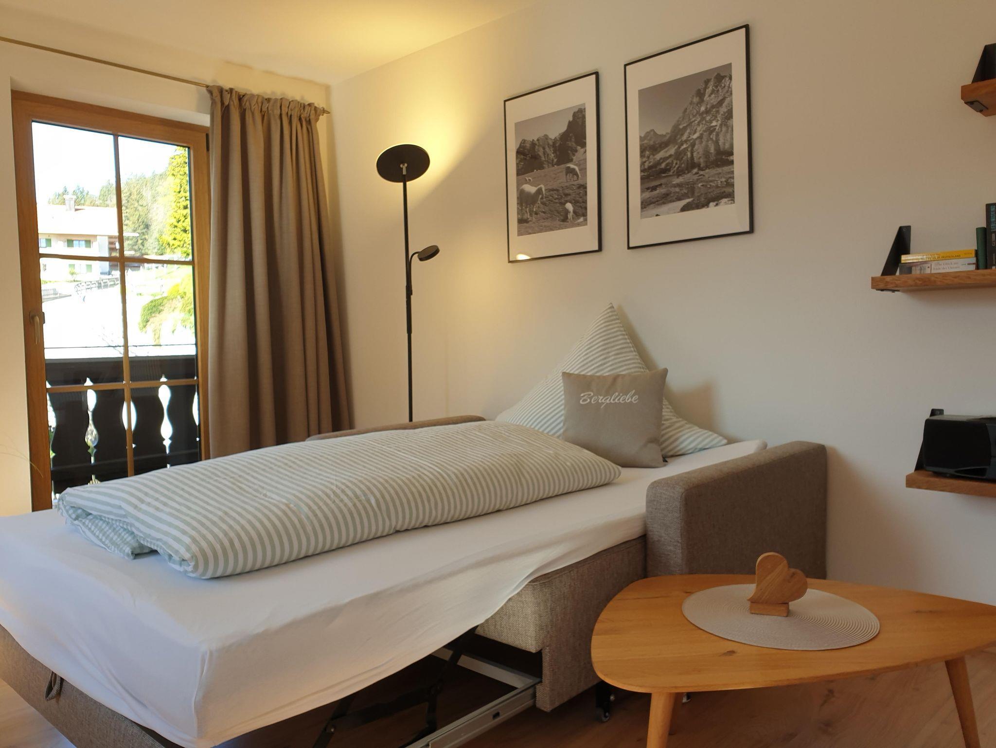 Die frisch renovierte Ferienwohnung Bergliebe im ersten Stock mit ruhigem, möblierten Süd-Westbalkon verfügt über einen großzügigen Wohnraum mit Essecke, bequemem Sofa/Schlafsofa und TV, sowie über ein gemütliches, separates Schlafzimmer mit Zirbenholz-Doppelbett, eine separate komplett ausgestattete Küche und ein modernes Badezimmer mit WC, Waschbecken und Dusche mit tiefem Einstieg. Gratis Waschmaschine und Trockner, sowie PKW-Stellplatze und Garage für Fahrräder und Sportequipment direkt am Haus.
