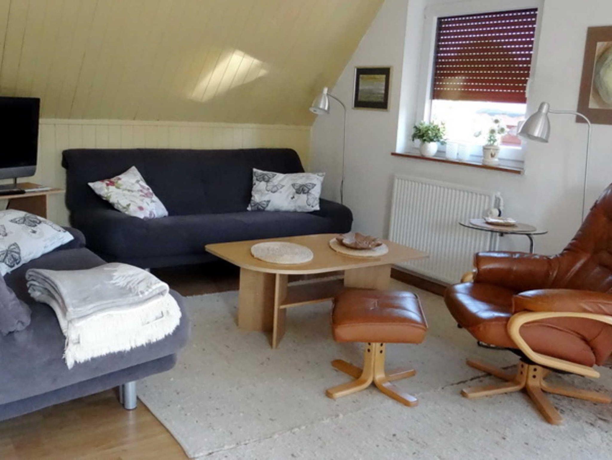 Die gemütliche Ferienwohnung ist ca. 60 qm groß, liegt im Obergeschoss eines Einfamilienhauses und hat eine möblierte Dachterrasse. Die Wohnung besteht aus einem Wohnraum mit Sitz- und Essecke, einer offenen Küche, einem Schlafzimmer mit Doppelbett und einem Wannenbad mit Duschmöglichkeit. Das 2. Schlafzimmer mit zwei Einzelbetten ist über eine Raumspartreppe im Dachgeschoss erreichbar - für Kleinkinder nicht geeignet. Die Wohnung ist gemütlich und sauber und die Gastgeberin sehr freundlich. Im Mietpreis inklusive sind Bettwäsche, Handtücher und die Energiekosten, die Endreinigung wird mit einer Pauschale gesondert berechnet.