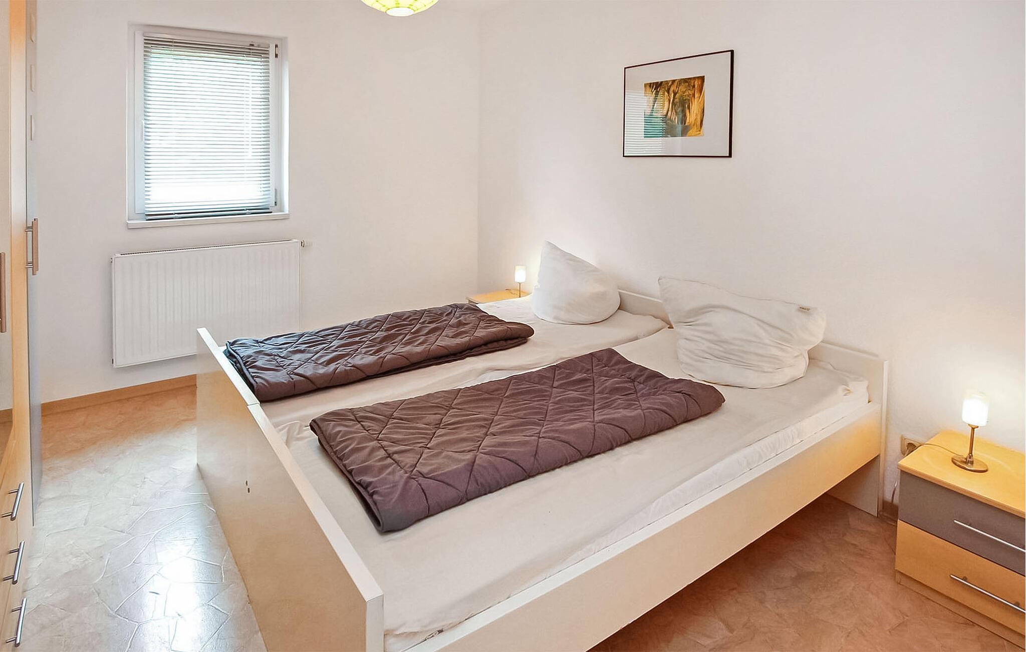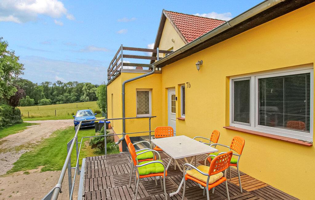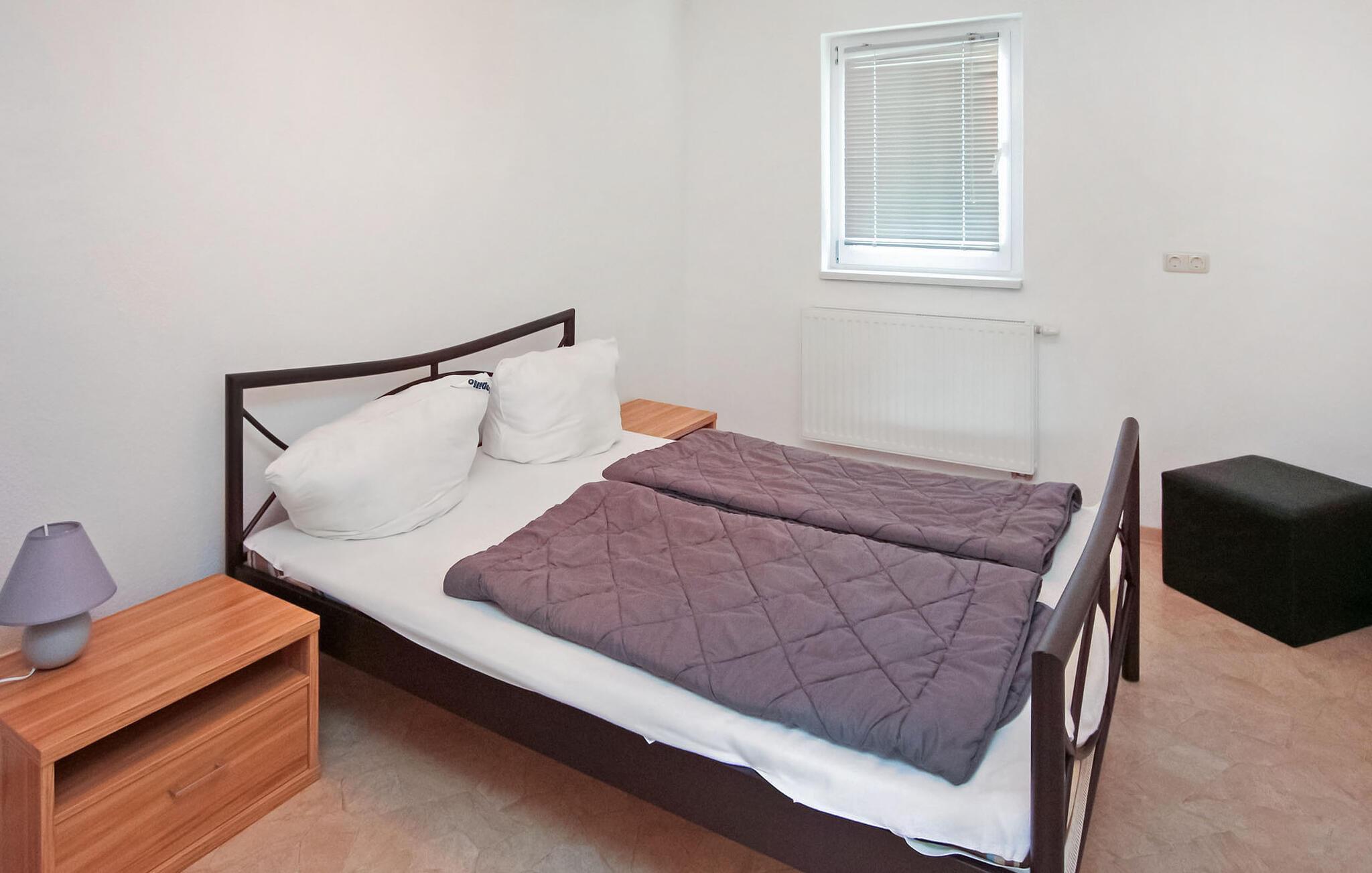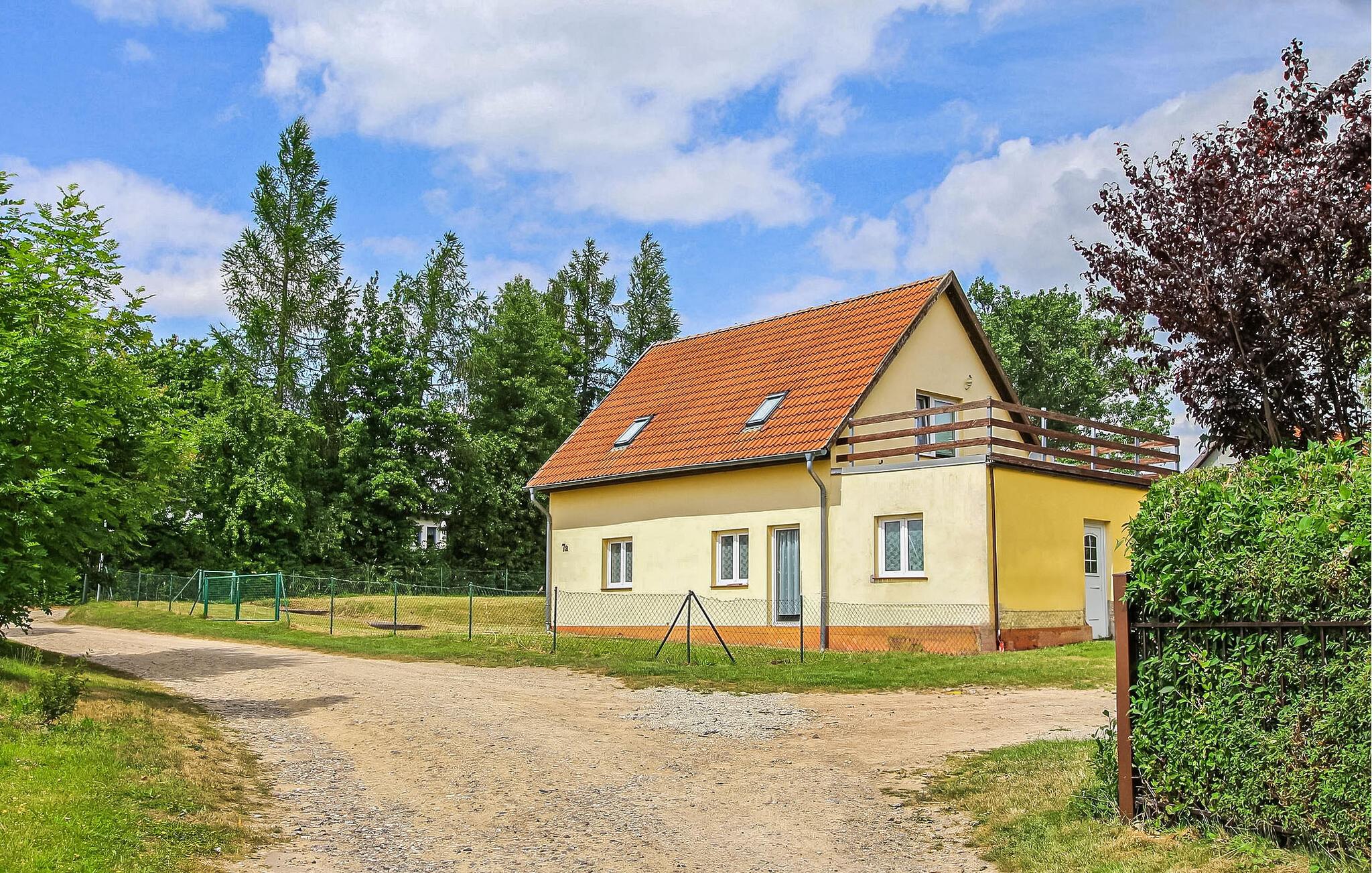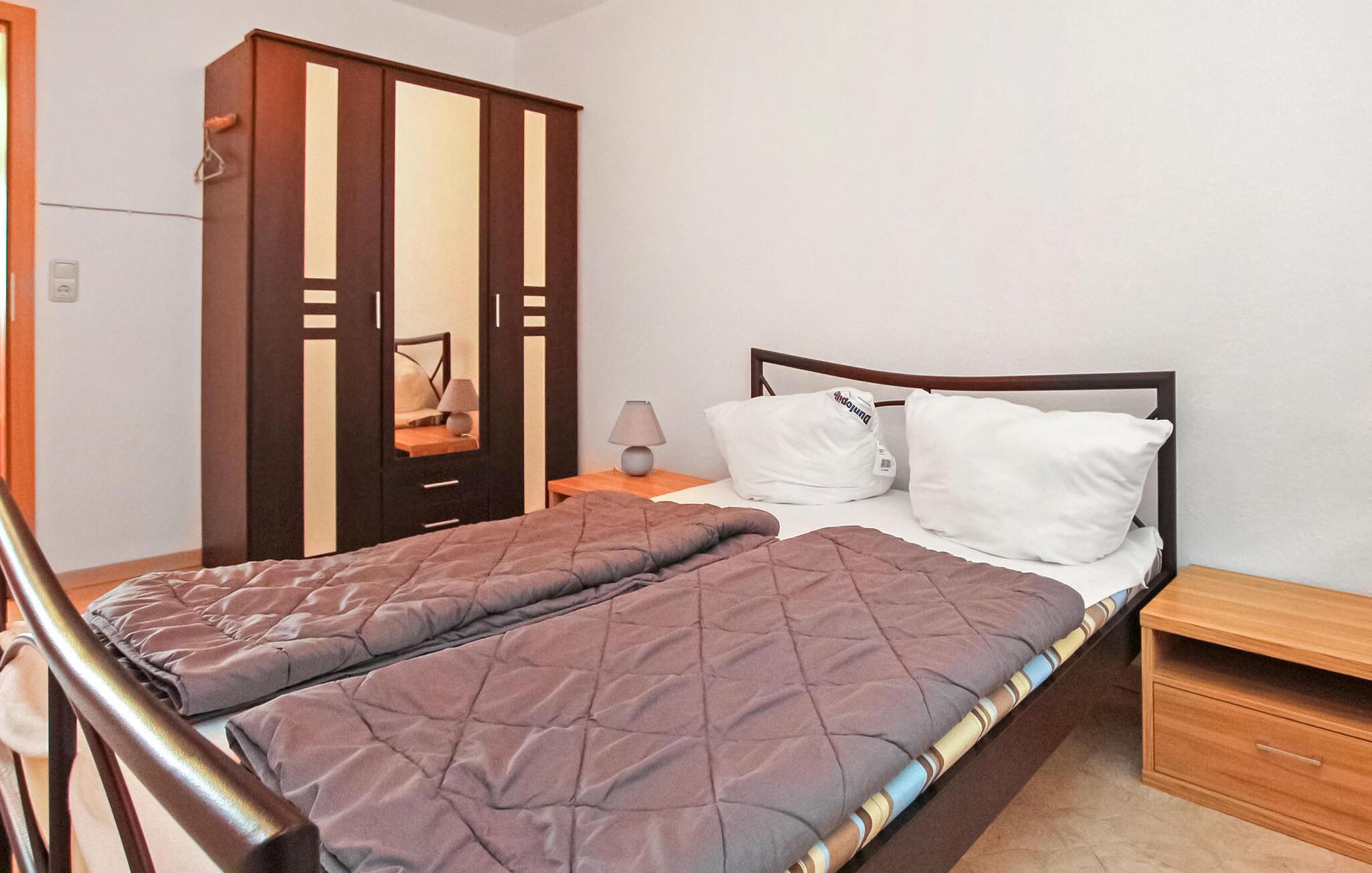 "Kun få skridt væk og inden for synsvidde af Großer Kressiensee med dens smukke badeområde ligger der to ferielejligheder på en særskilt grund på ca. 700 kvadratmeter i forreste del af et rækkehus. Der er yderligere ferieboliger. i den bagerste del af huset Dette er en af ??to ikke-ryger lejligheder med separat indgang (hvoraf den ene er via en udvendig trappe), er centralt opvarmet, har insektnet på vinduerne, en stue med spiseplads. et fuldt udstyret køkken, to soveværelser, badeværelse med bruser/toilet og en terrasse eller balkon Parkeringsplads, en grill, en barneseng og en høj stol på forespørgsel og en robåd på forespørgsel. Den samlede pris inkluderer slutrengøring, sengelinned og håndklæder samt vand- og energiforbrug.