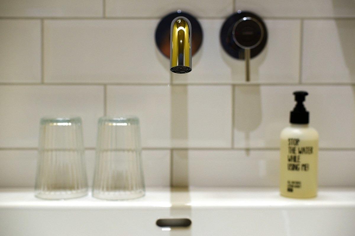 Das alles kombiniert (oder besser: komponiert) mit einer Sandsteinwand, nüchternem Estrich, wohnlicher Seekiefer und einem kräftigen Farbtupfer. Schlicht und schön und: einfach wunderbar.