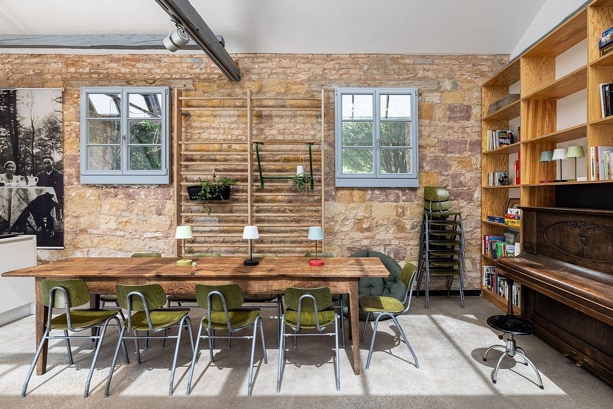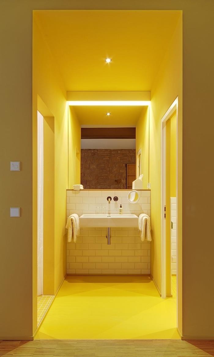 a) Sandsteinwand mit sonnengelbem Küchen-Bad-Block (1903)
